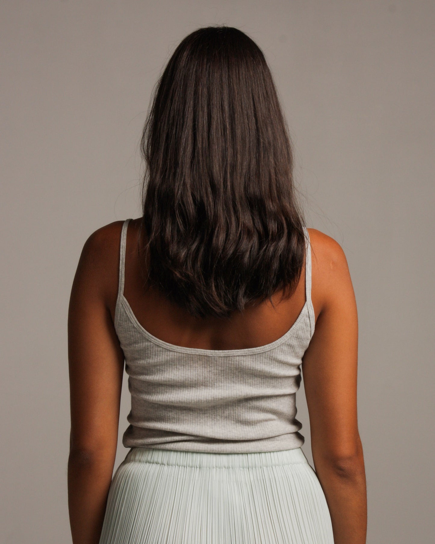 Simple tank top by Baserange in grey melange. Classic fitted tank with a bound neckline, crafted in ribbed organic cotton jersey. Thin shoulder straps with a low back for comfortable casual wear.