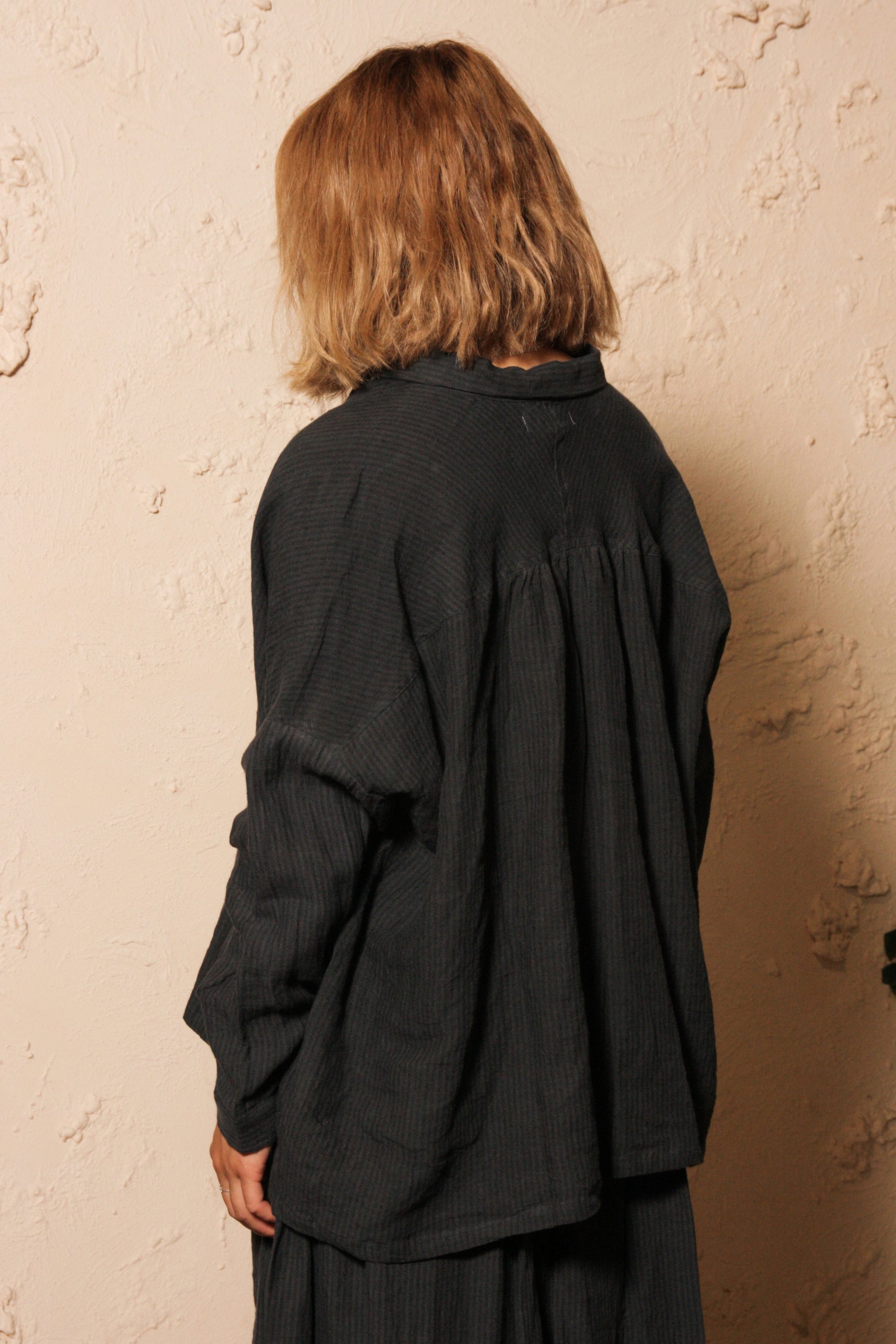 Relaxed cut shirt by Japanese brand Ichi Antiquites in black striped linen fabric. Features drop sleeves, button cuffs, small collar and button down front.