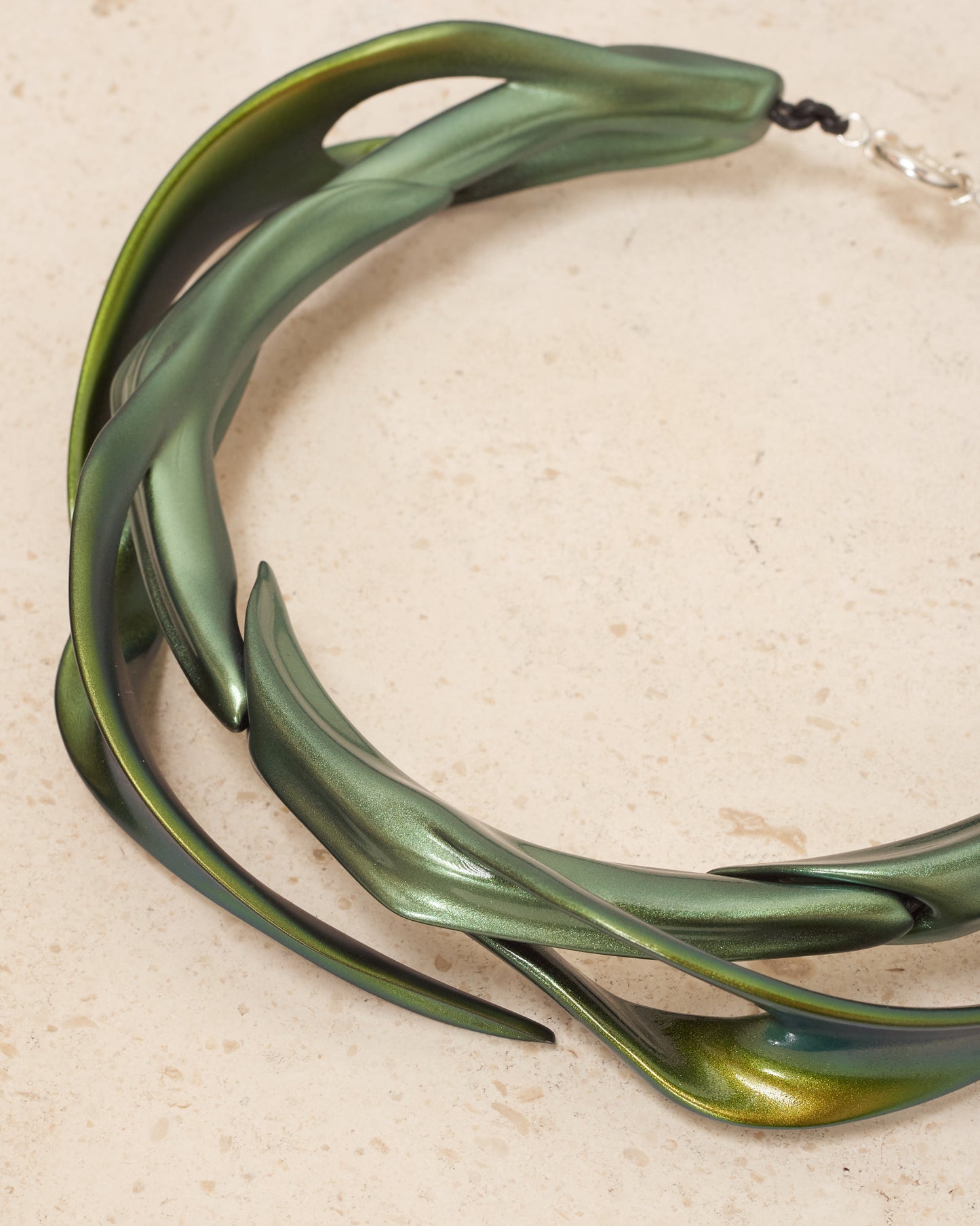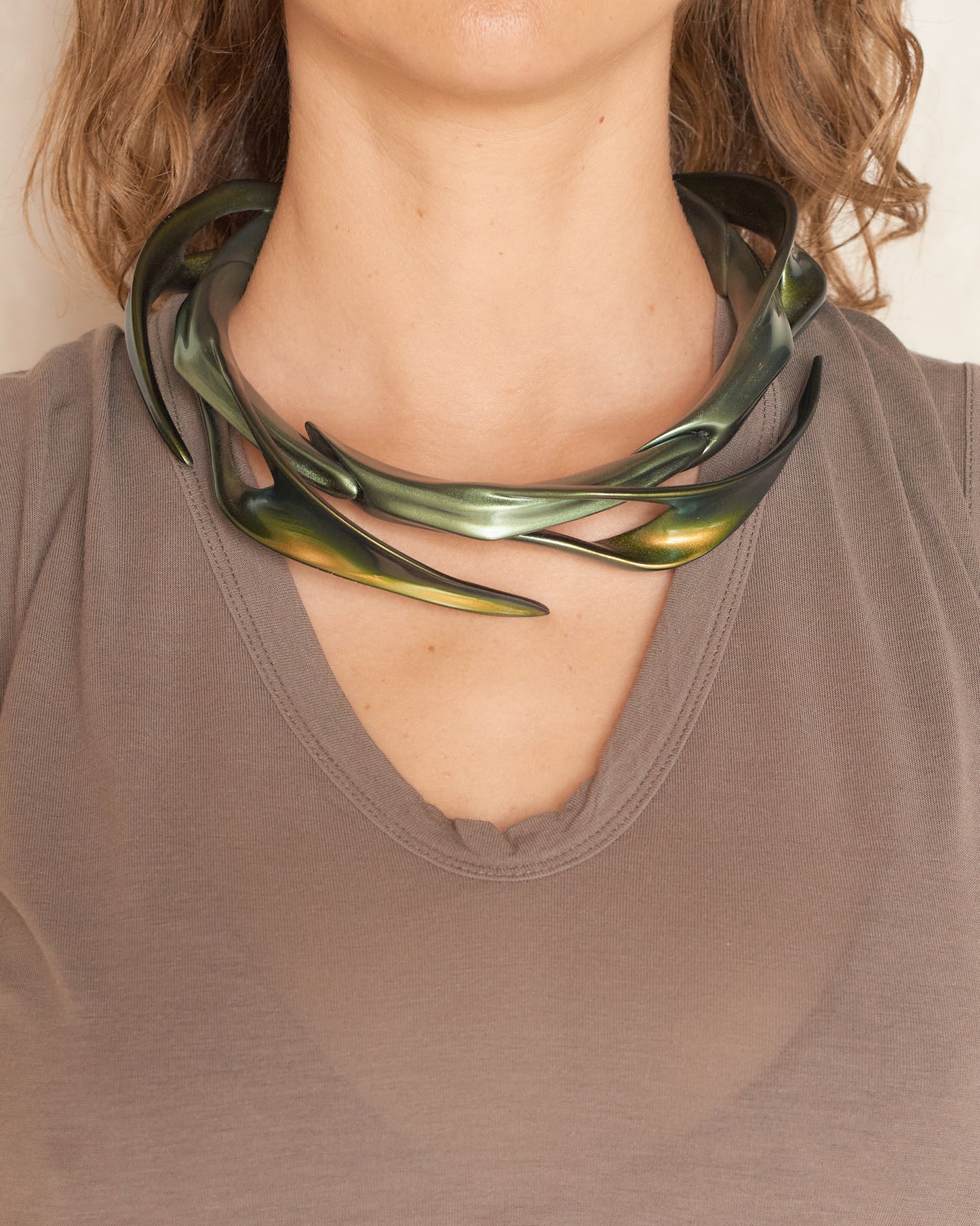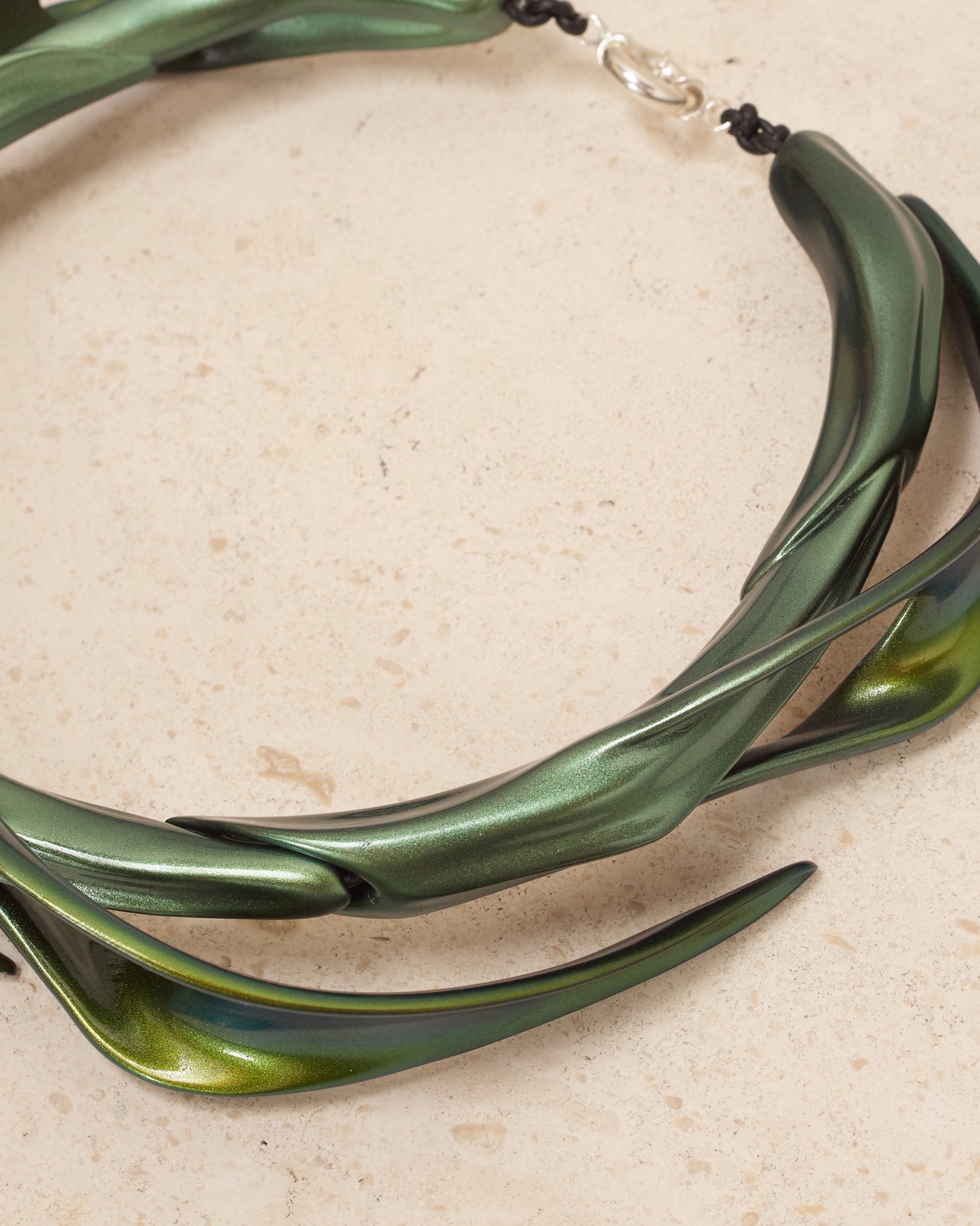 Tendon necklace by Jack Caddy in olive green. Local Perth artist and designer Jack Caddy presents an intriguing collection of other-worldly jewellery for Dilettante. Each sinuous piece is created digitally before being 3D printed in tough resin, refined and painted by hand, and reskinned in bright colour shifting paints.
