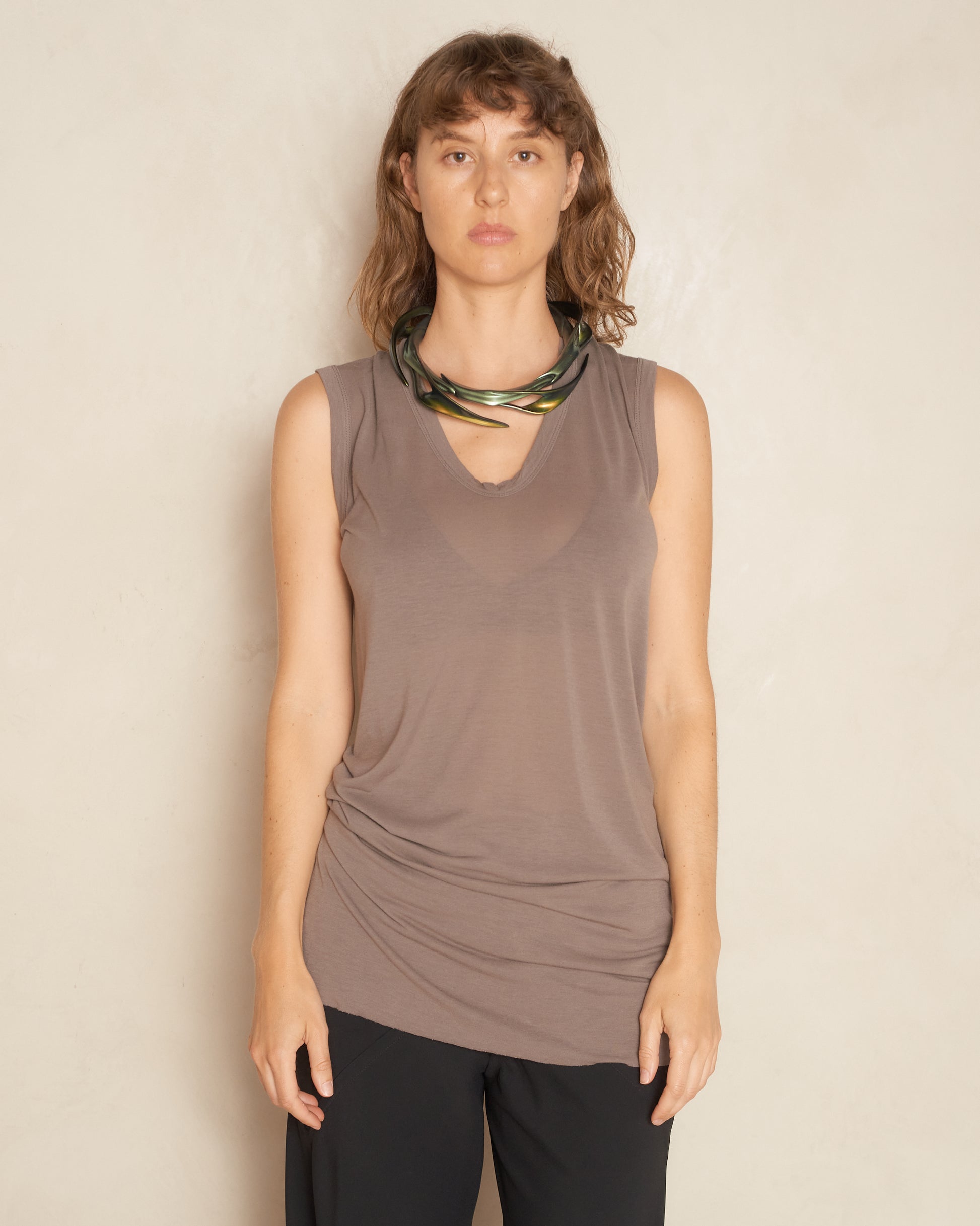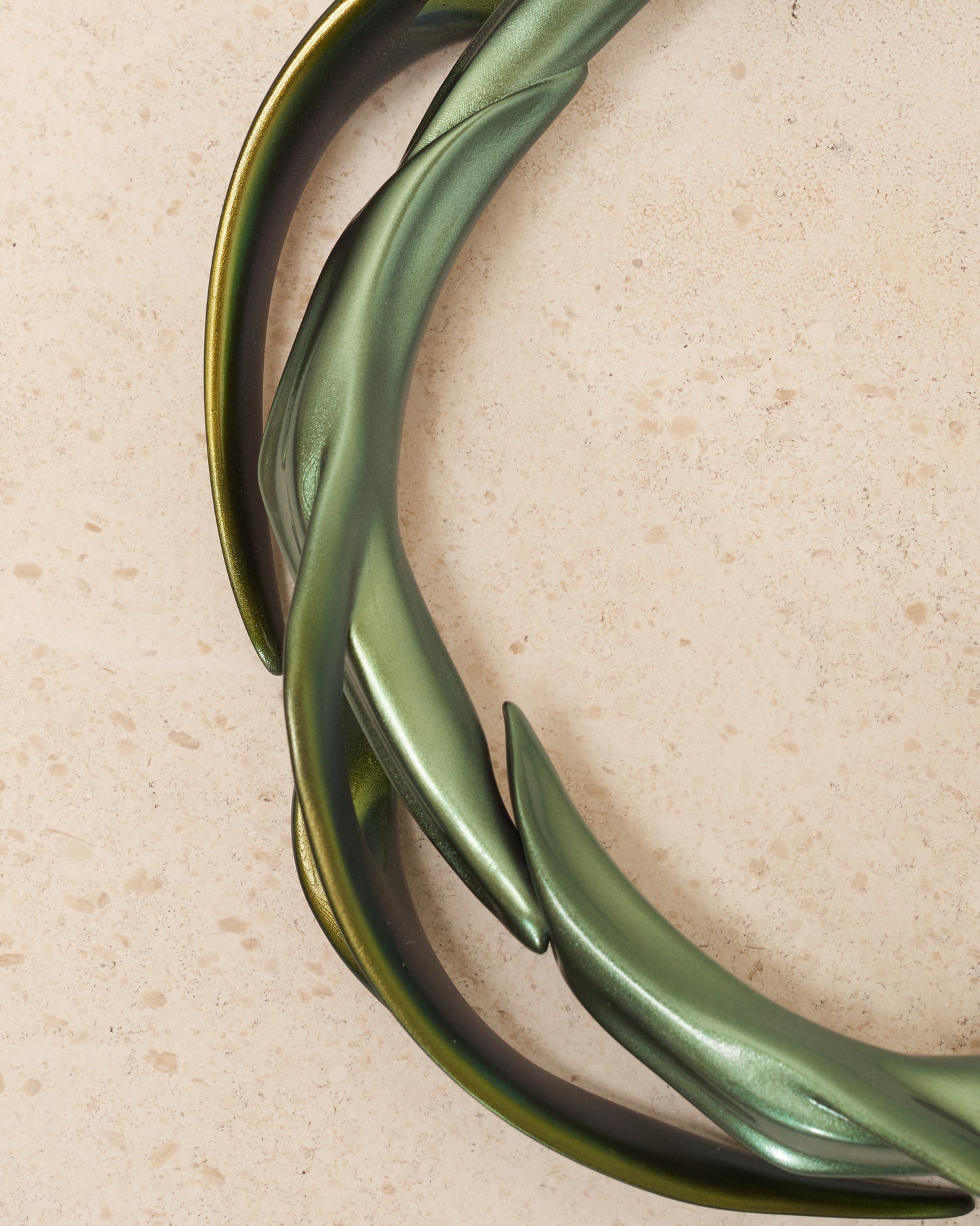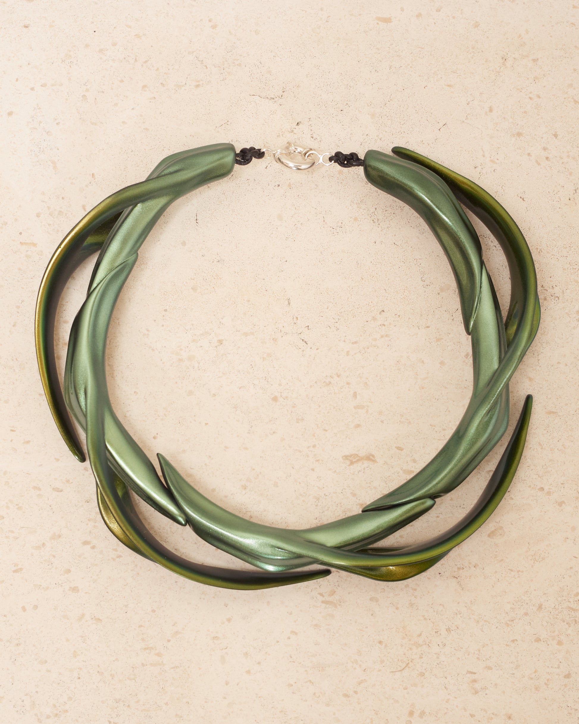 Tendon necklace by Jack Caddy in olive green. Local Perth artist and designer Jack Caddy presents an intriguing collection of other-worldly jewellery for Dilettante. Each sinuous piece is created digitally before being 3D printed in tough resin, refined and painted by hand, and reskinned in bright colour shifting paints.