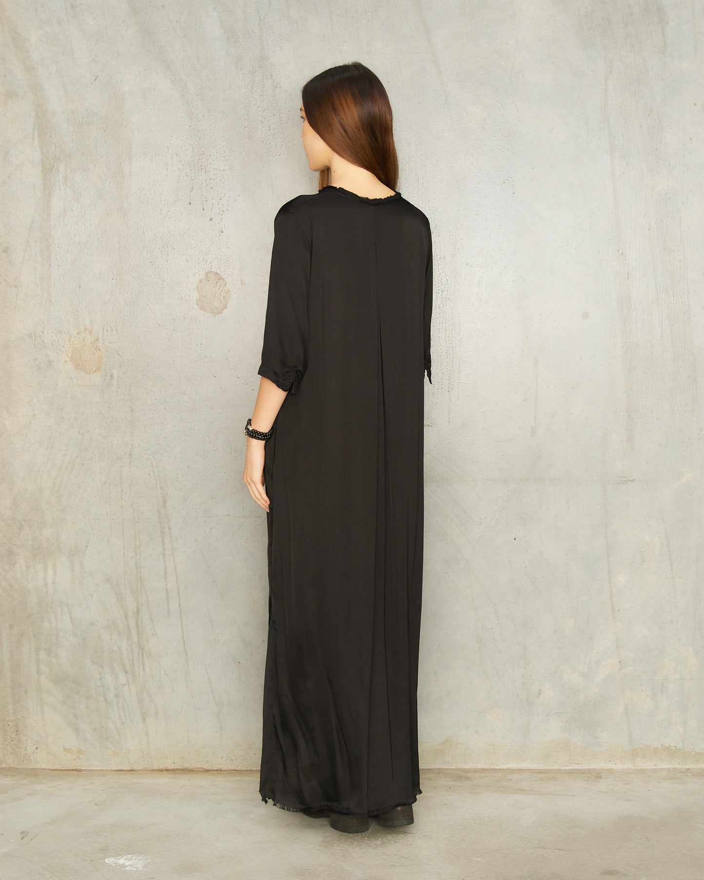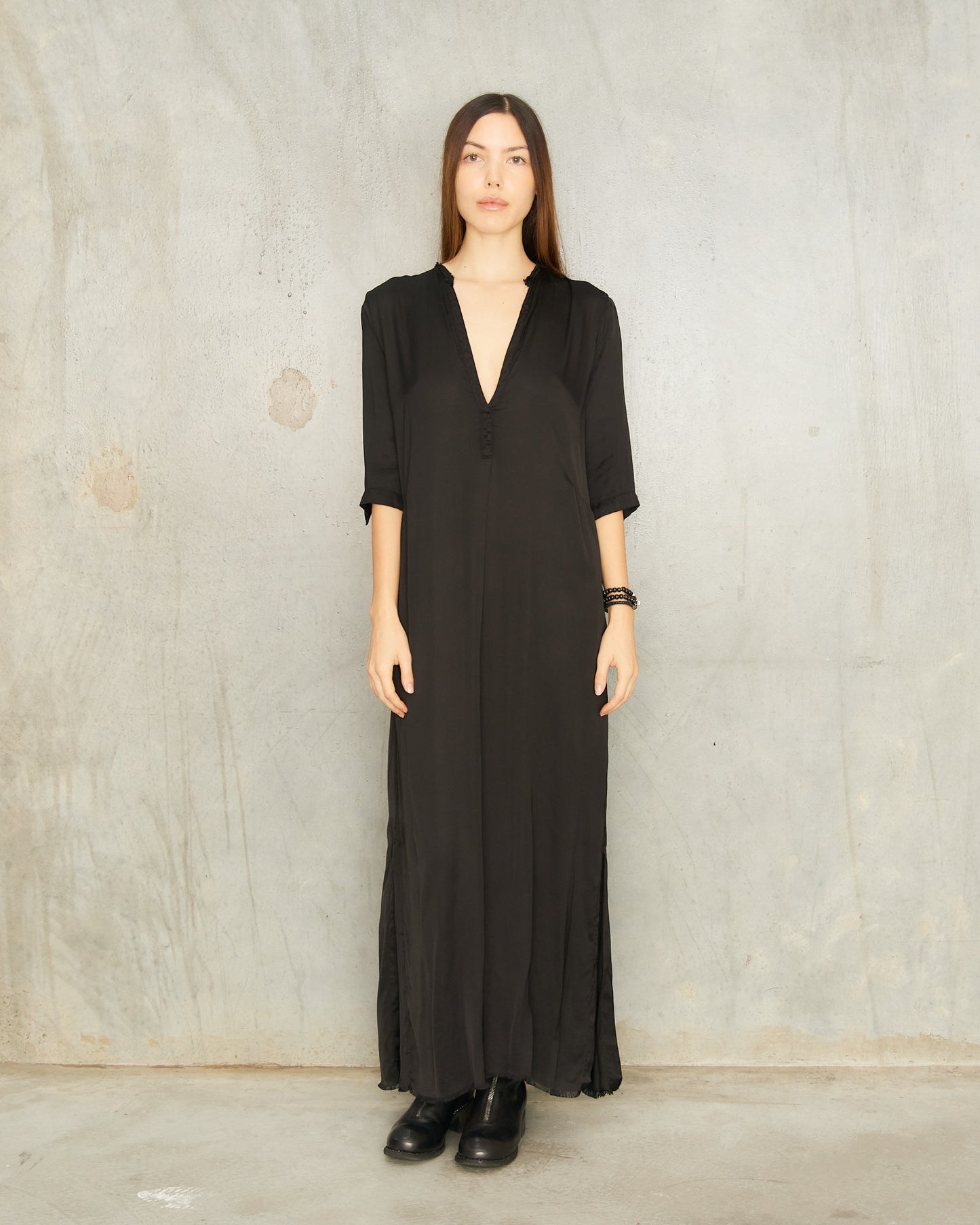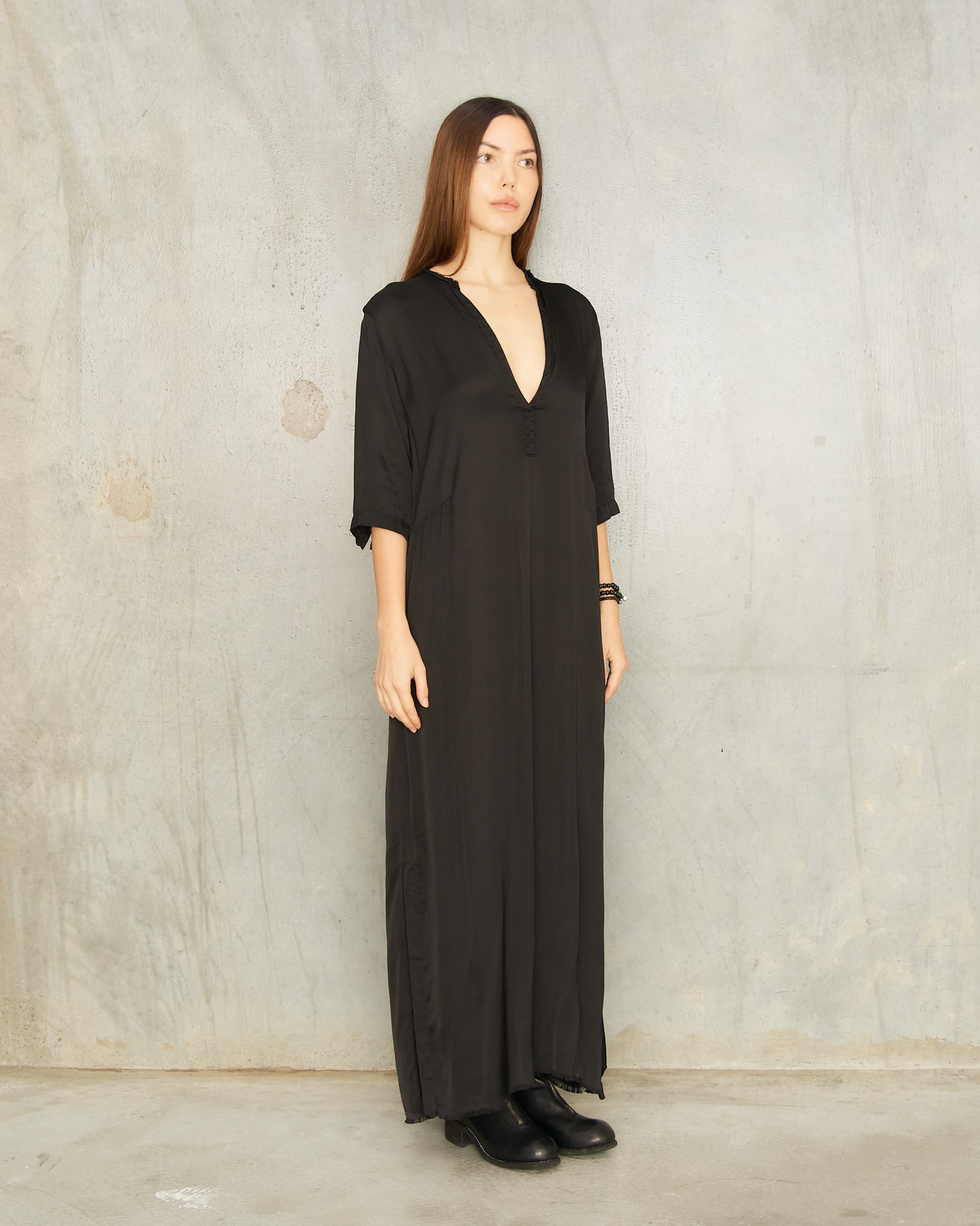 Alla dress by Jaga in black. Long tunic dress featuring a deep V-neckline and half sleeves. Darting at the waist enhances the relaxed fit, flowing into a wide, draped hem for a wonderfully balanced silhouette.