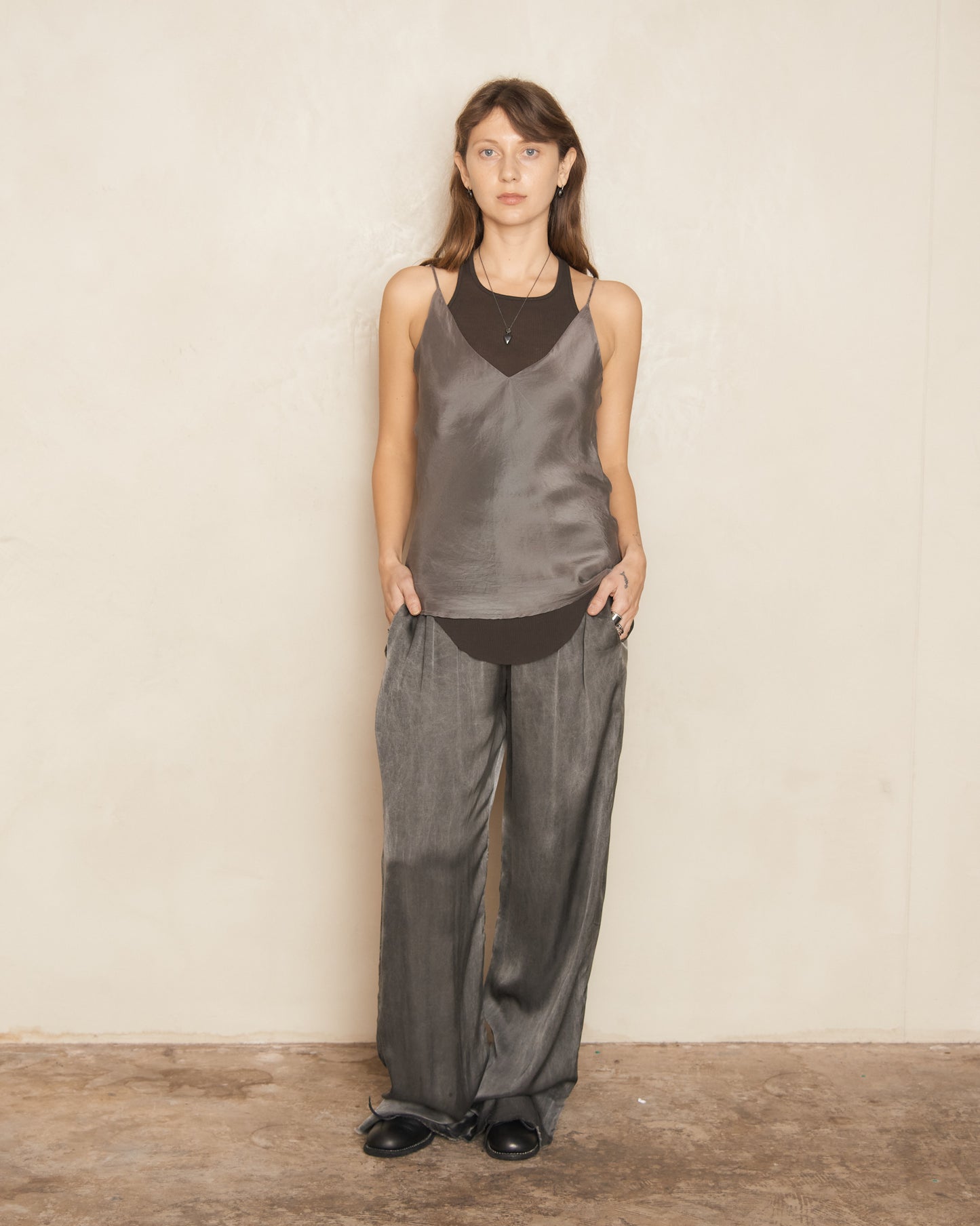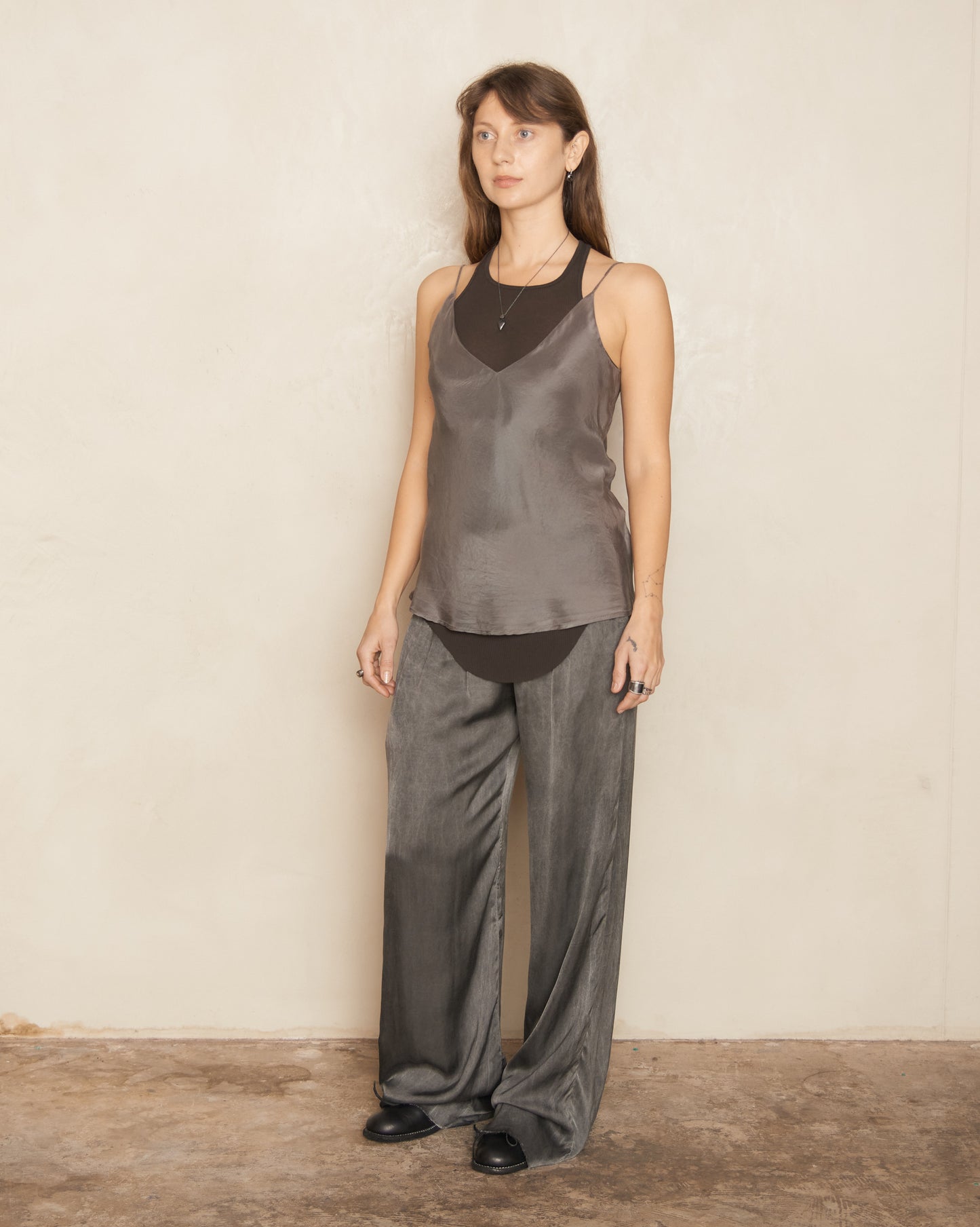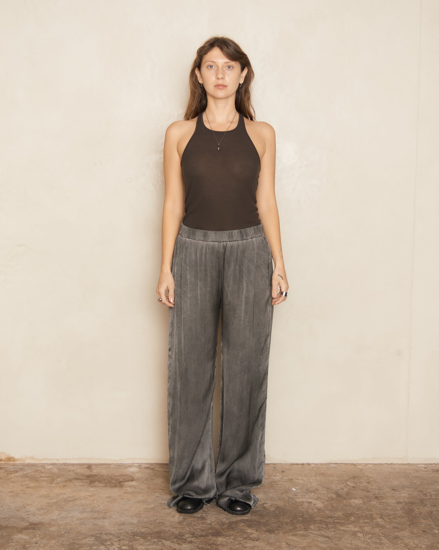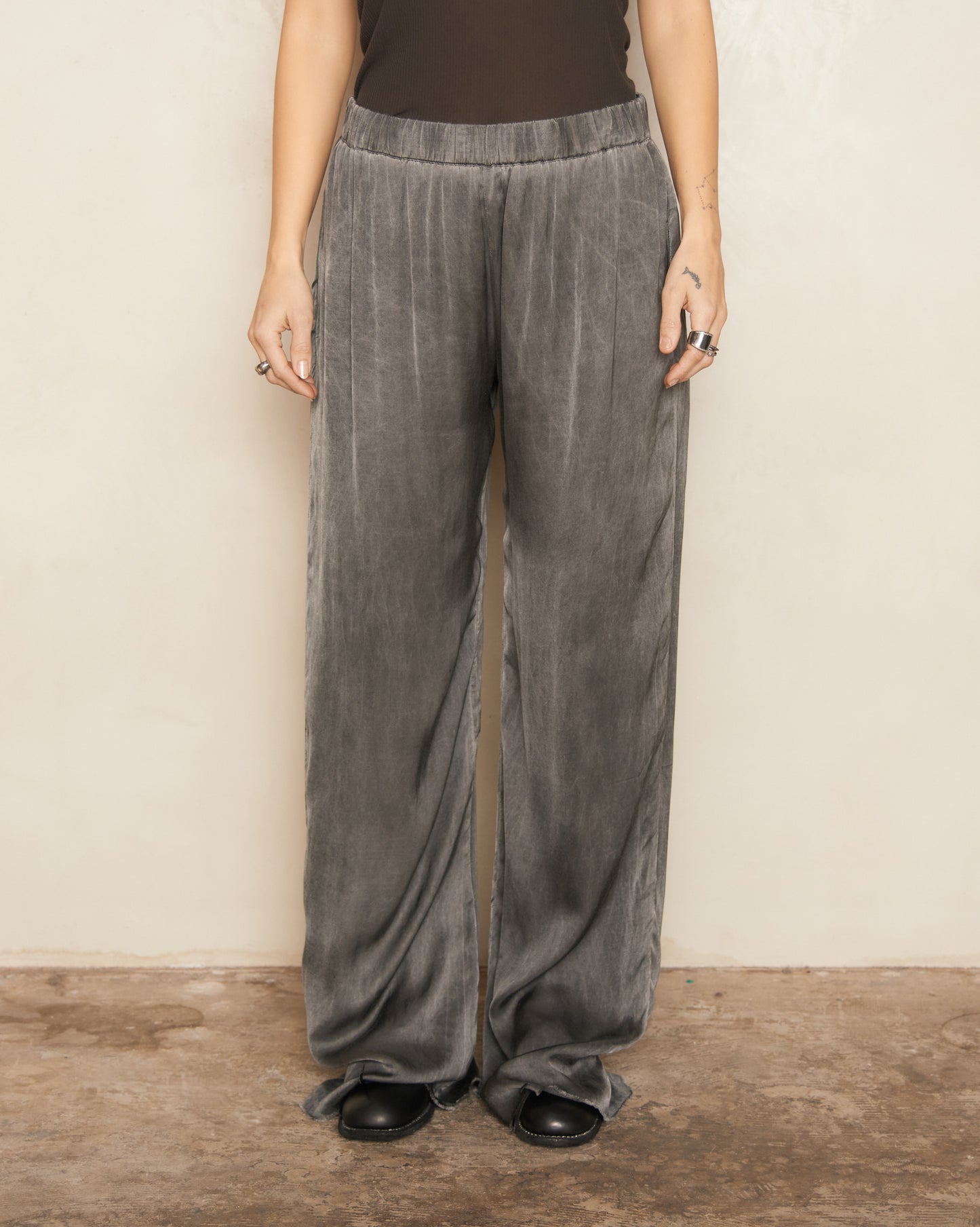 Meloni pants by Jaga in distressed grey. Simply handcrafted relaxed pants in fine lightweight satin. Subtle gathering around the elastic waistband adds an additional rippled effect to the draped fabric. Distressed dyeing adds a distinctive lived-in look.