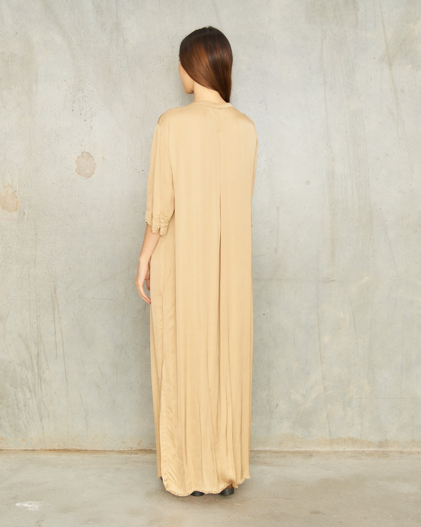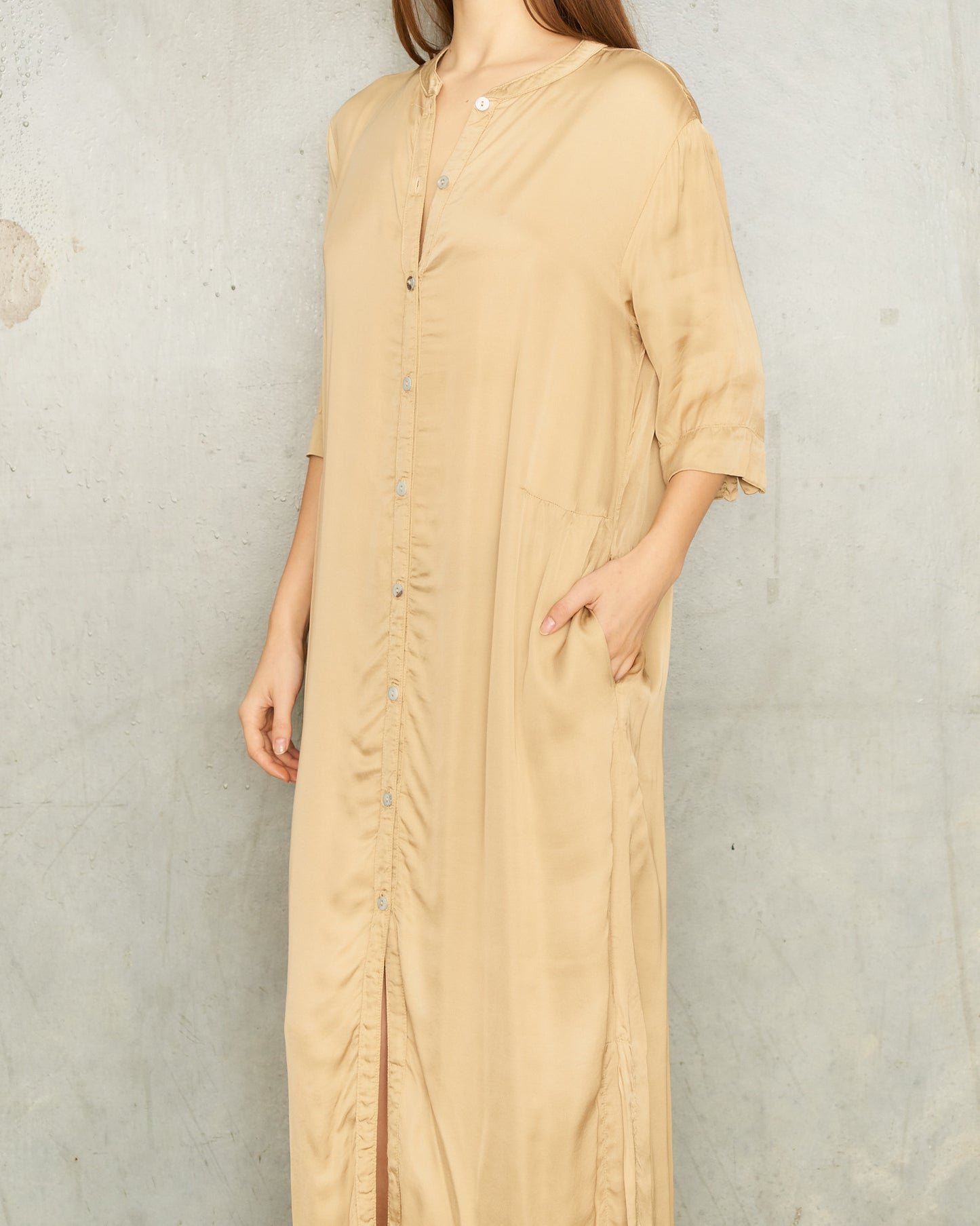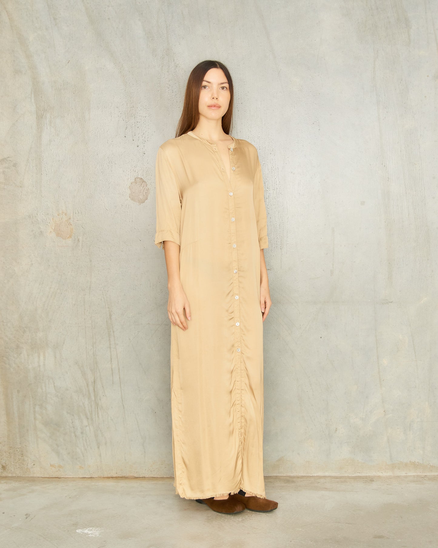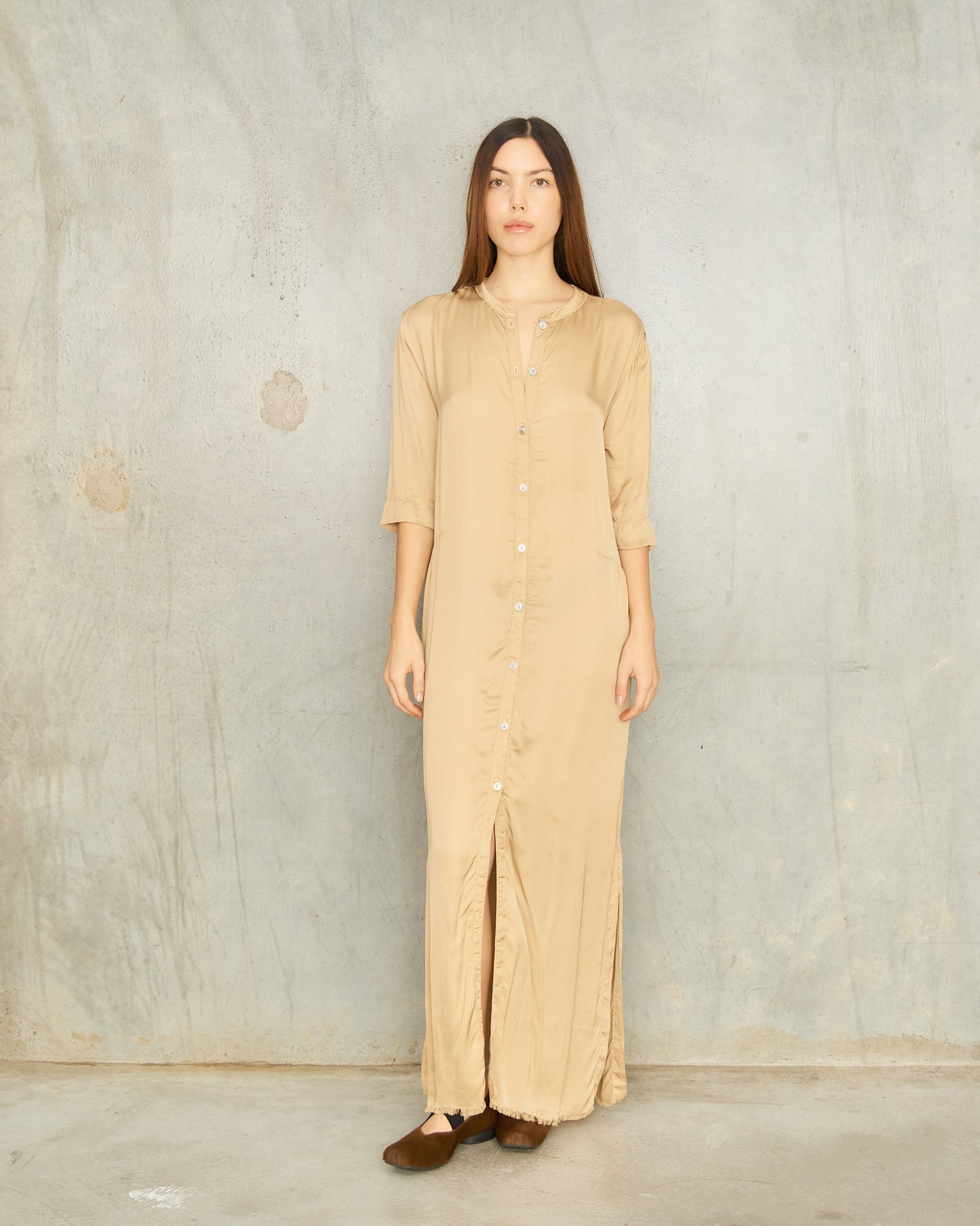 Marrakesh dress by Jaga in gold. Round-neck dress in lightweight, billowing satin with half sleeves. Full-length buttoning adds a prominent feature, offering versatile styling options. Signature raw frayed detailing at the hemline enhances this ethereal silhouette.