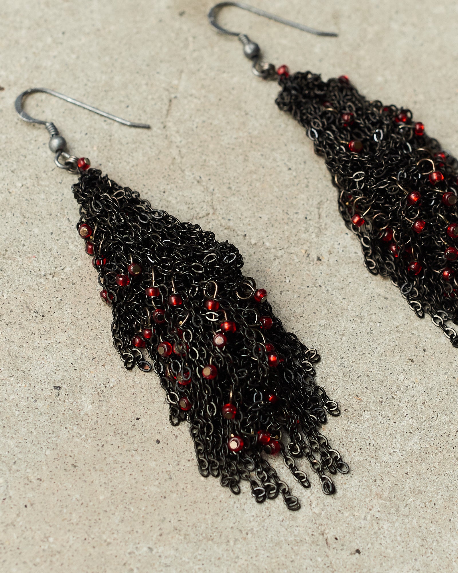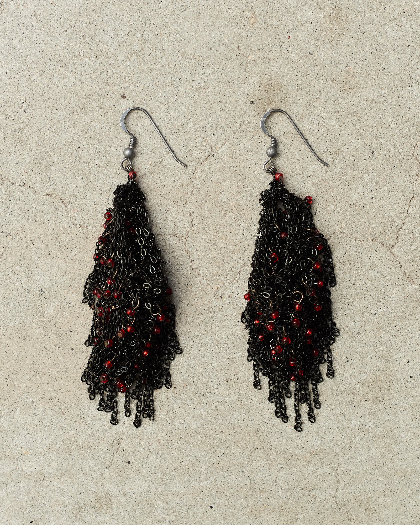 Jet chain earrings by Jean-François Mimilla with poppy beads. Clusters of tiny red glass beads thread along darkened black chain links, hanging dramatically from minimalist hook fastenings.