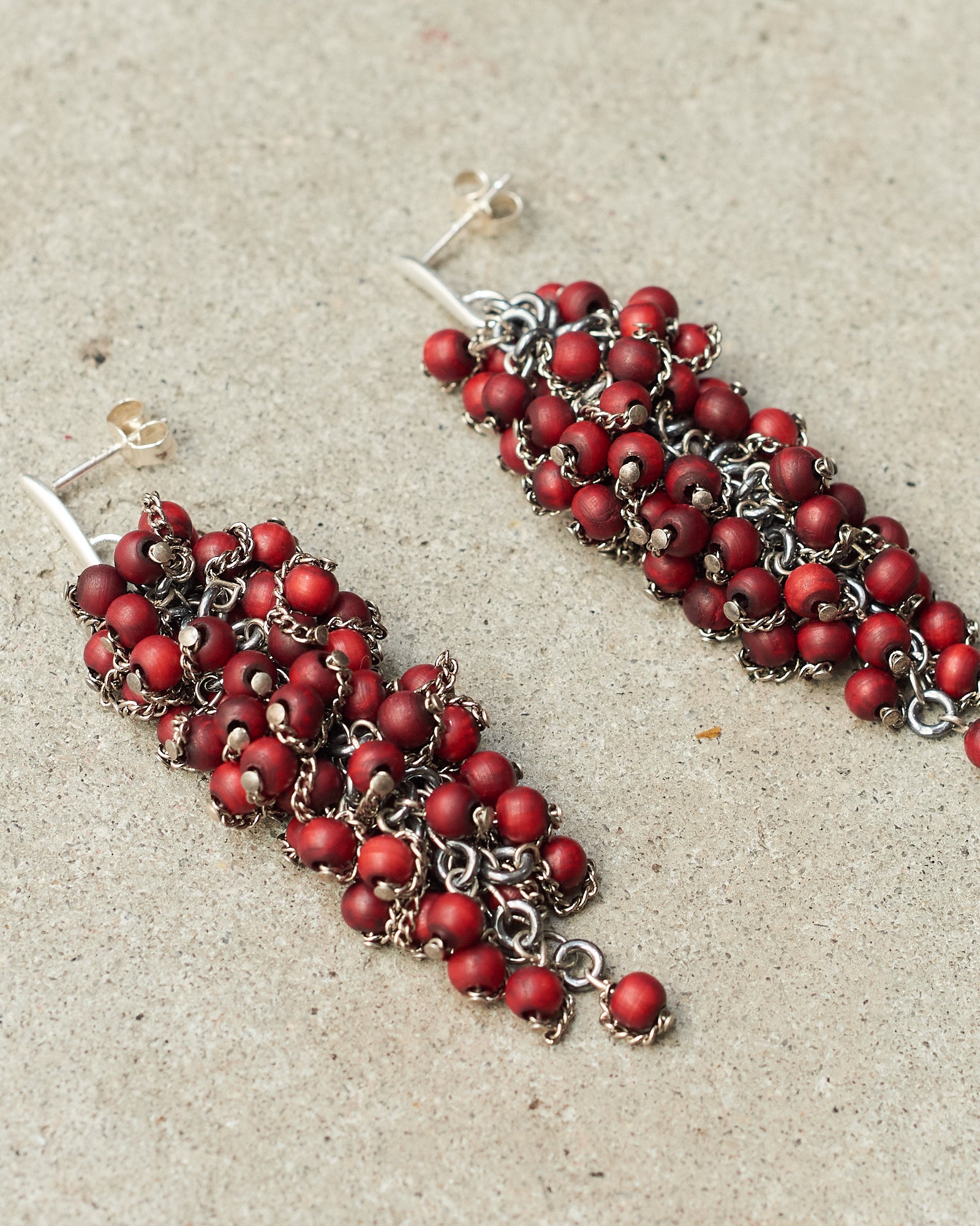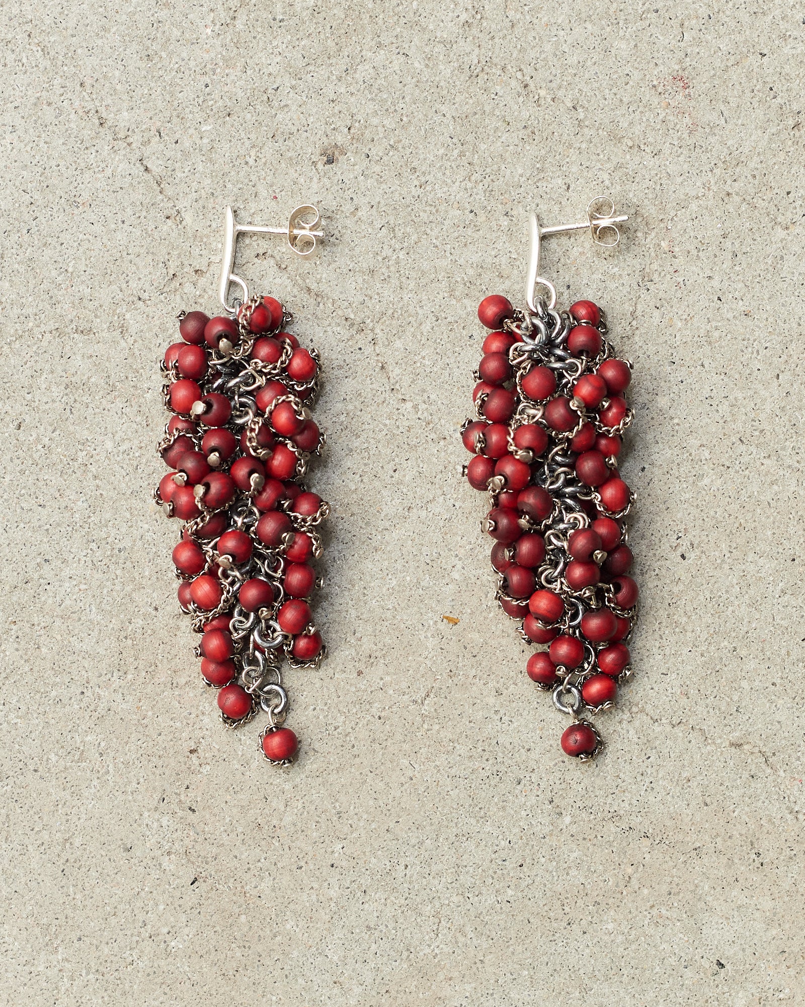 Knitted bead earrings by Jean-François Mimilla. Small clusters of poppy beads knitted along chainlinks drop earrings suspended from post backings.