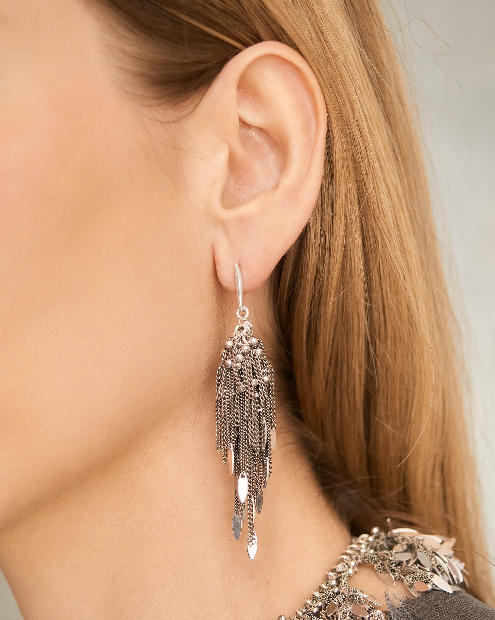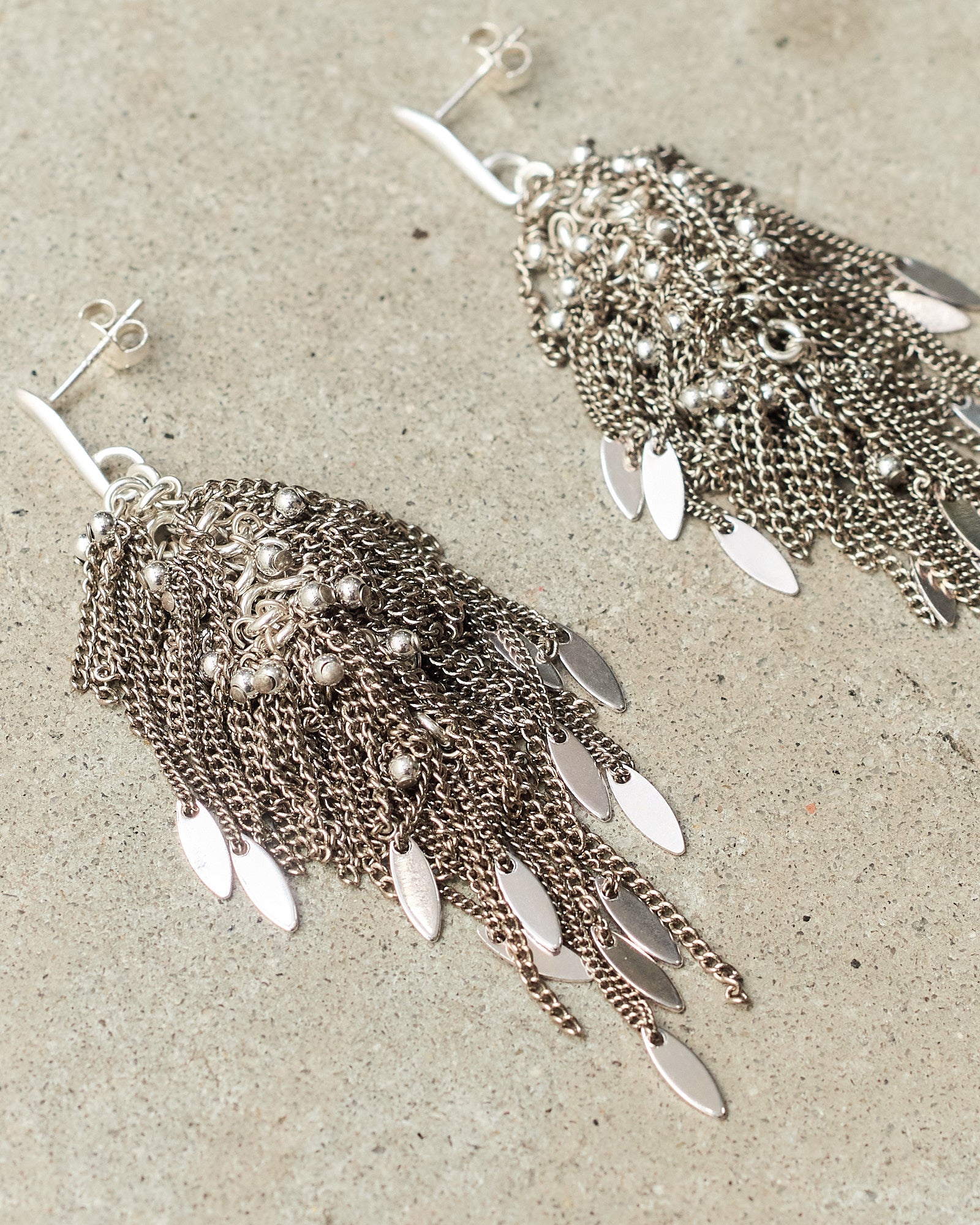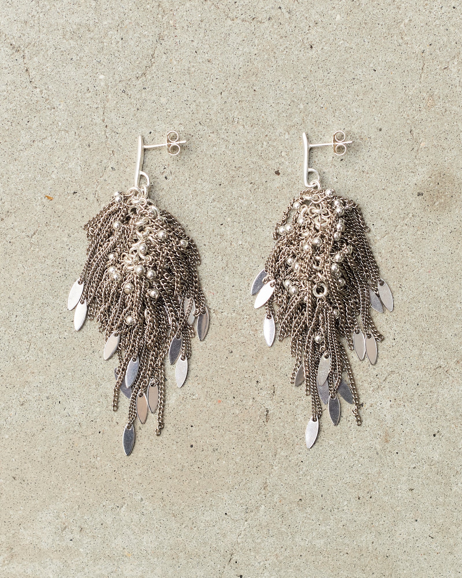 Frayed petal earrings by Marc Le Bihan in silver. Delicate silver petals cascade in a tangled cluster from fine chain links, hanging gracefully from simple post backings.