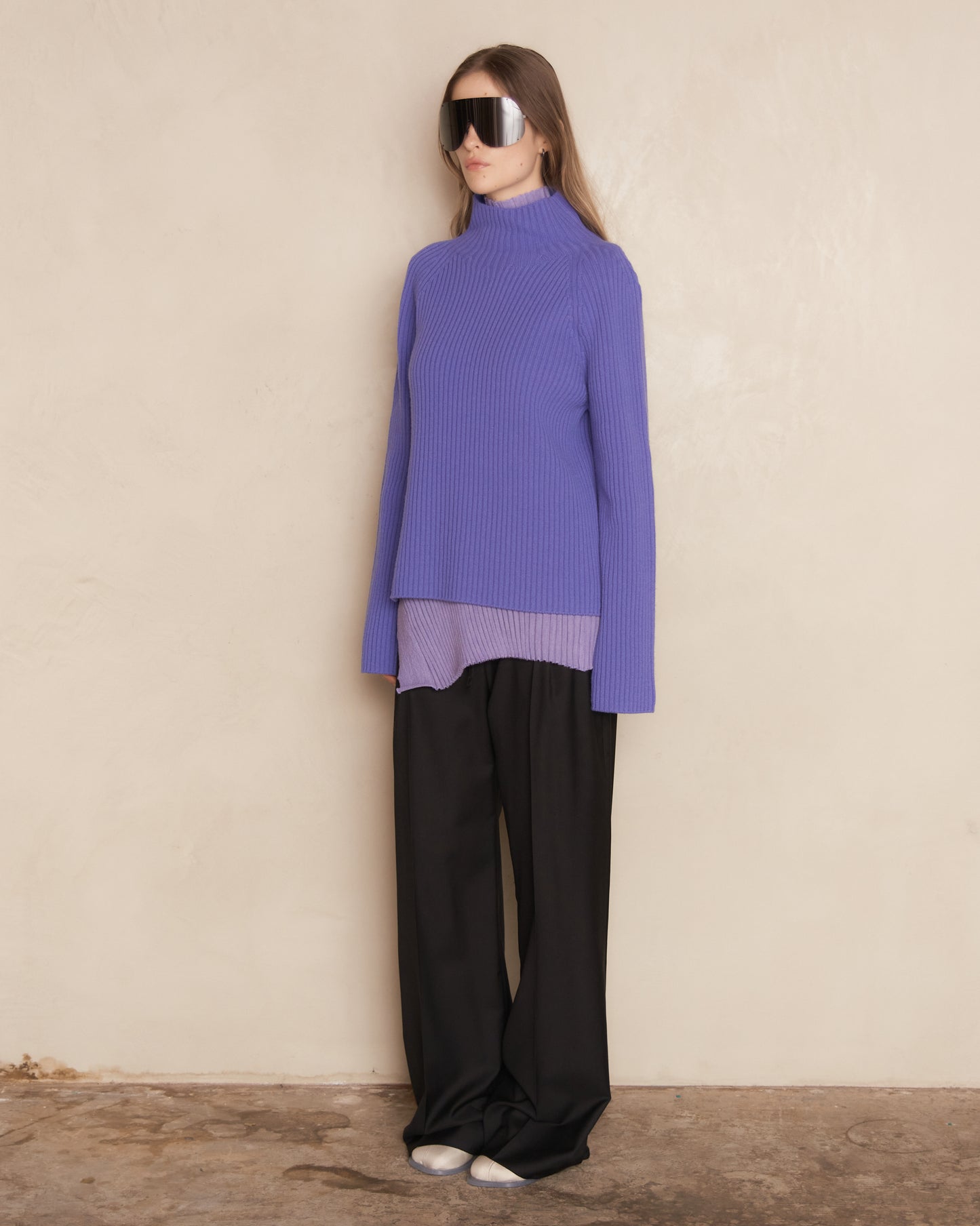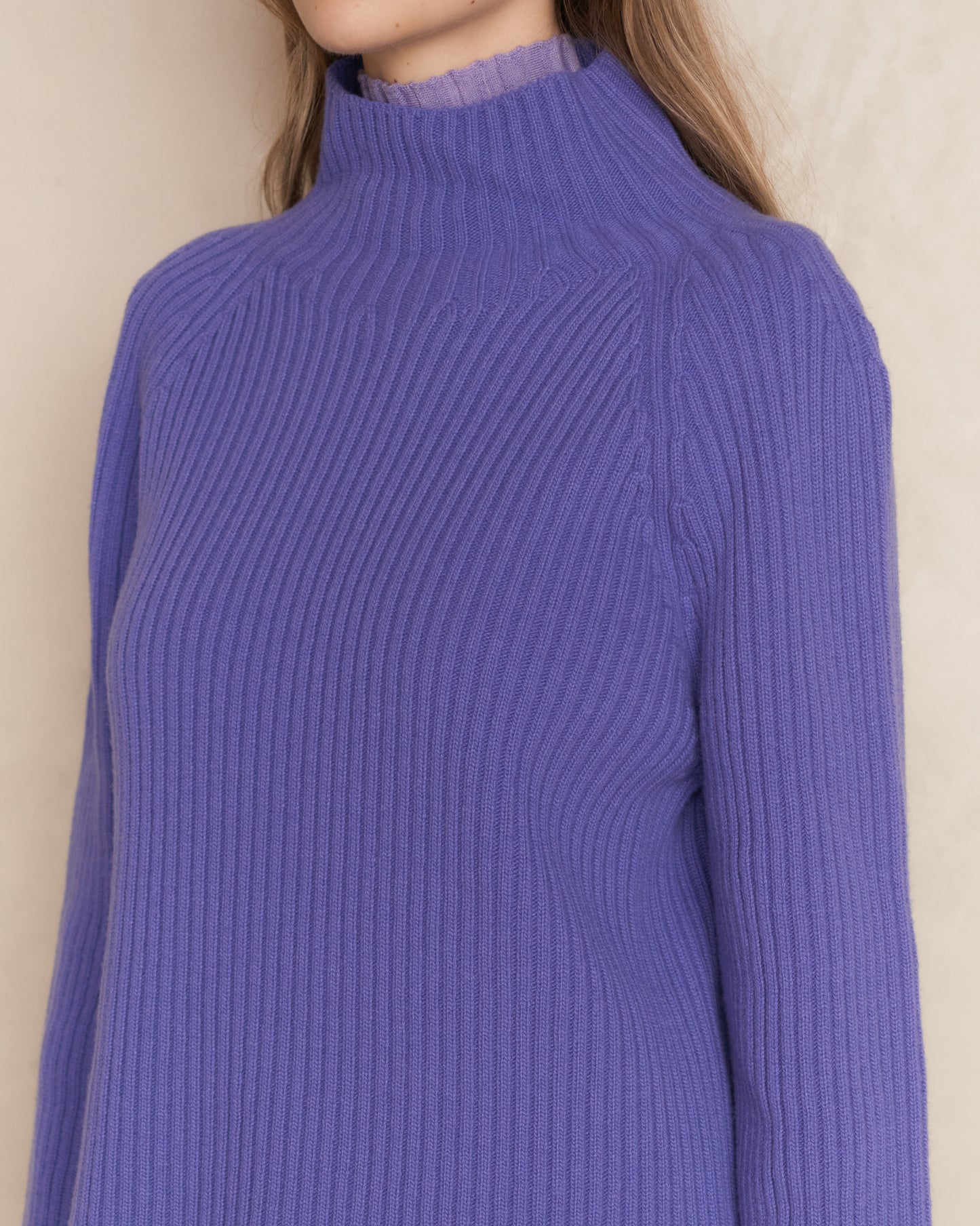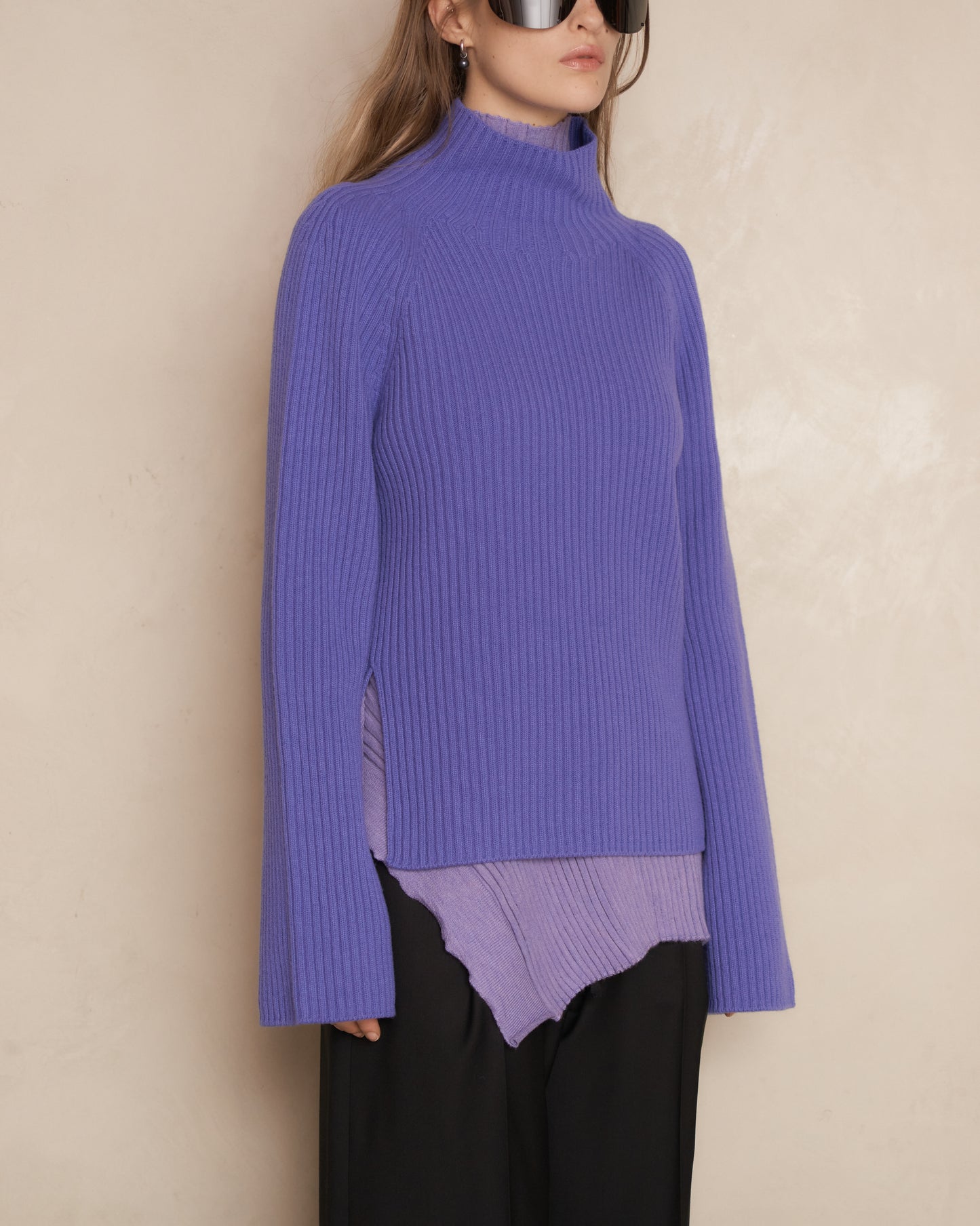 Kanonia sweater by Christian Wijnants in anemone purple. Seamless whole garment ribbed knit sweater with structured turtleneck. Long sleeves finish with a slight flare, complementing the casual fit and side slits.
