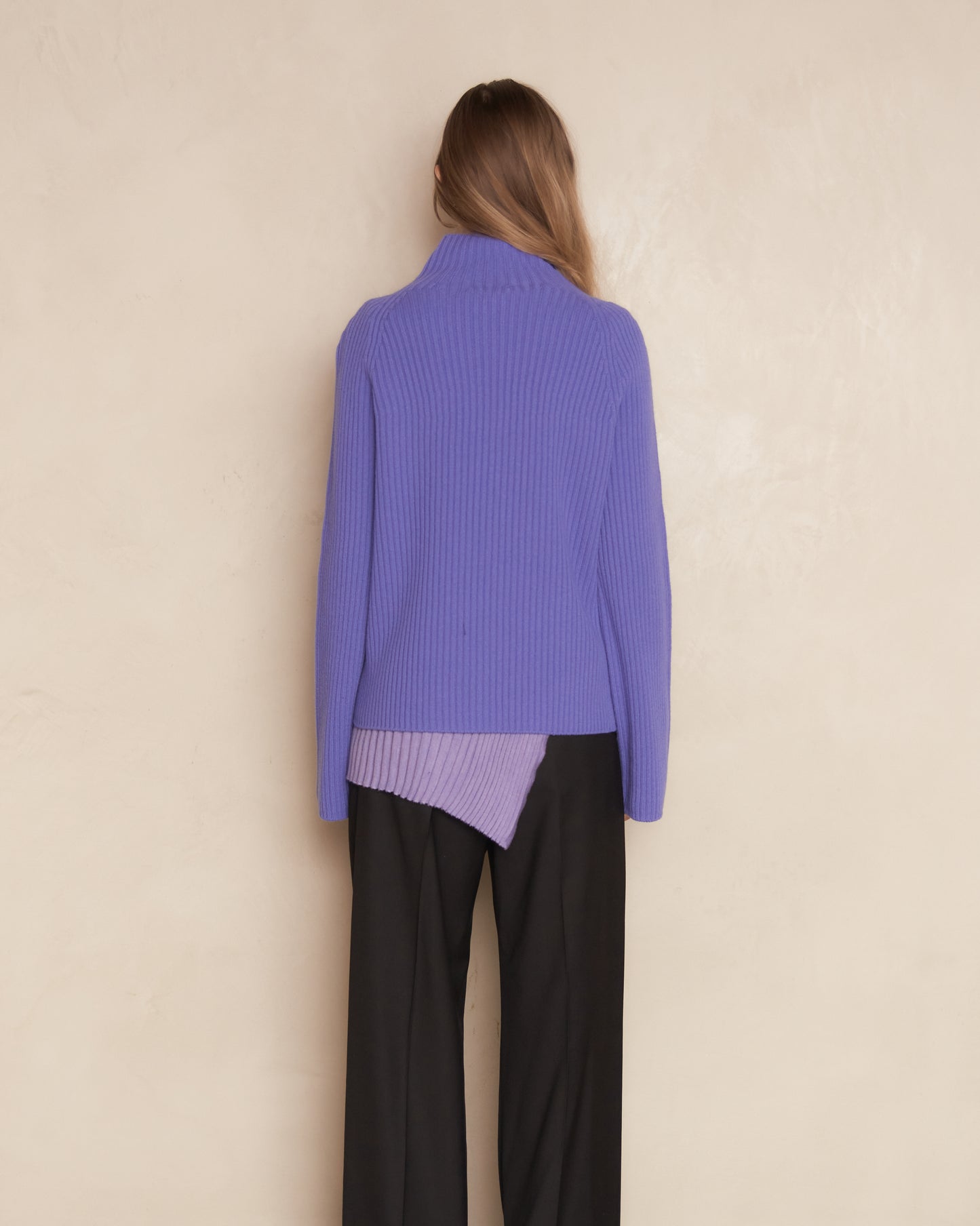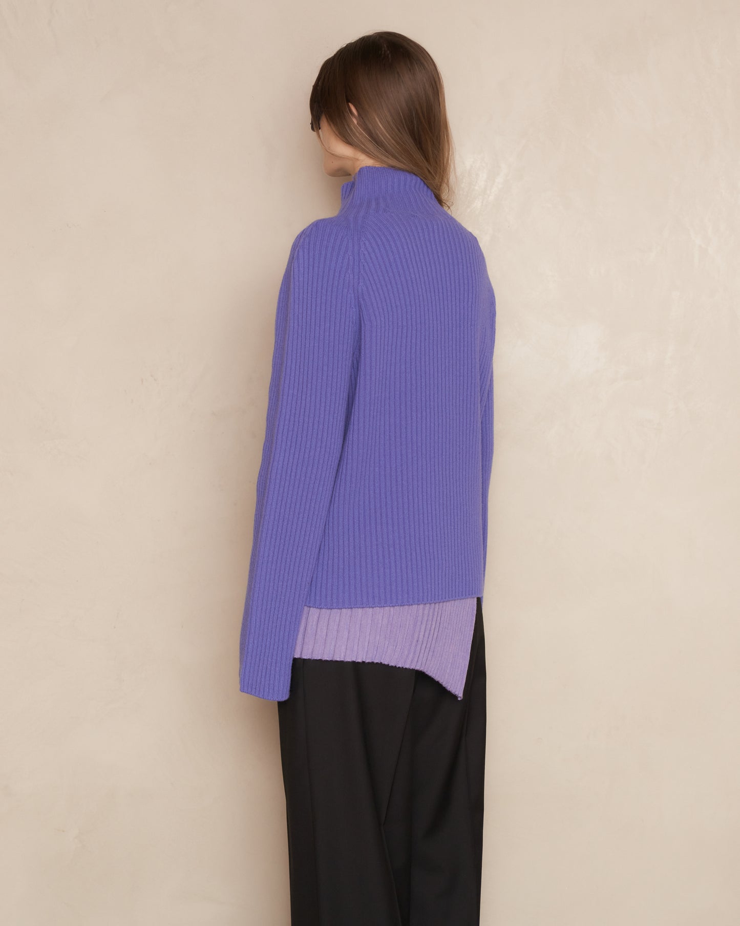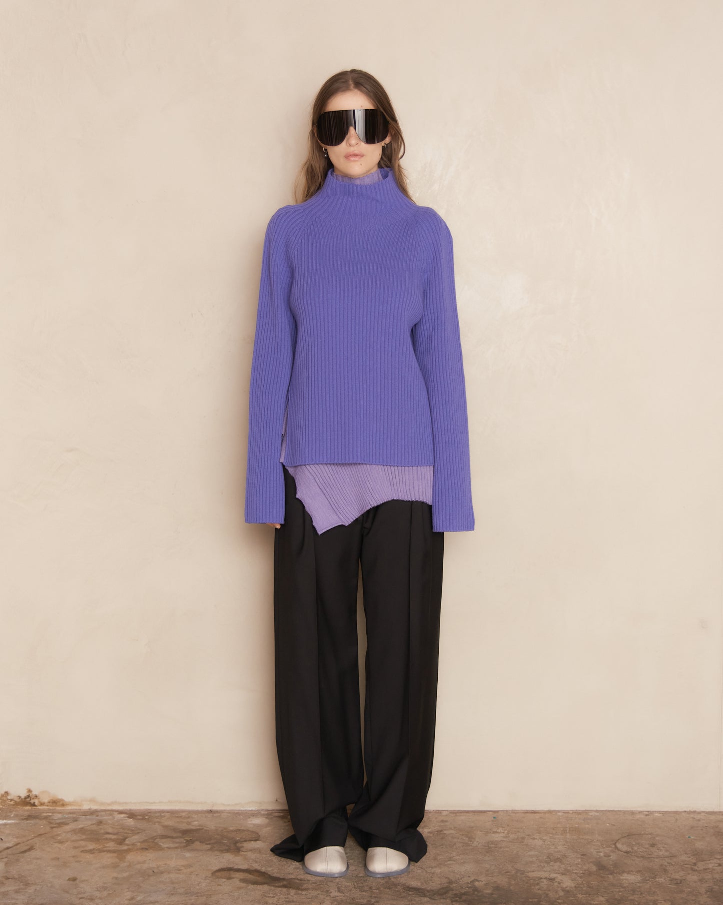 Kanonia sweater by Christian Wijnants in anemone purple. Seamless whole garment ribbed knit sweater with structured turtleneck. Long sleeves finish with a slight flare, complementing the casual fit and side slits.