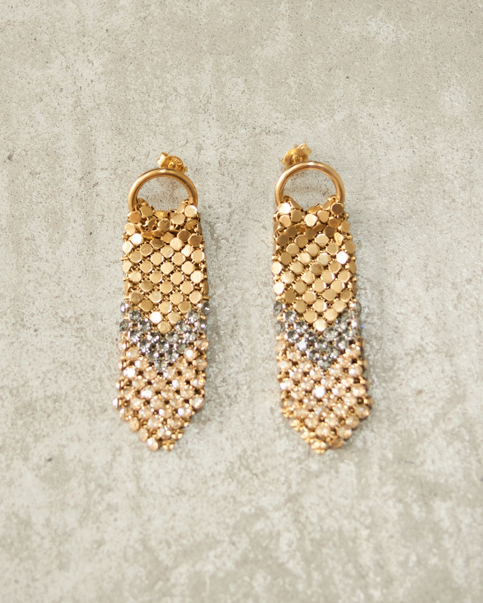 Gracious Arrow earrings by Laura B in gold. Asymmetric drop earrings featuring brass glomesh in gold and grey tones, embellished with Swarovski crystals and finished with post backings.
