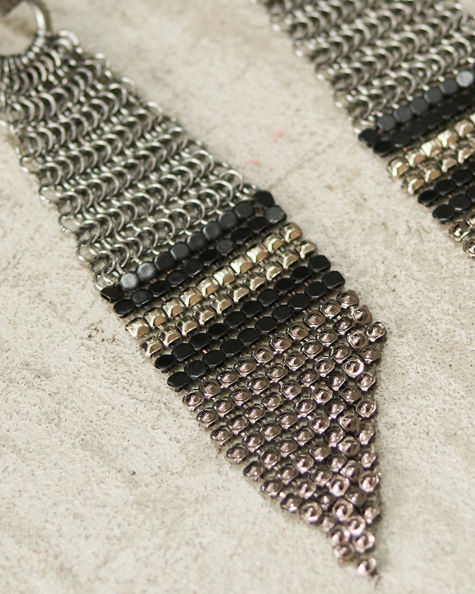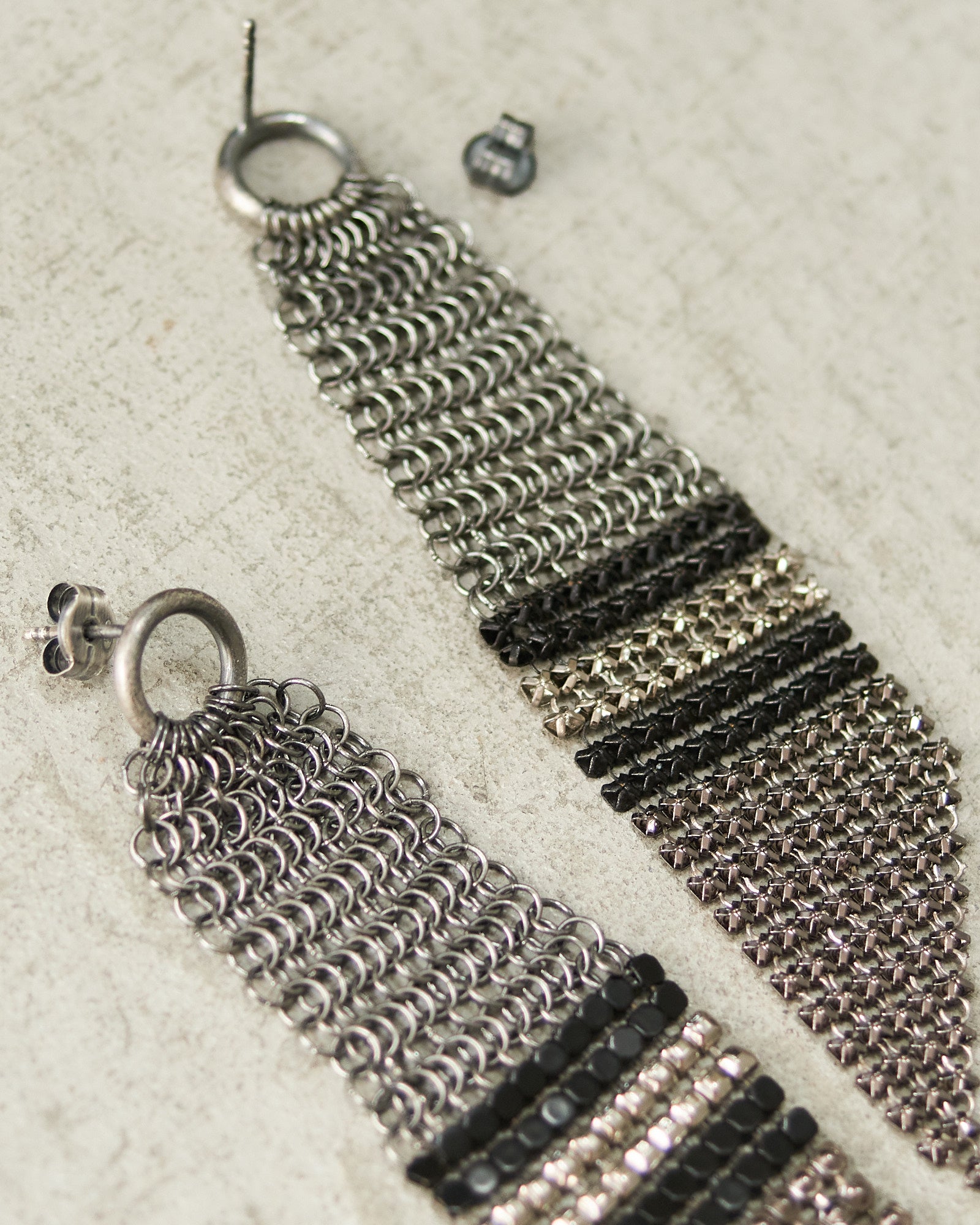 Jemma earrings by Laura B in silver. Drop earrings featuring brass glomesh in black and silver tones, suspended from a stainless steel chain and finished with post backings.