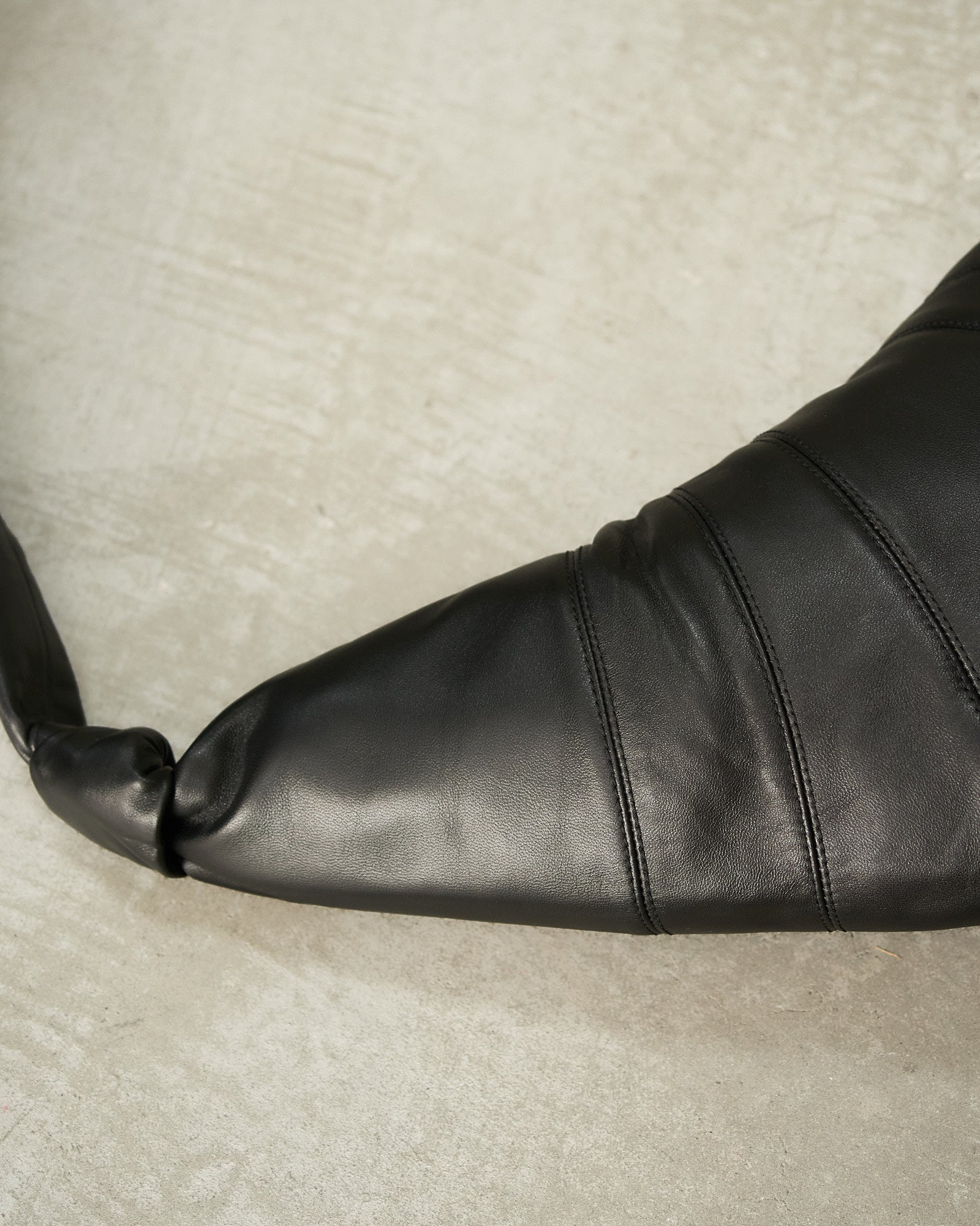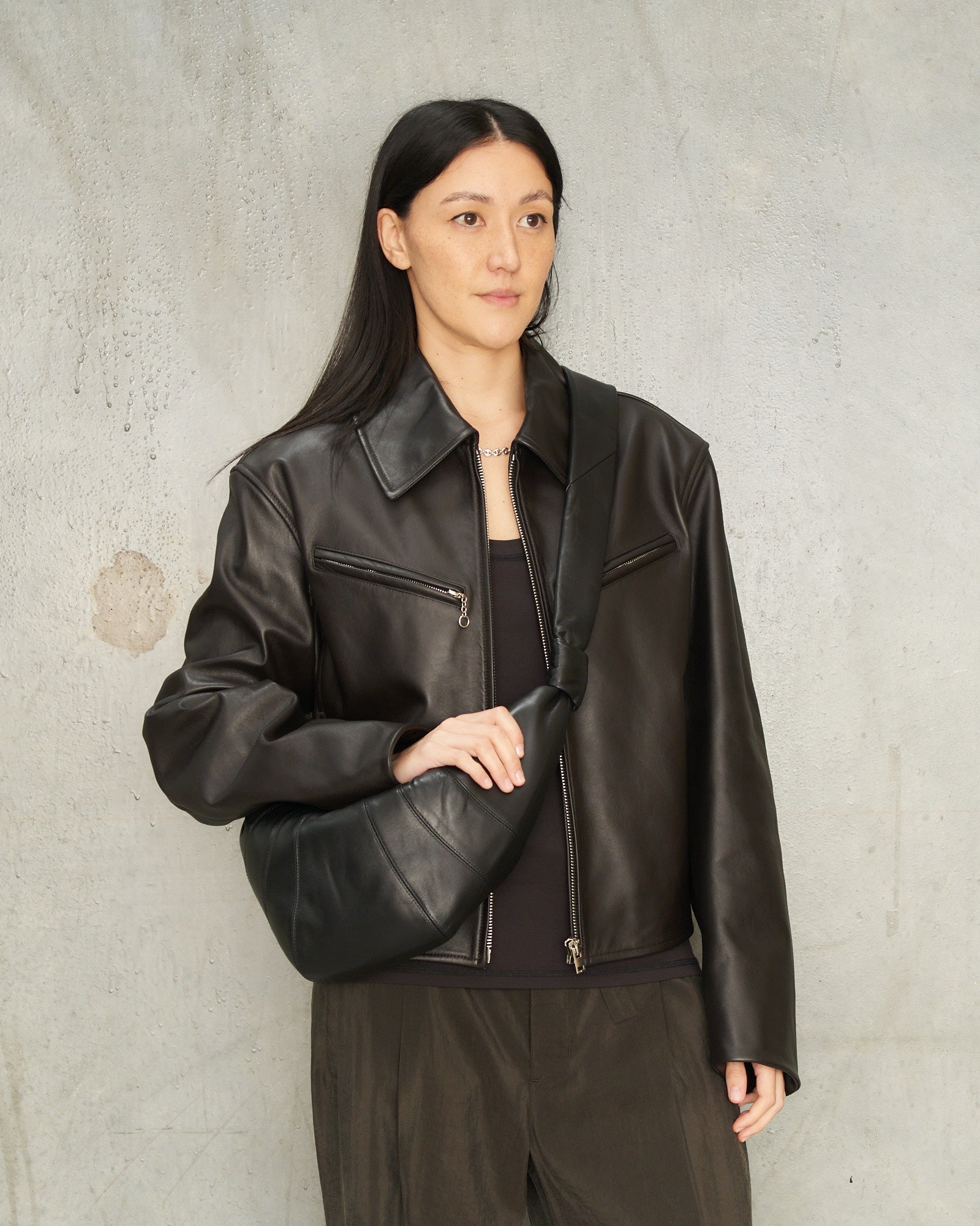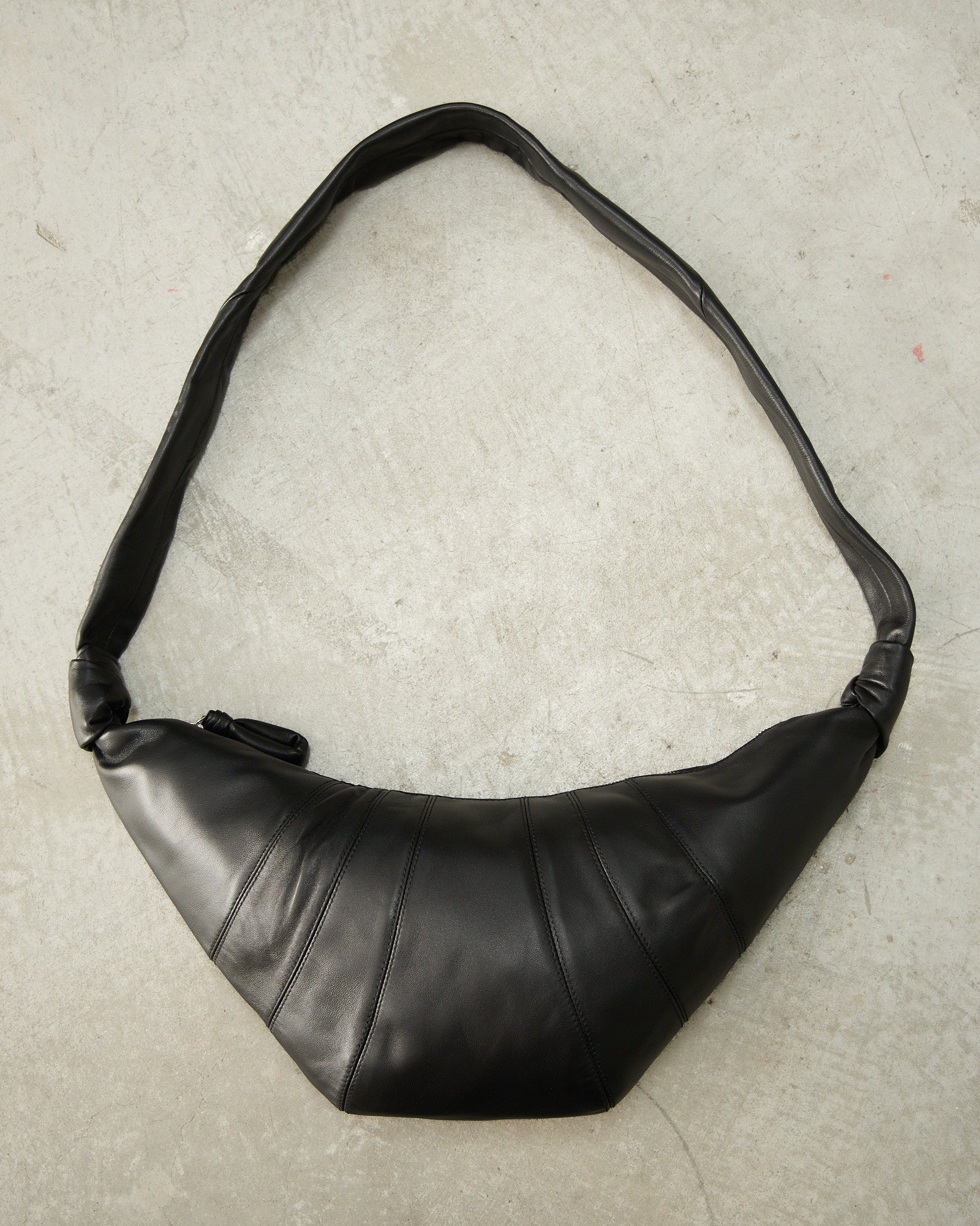 Medium croissant bag by Lemaire in black. Soft, supple lamb leather shaped into a curved, pastry-inspired silhouette with top-stitched cutouts for texture and durability.