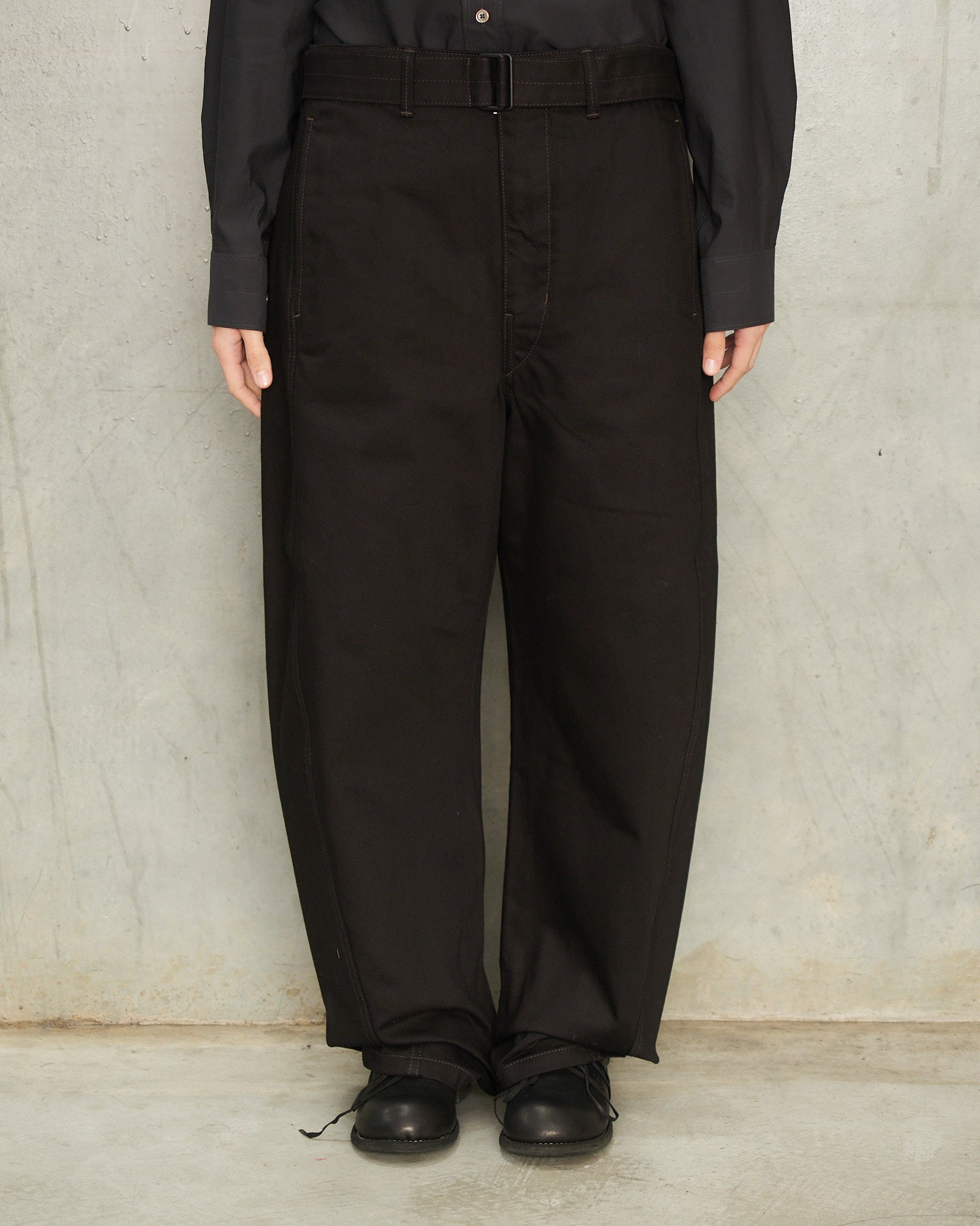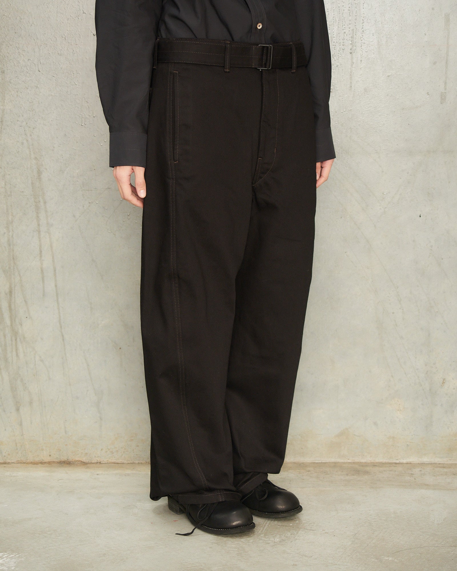Twisted belted pants by Lemaire in black. High-waisted trousers crafted from heavy denim with a visible twill weave. Featuring long, straight legs with subtly twisted side seams, they offer a modern twist on classic denim. The design includes a concealed closure and belt detail, adding to their timeless appeal.