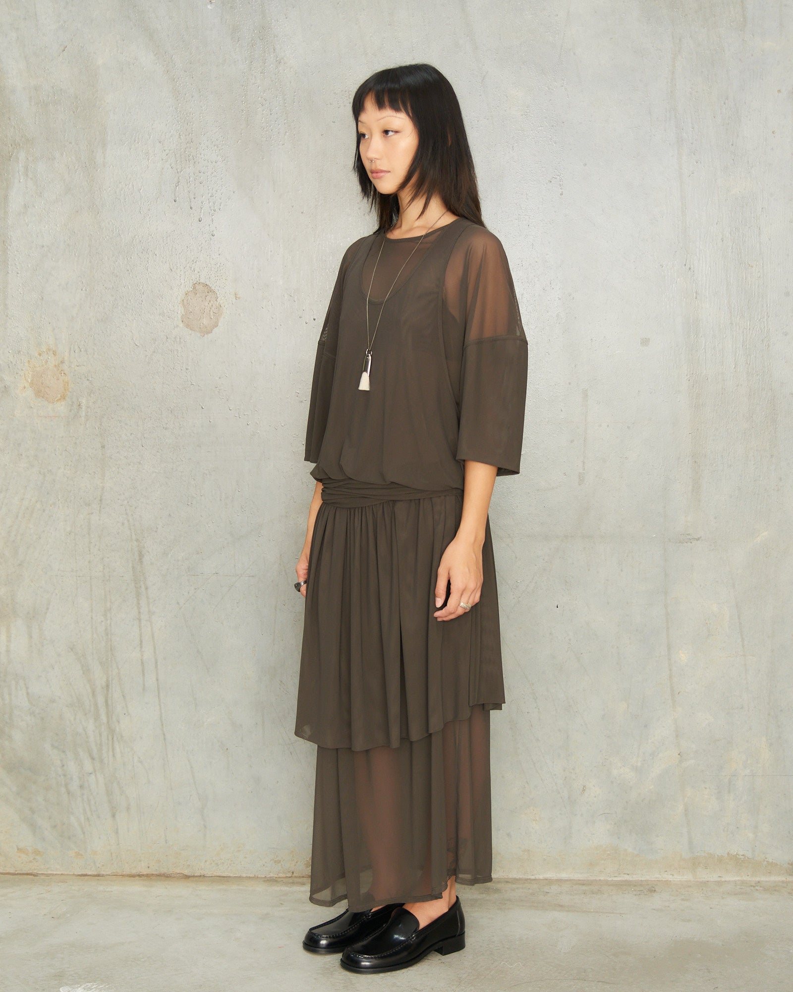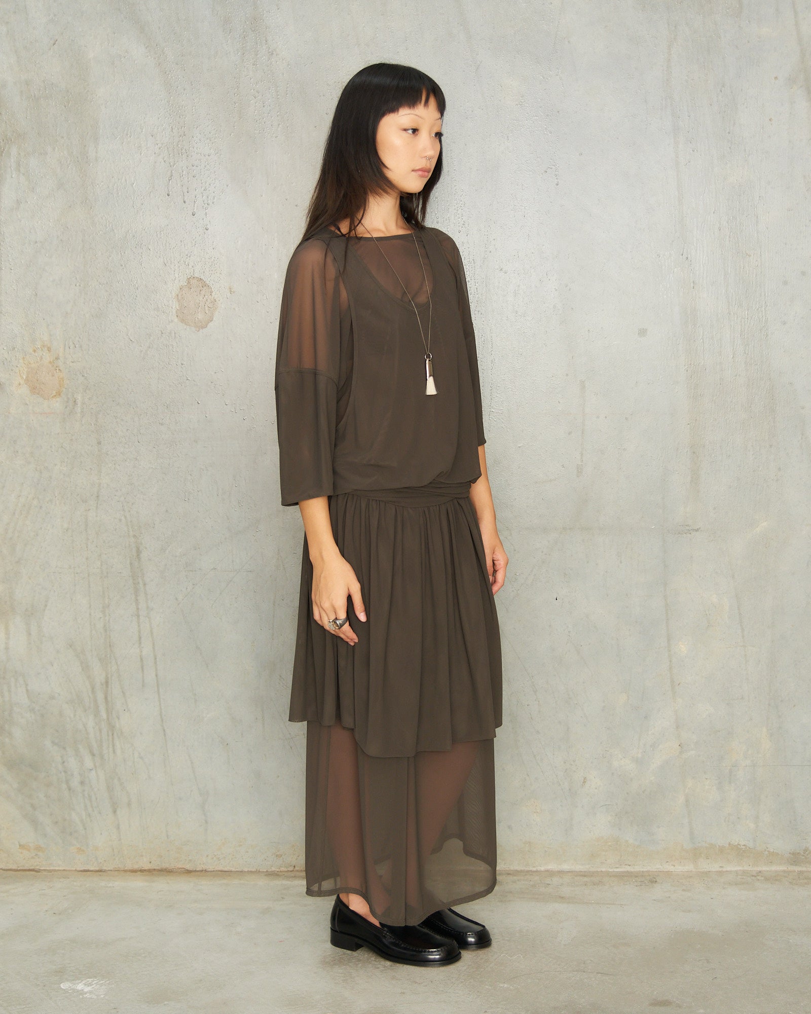 Double layer dress by Lemaire in brown. Dress formed from translucent layers of muted mesh. A tank-slip under layer meets a dropped sleeve top with softly pleated skirt, creating an elegantly enriched silhouette.