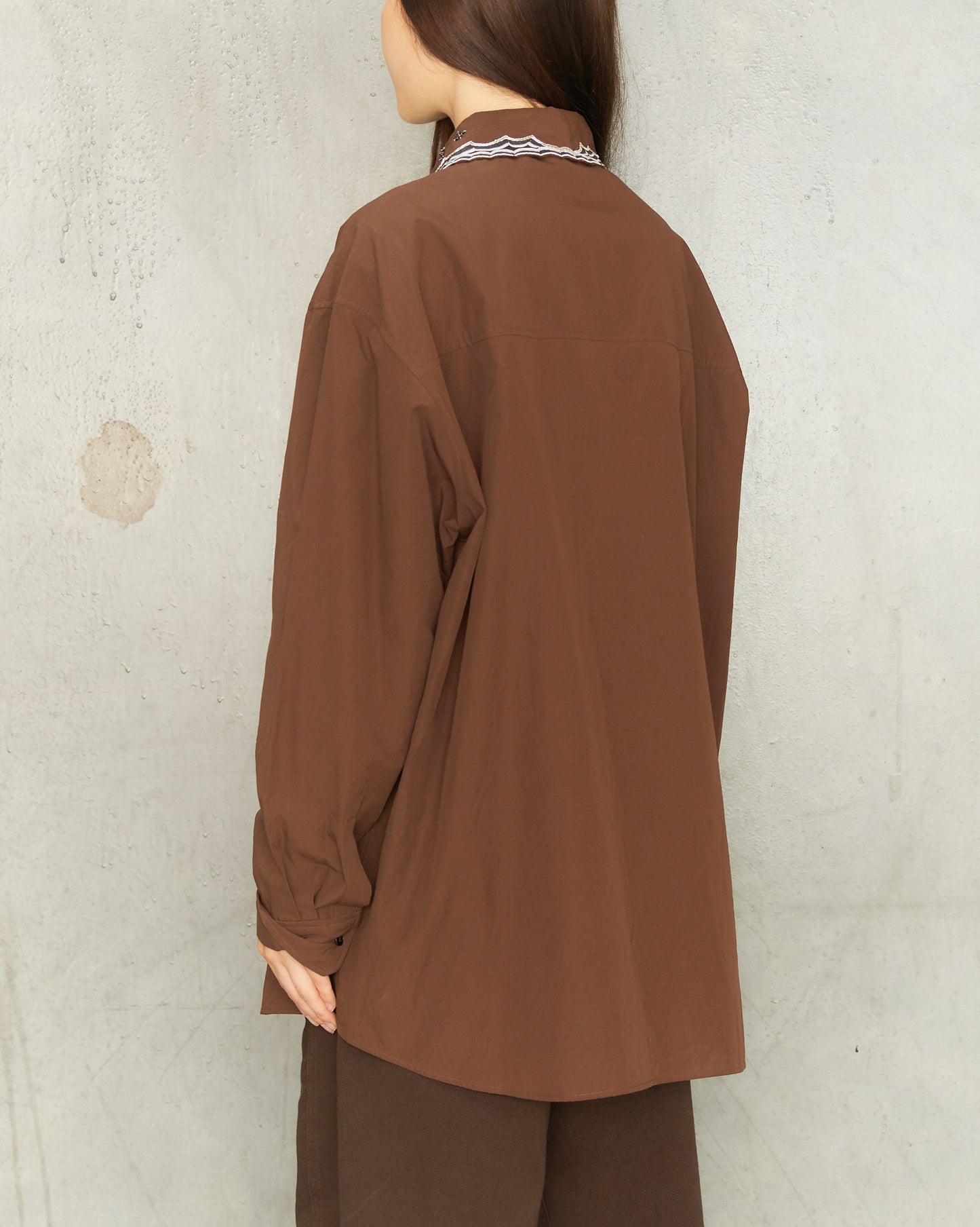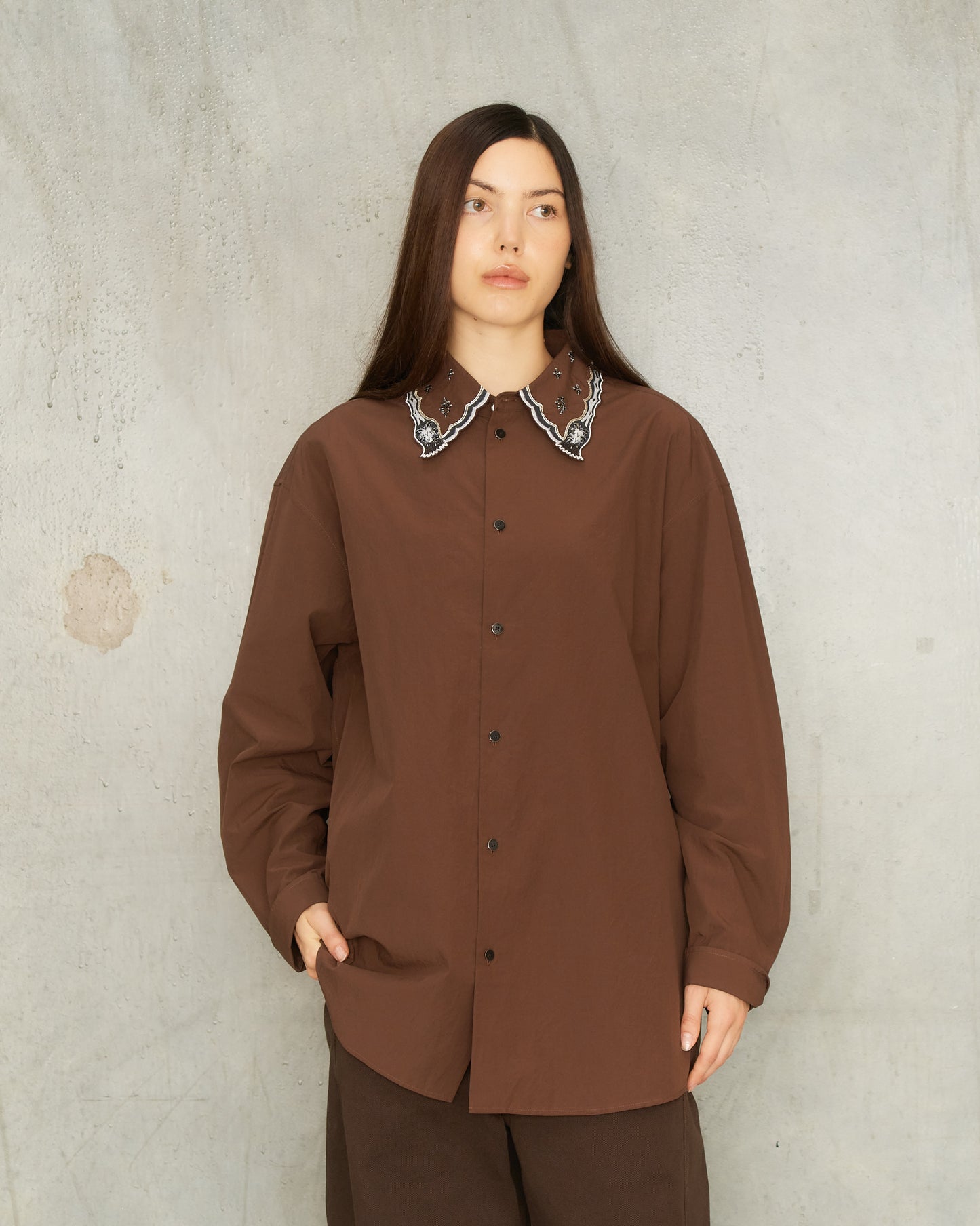 Embroidered collar shirt by Lemaire in dark acajou. Relaxed-fit shirt crafted from yarn-dyed crepe cotton for a washed effect and fluid texture. A vibrant melange of metallic embroidery and beadwork at the collar adds a refined artistic touch.