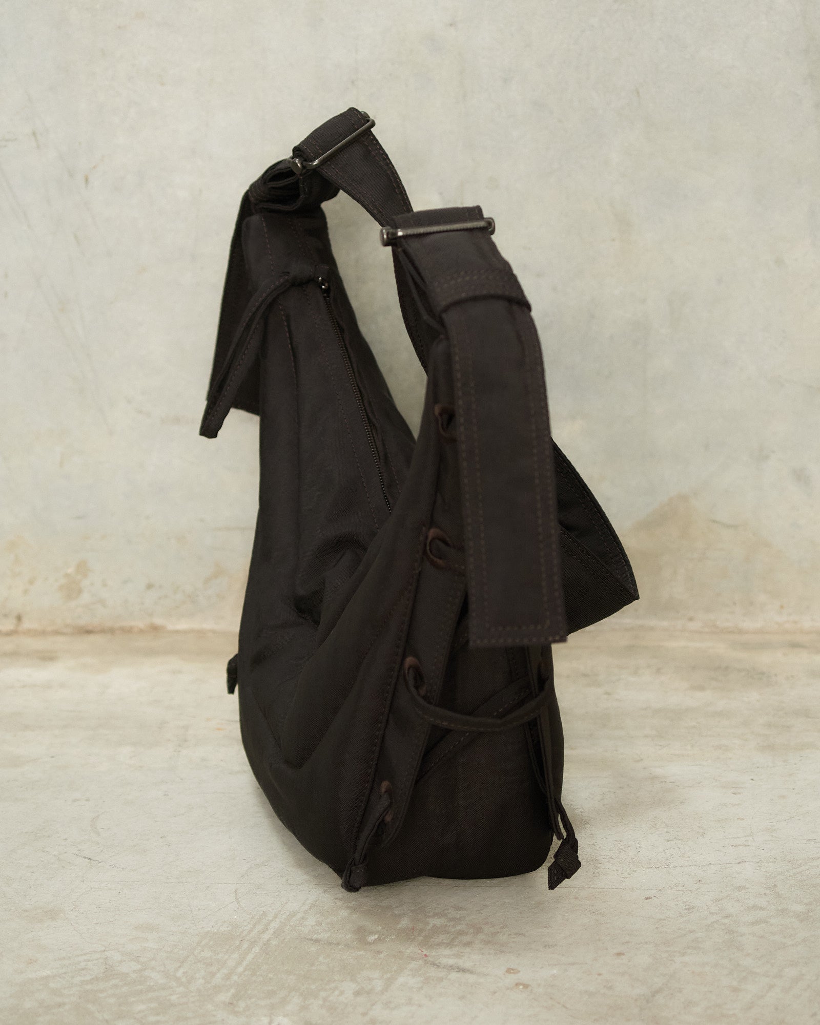 Small soft Game bag by Lemaire in dark chocolate. Structured yet soft shoulder or crossbody bag in wadded, water-repellent nylon canvas with a matte finish. Side eyelets and laces allow for adjustment.