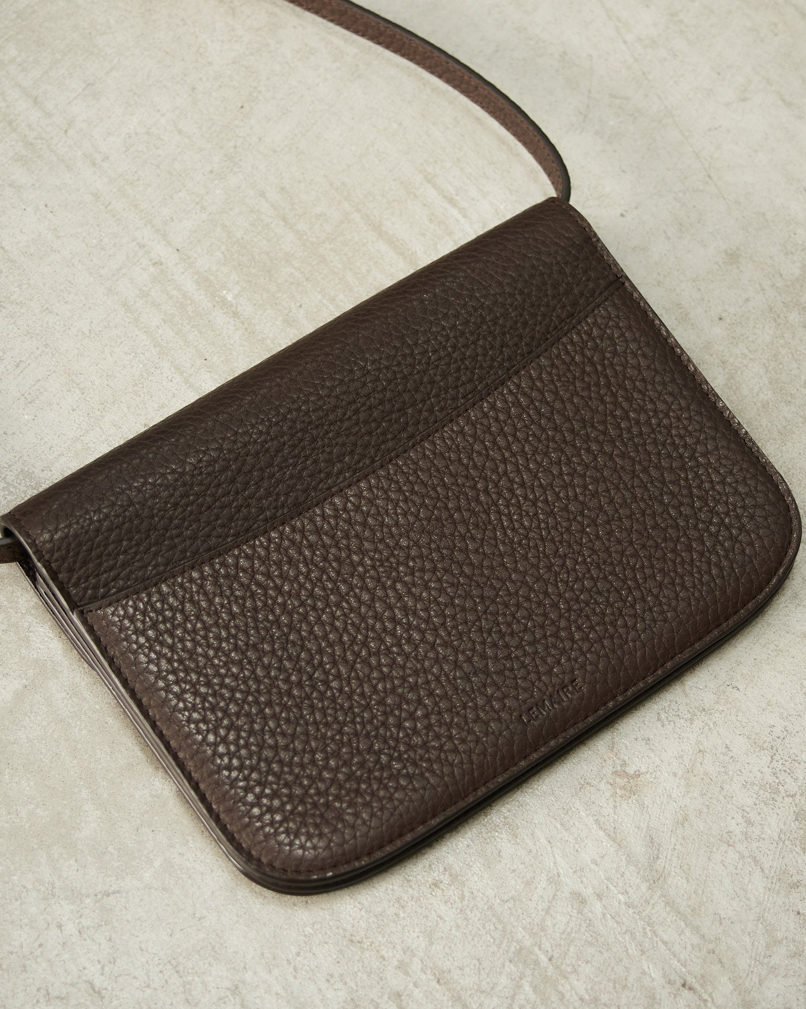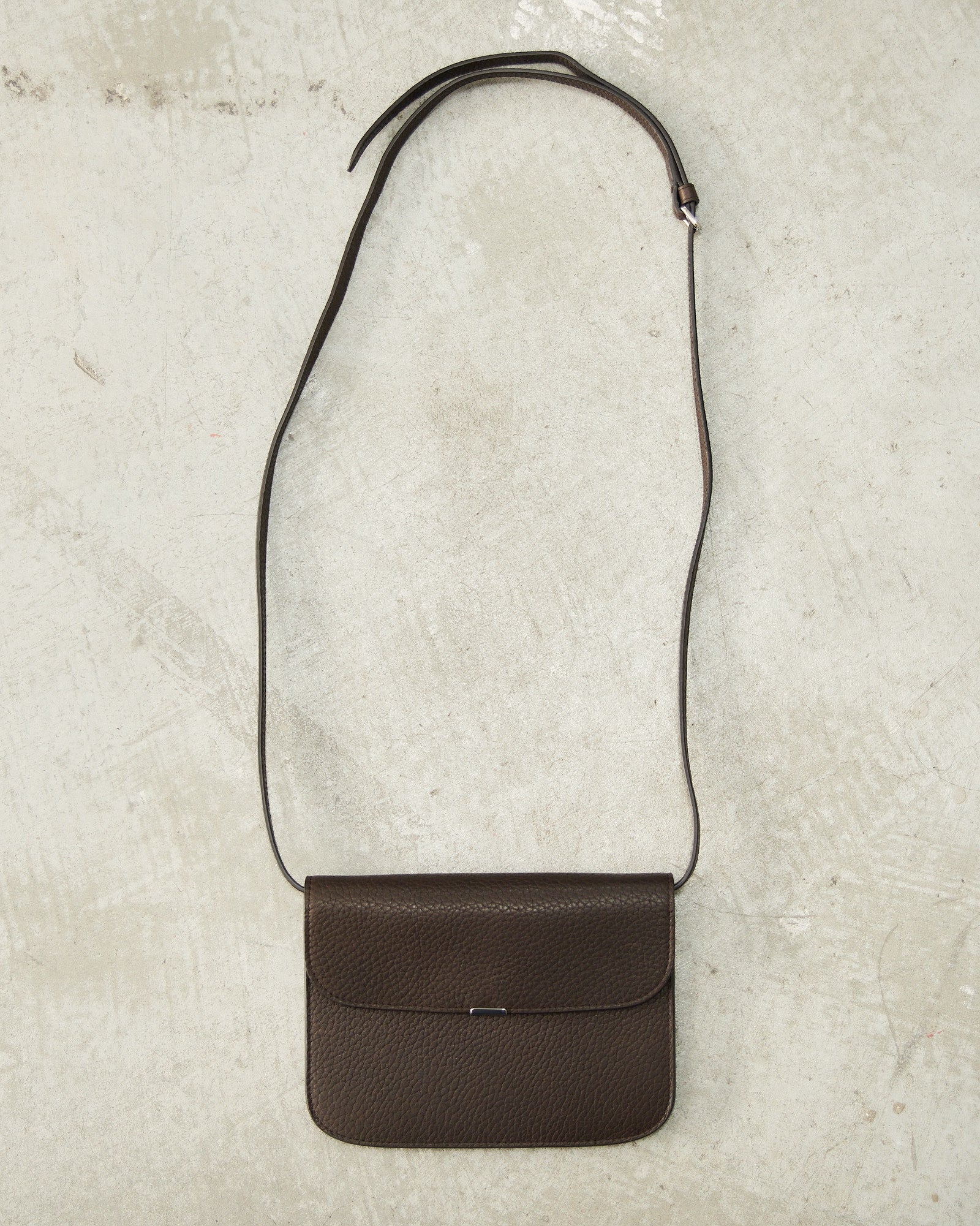 Soft tab wallet bag by Lemaire in dark chocolate. Compact pochette in luxuriously grained leather, featuring a snap-flap closure and slender matching shoulder strap.