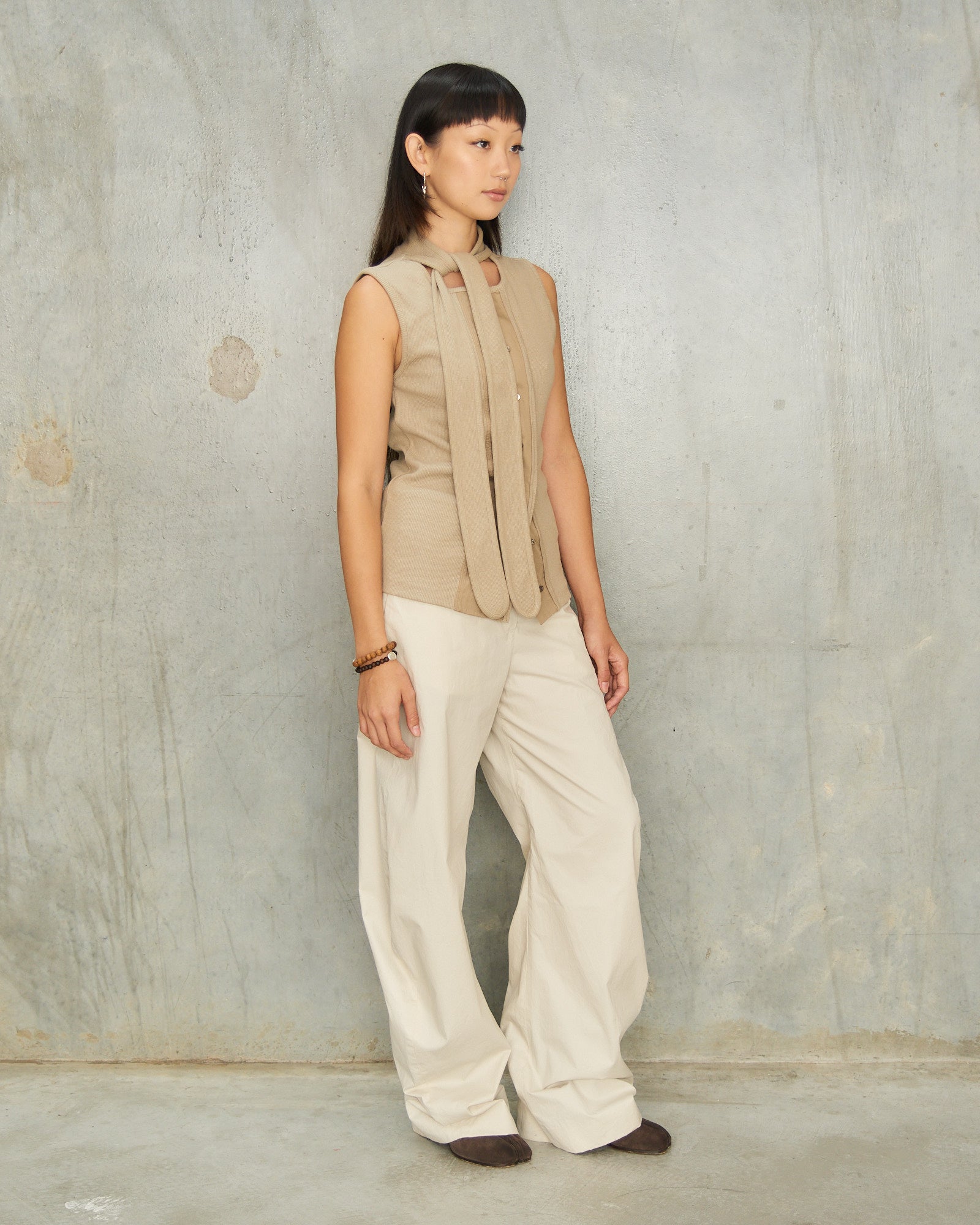 Pictured with Beige Chevron Croissant Filt Bag and Creamy White Twisted Pants by Lemaire and Brown Suede Tabi Boots by Maison Margiela.