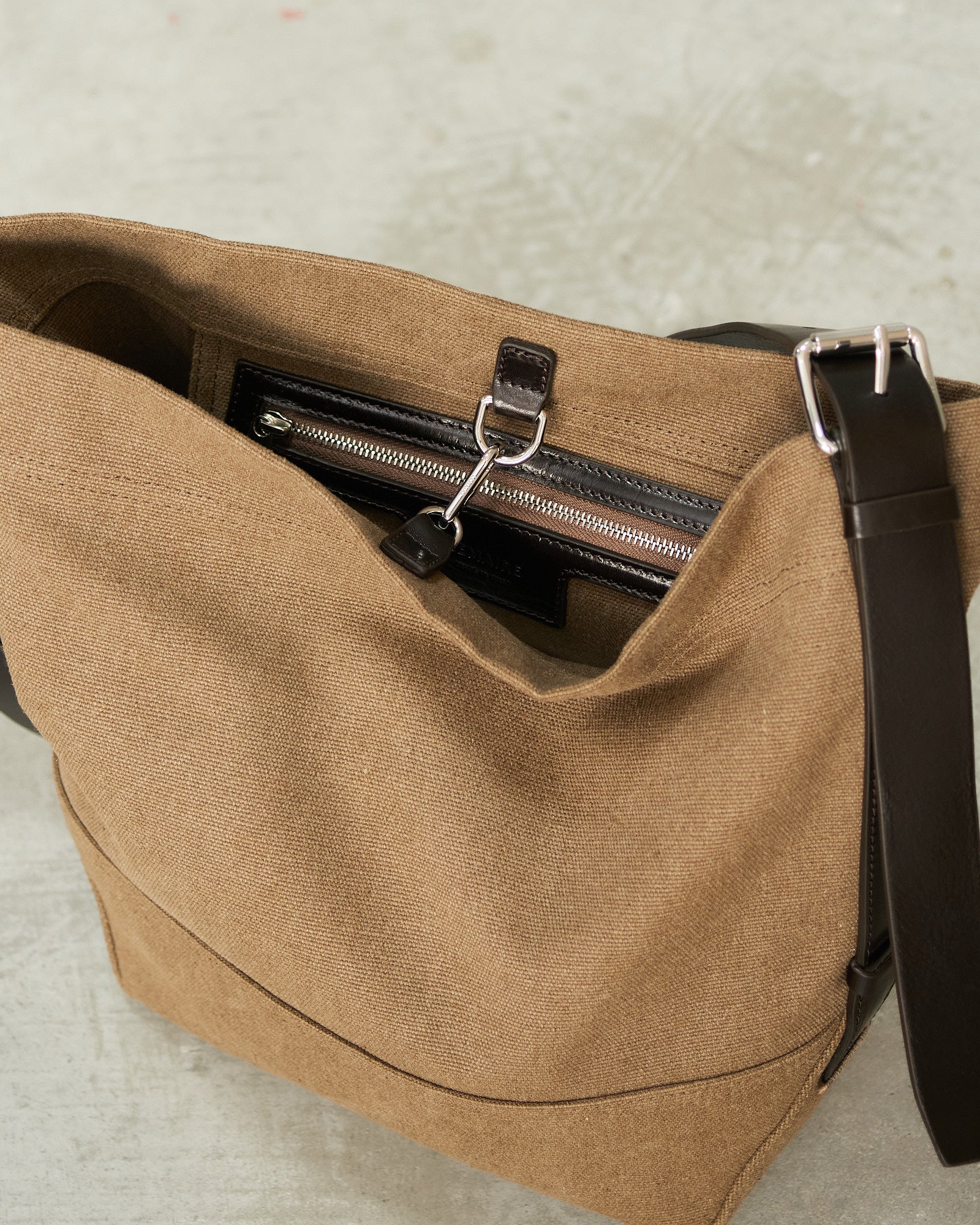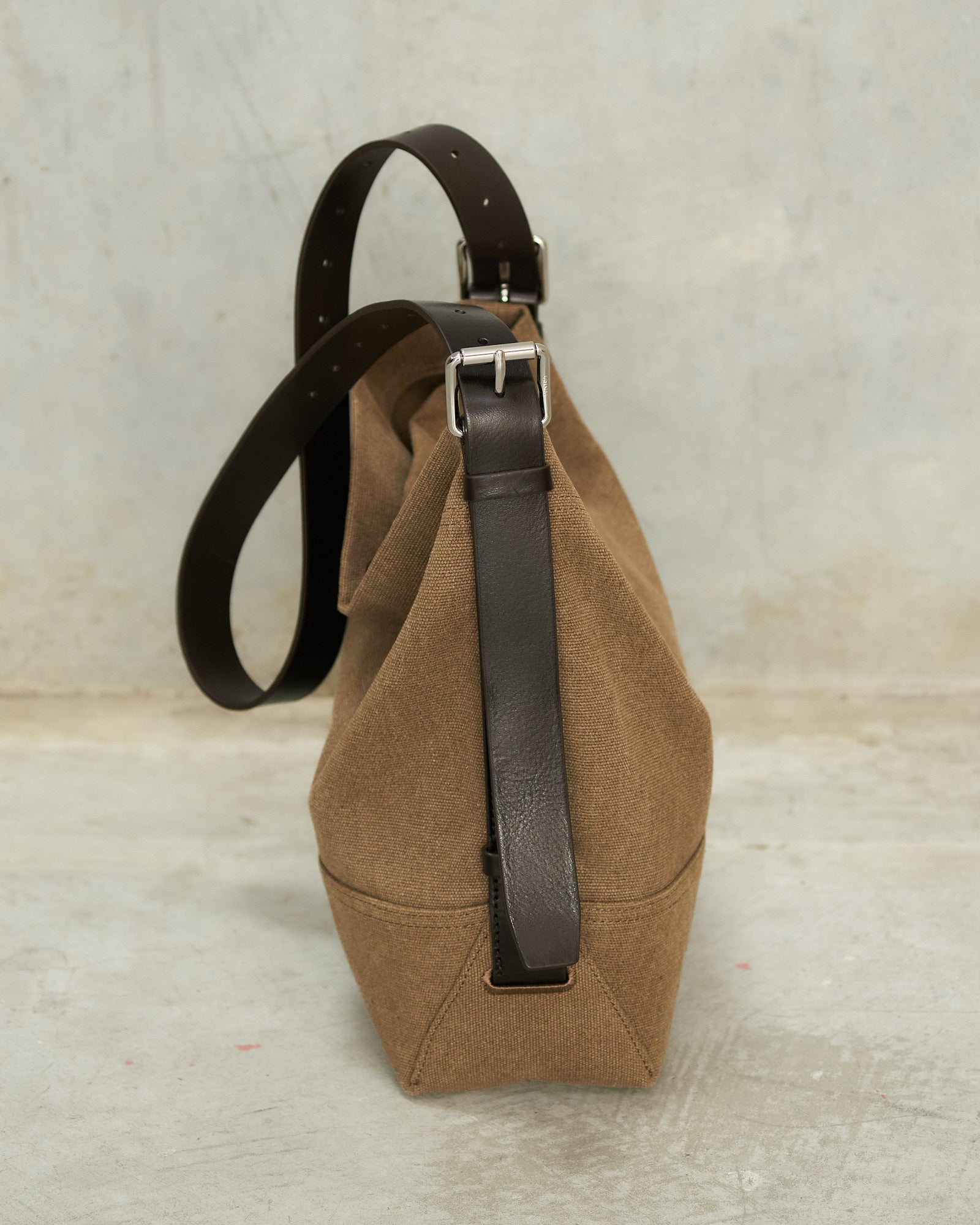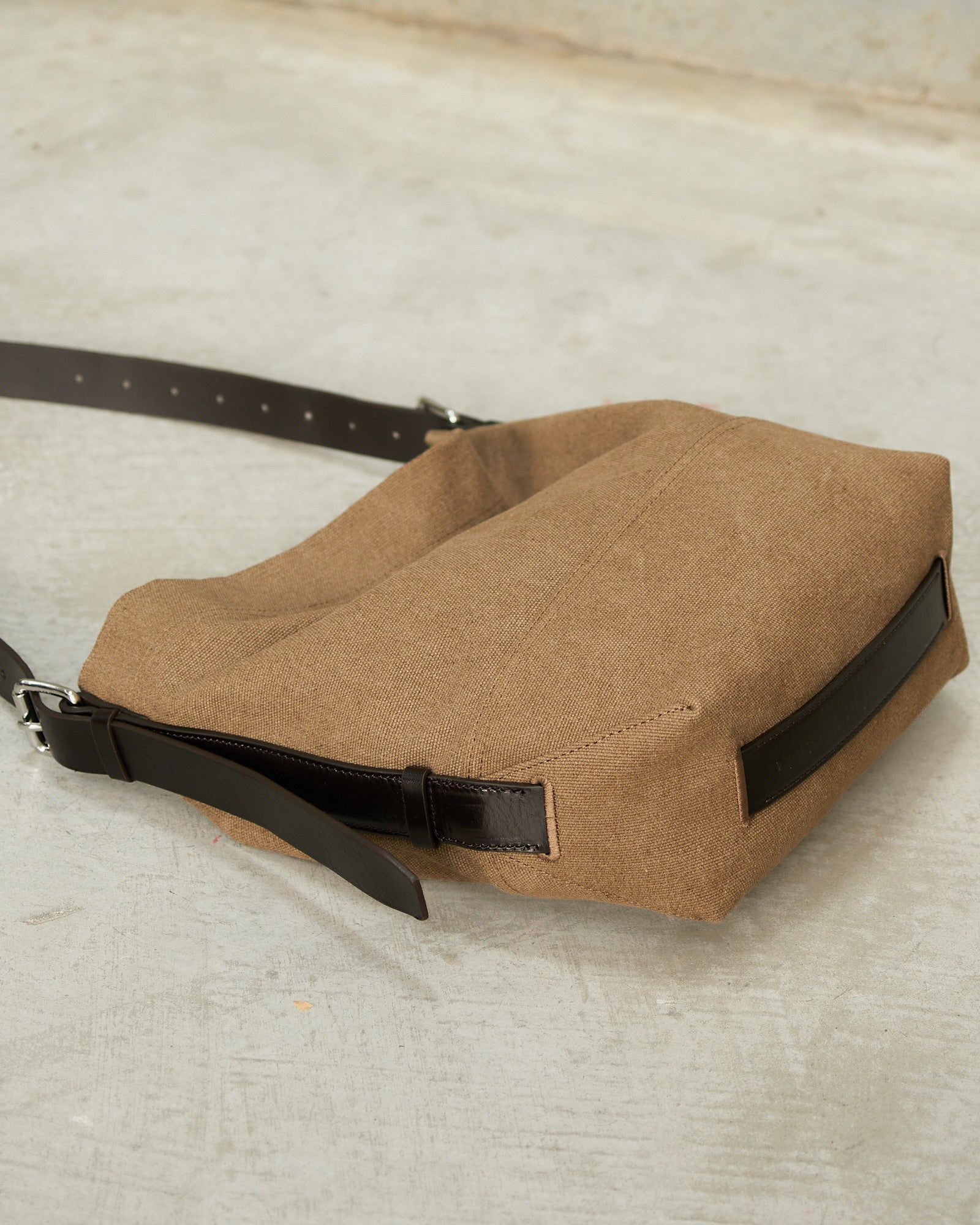 Small Belted Tote by Lemaire in Sisal. A compact tote shaped with clean, utilitarian lines. Crafted in tie dye cotton canvas, it features a vegetable tanned leather strap inspired by a belt and finished with polished metal hardware. Practical and refined, designed for everyday essentials.