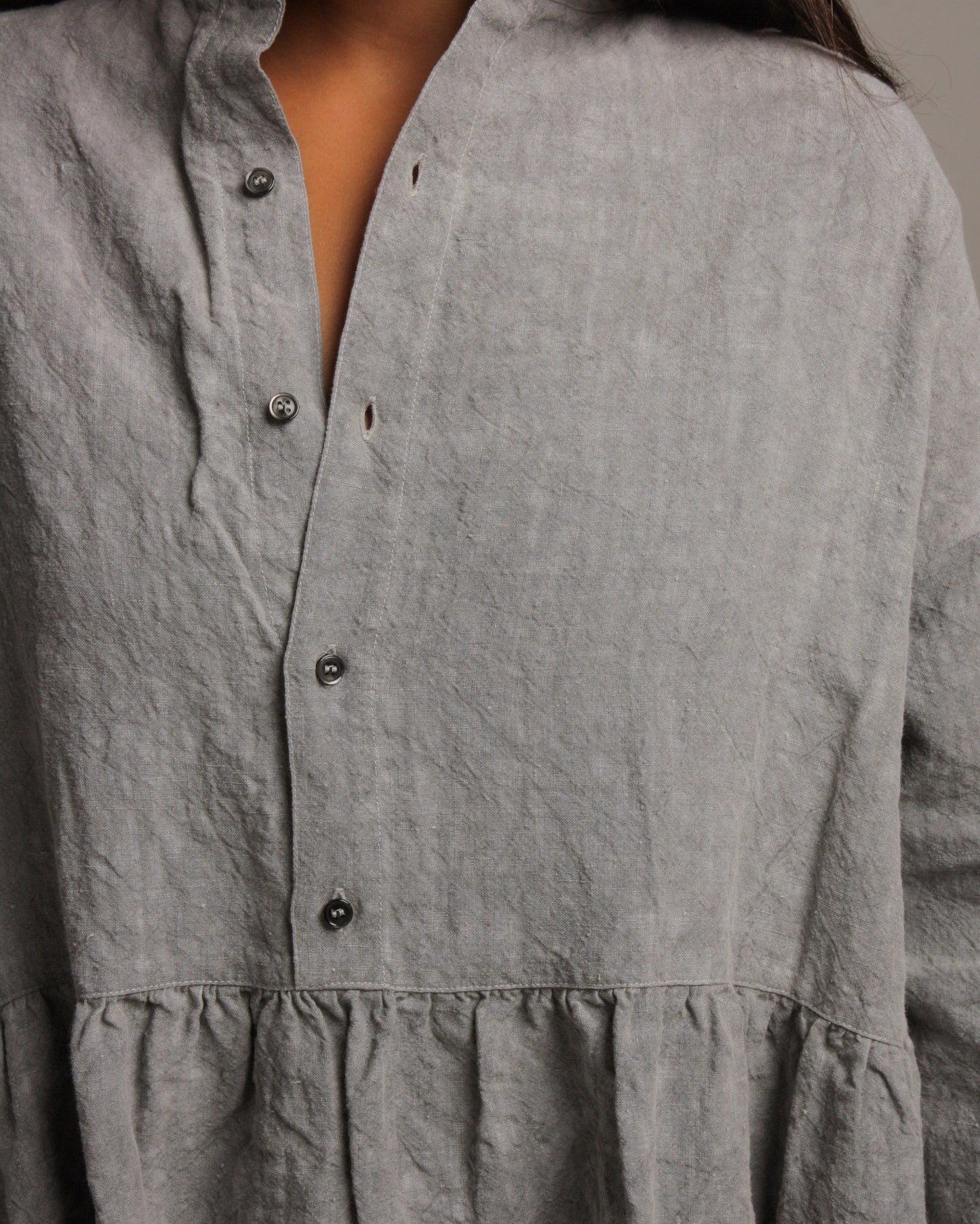 Linen shirt dress by Ichi Antiquités in light grey. Half buttoned dress with band collar and dropped sleeves. Thicker, crinkled linen is naturally dyed with charcoal for an uneven and matted texture. Rustic dressing for all occasions.