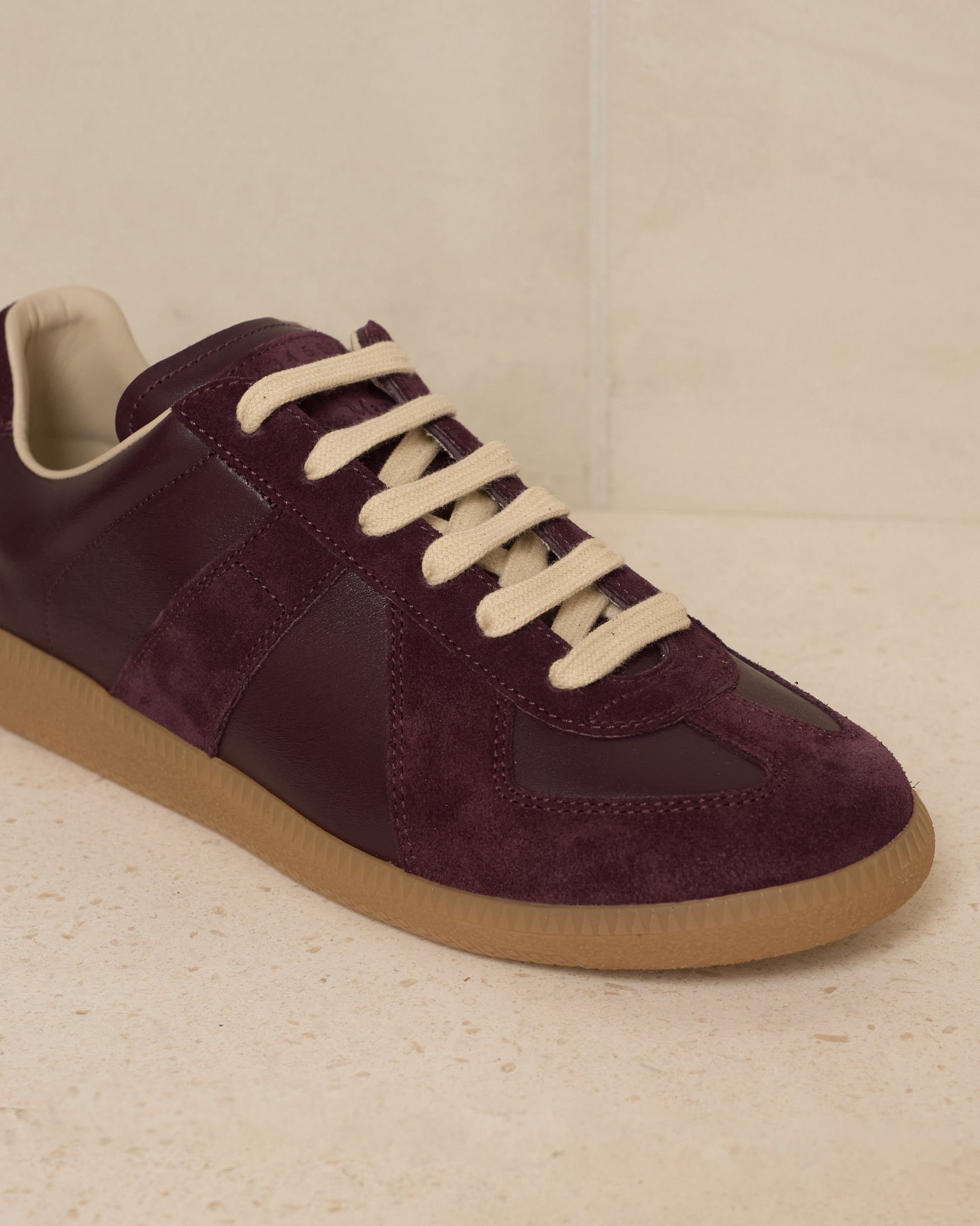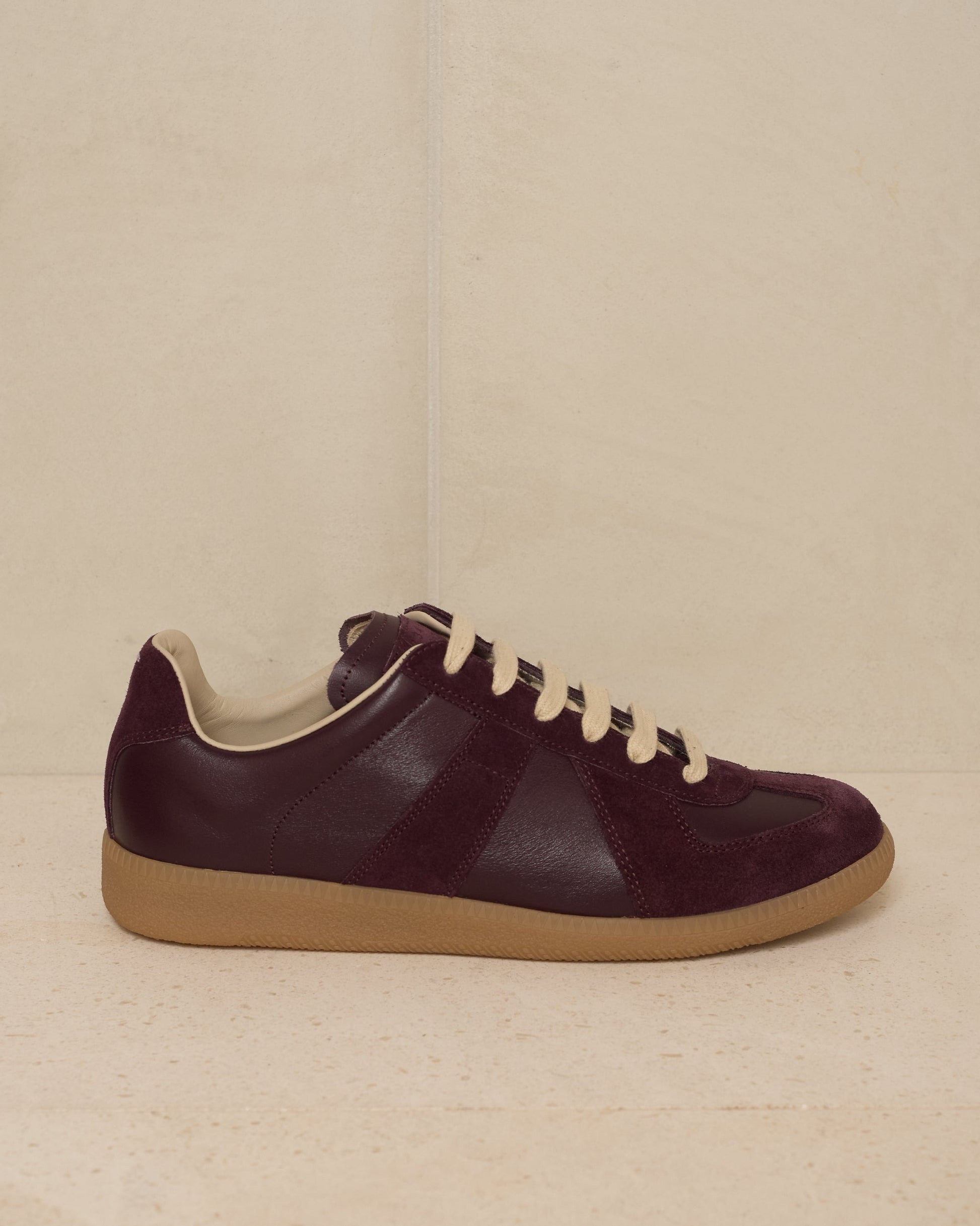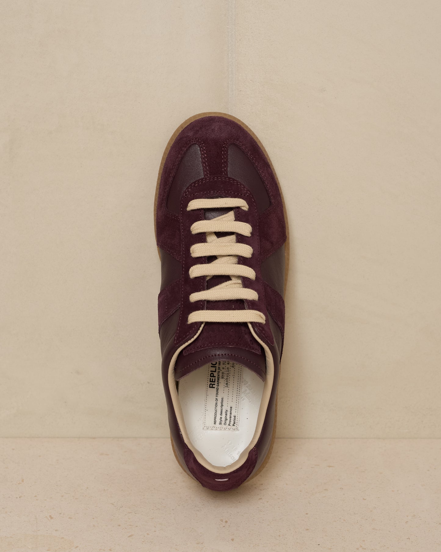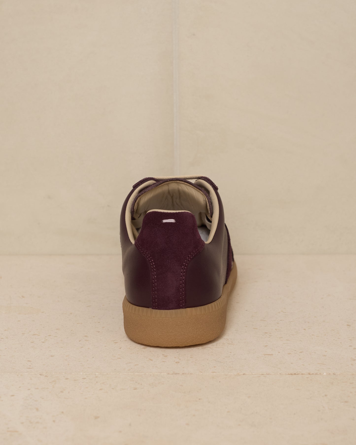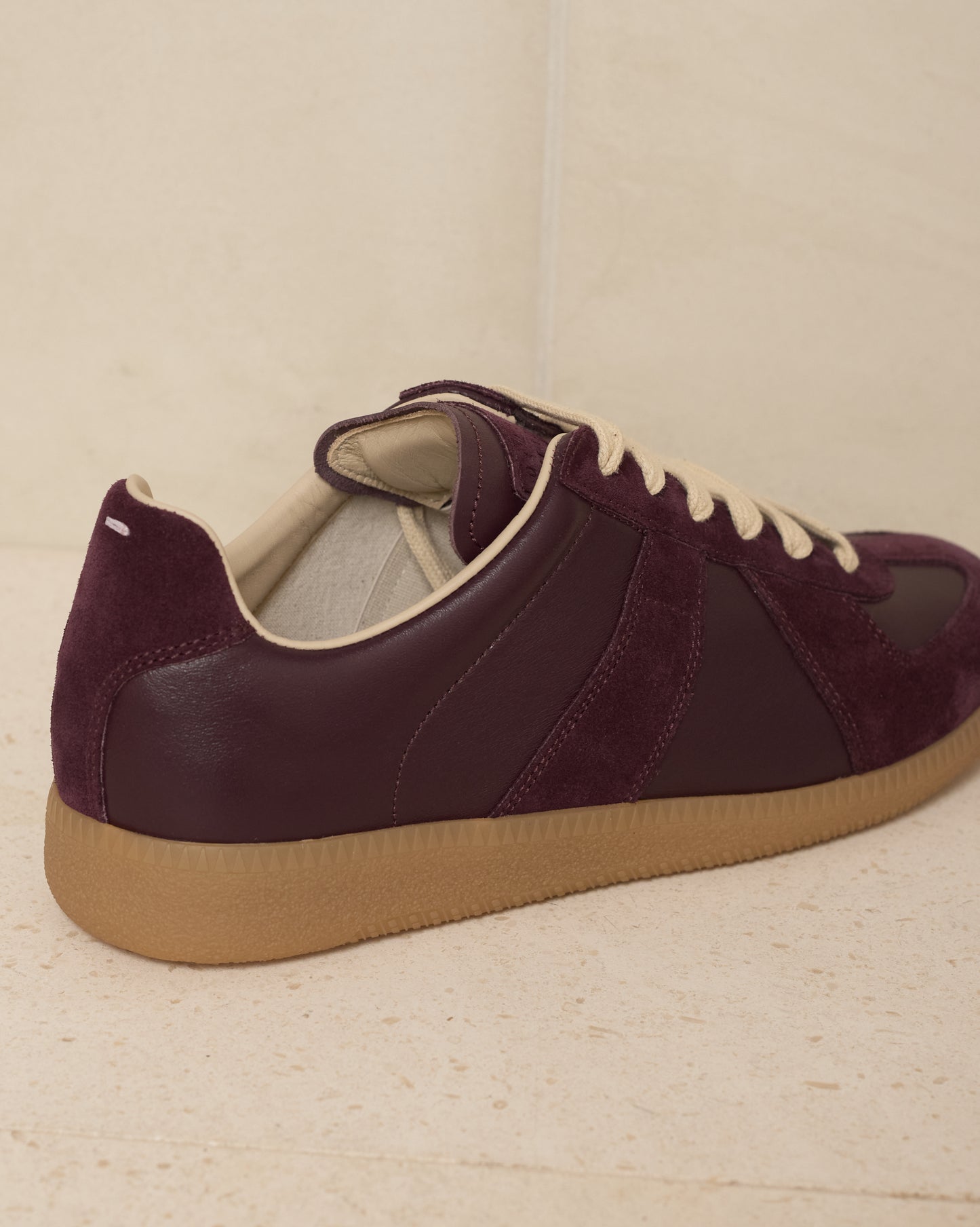 Replica sneakers by Maison Margiela in merlot. The Maison's iconic Replica sneakers are inspired by Austrian sports shoes from the seventies. These classic sneakers are functional for daily wear in nappa leather and suede, finished with a signature gum sole. Burgundy merlot colouring captivates in its seductively deep tone.