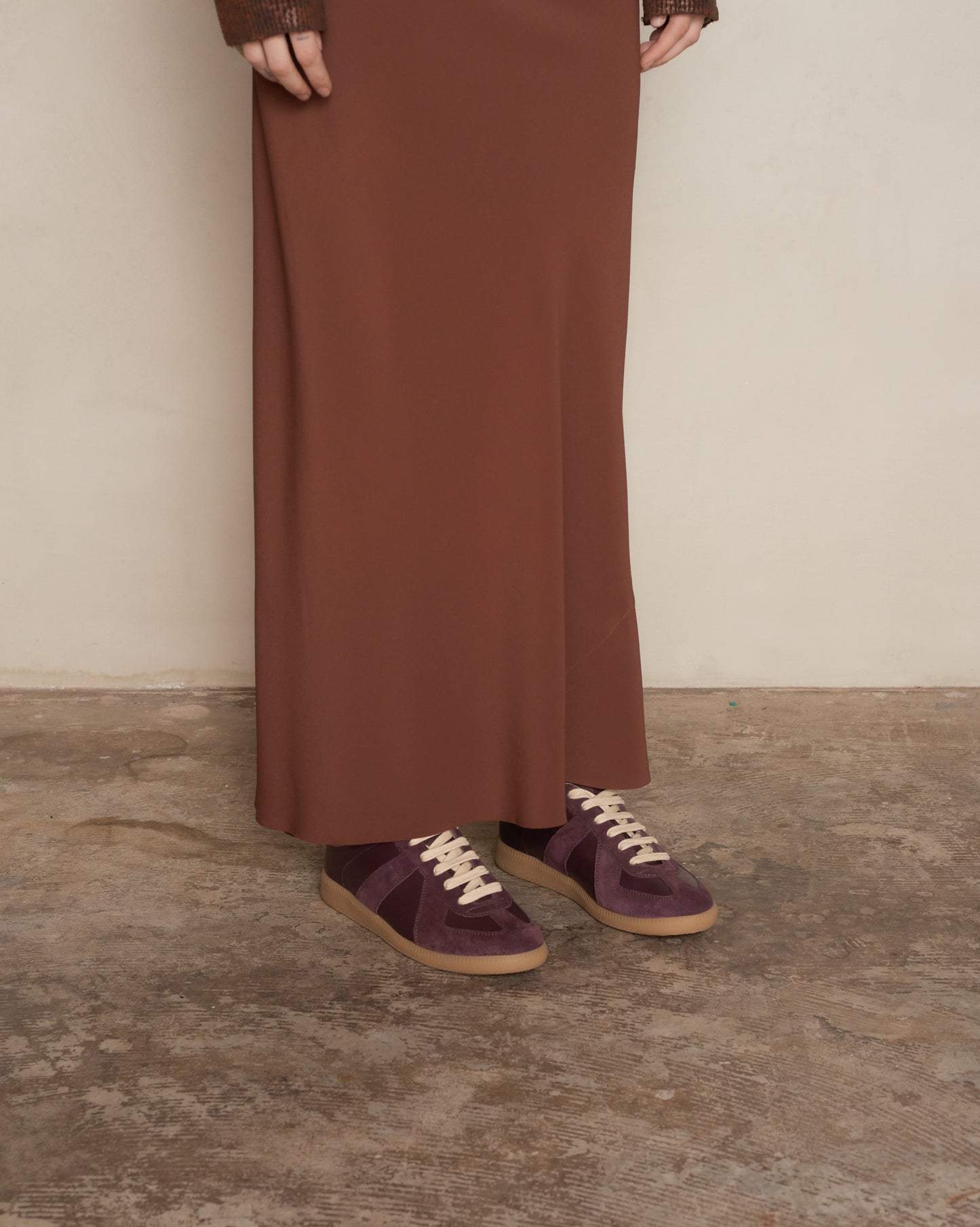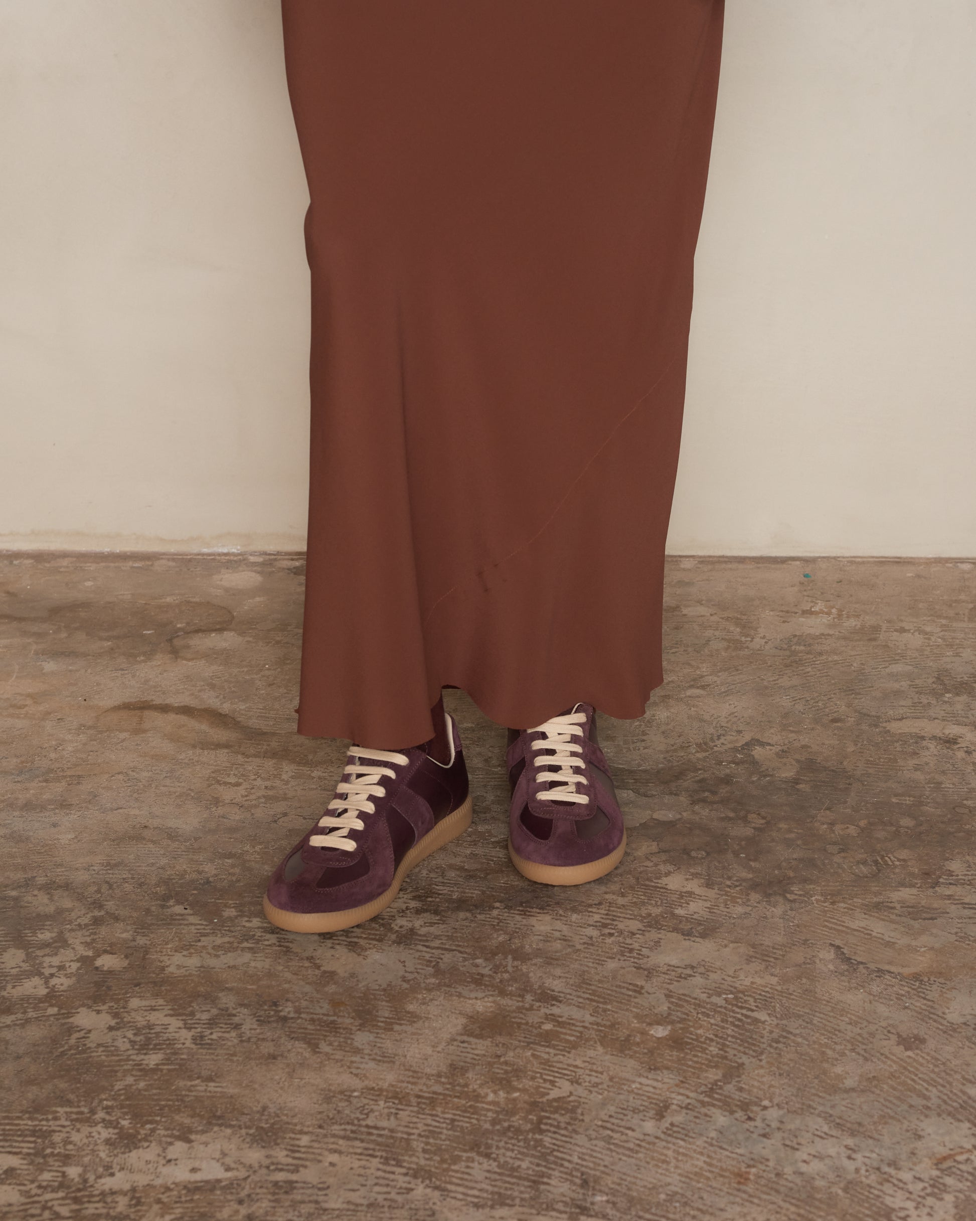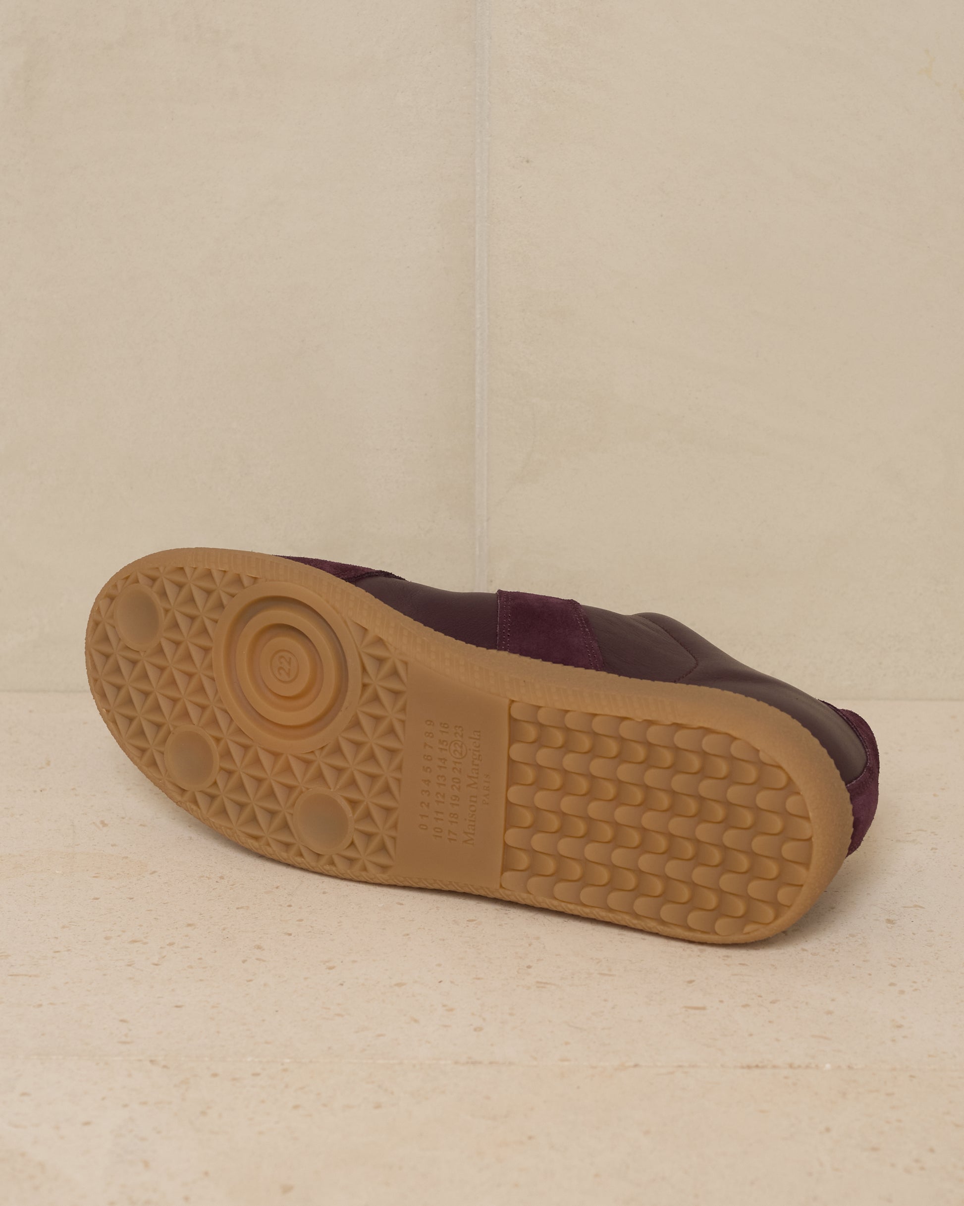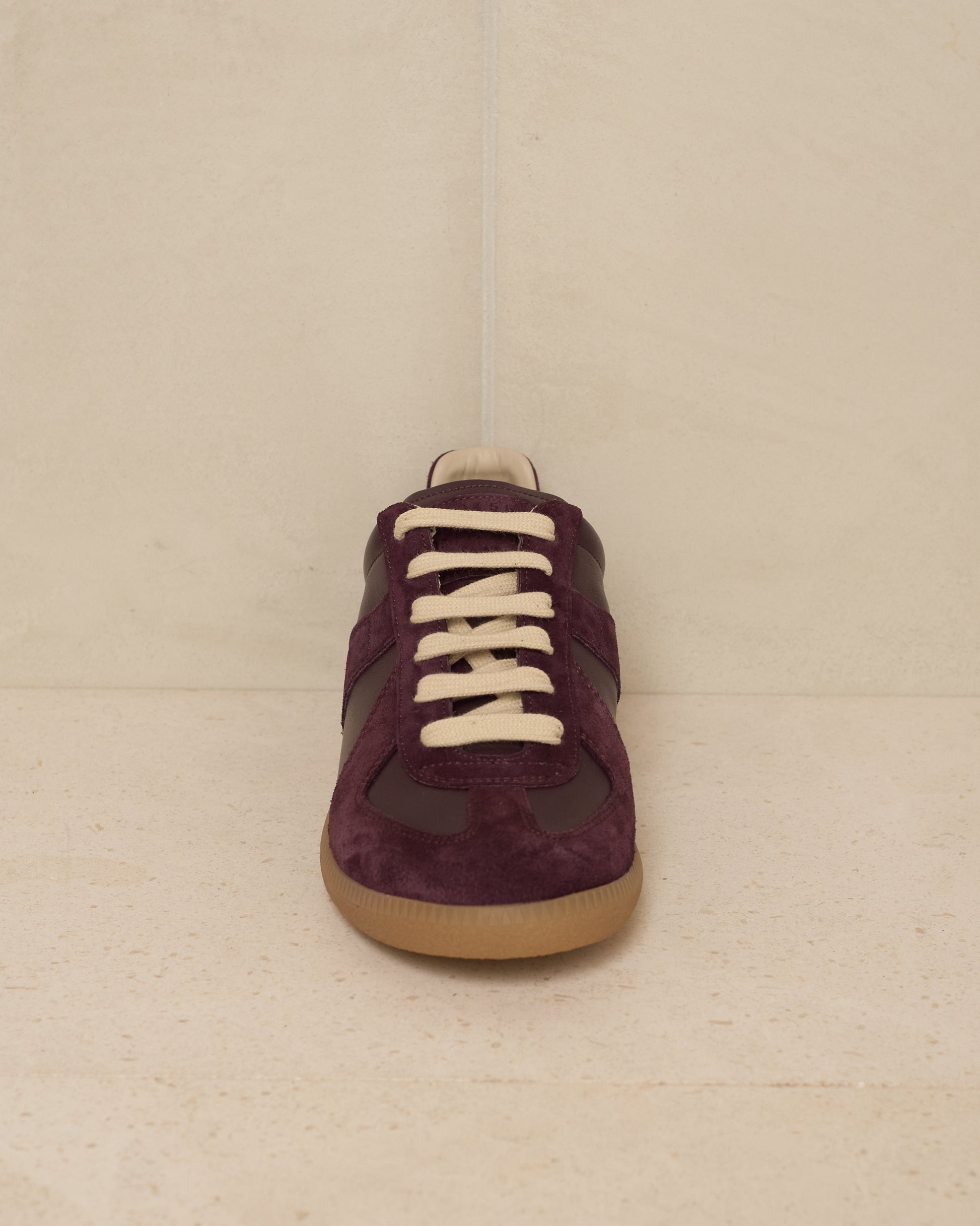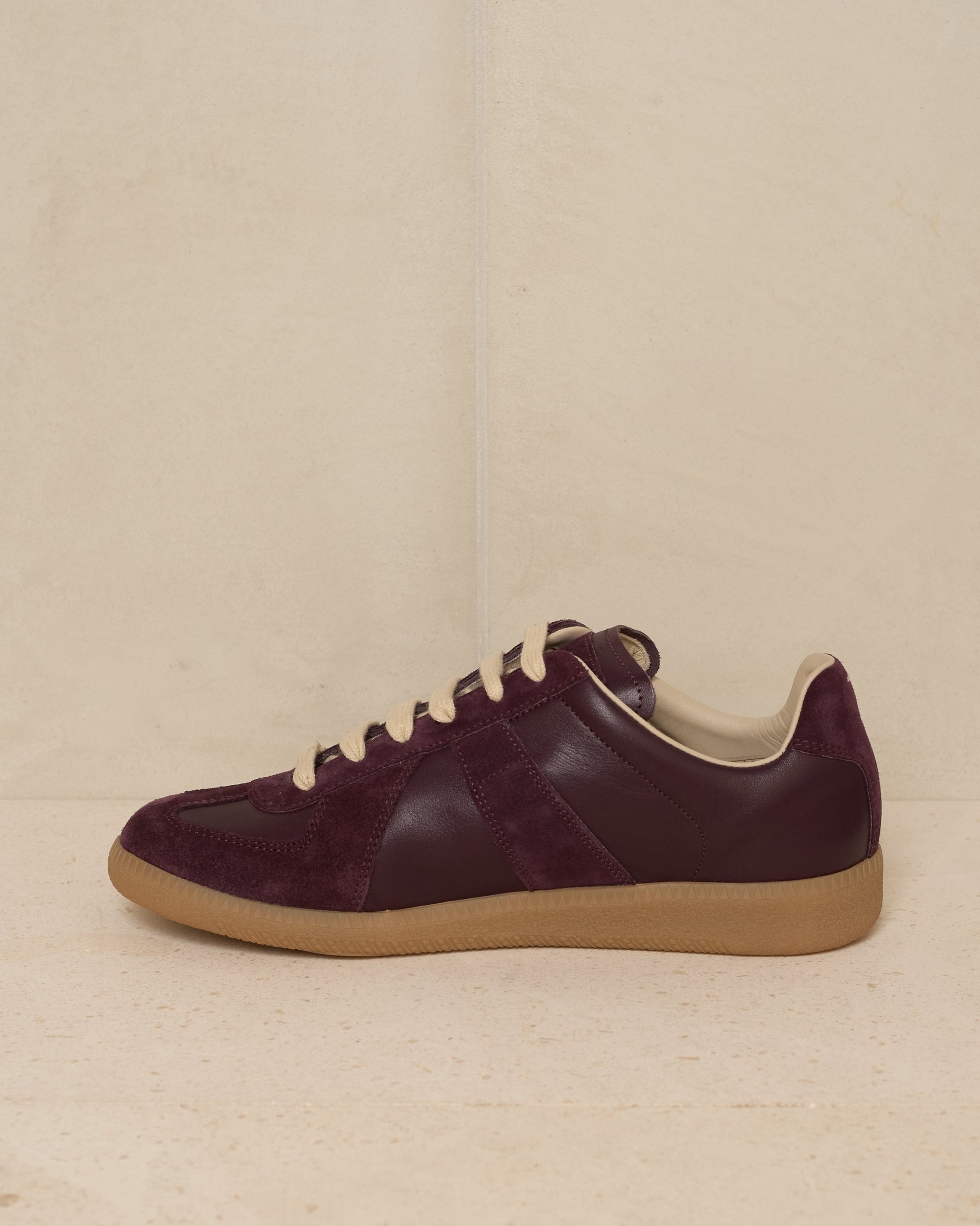 Replica sneakers by Maison Margiela in merlot. The Maison's iconic Replica sneakers are inspired by Austrian sports shoes from the seventies. These classic sneakers are functional for daily wear in nappa leather and suede, finished with a signature gum sole. Burgundy merlot colouring captivates in its seductively deep tone.