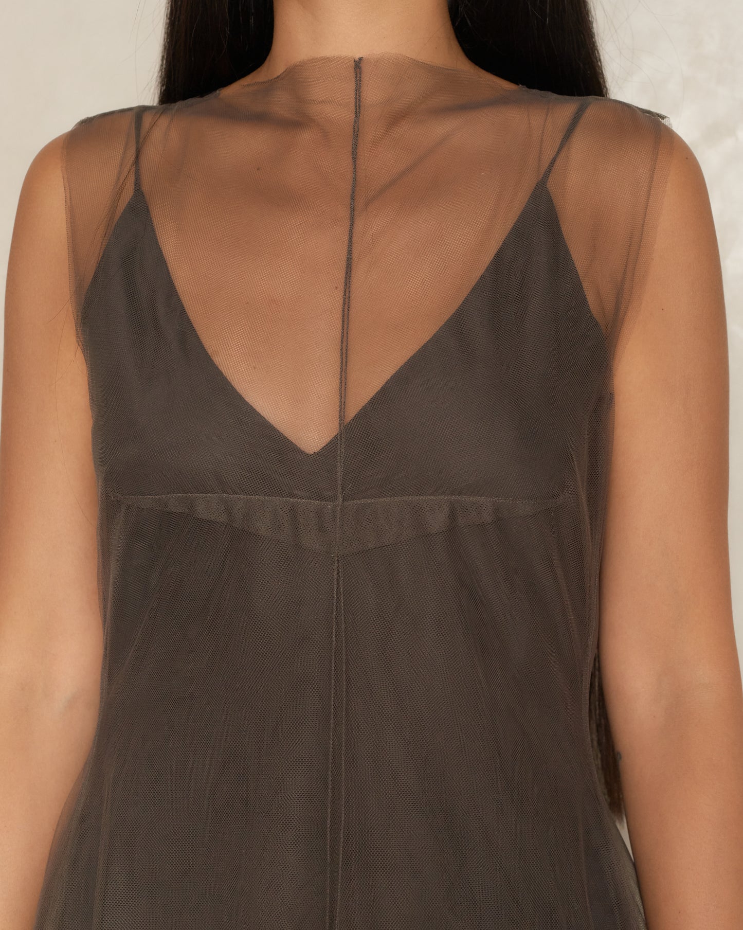 Tulle dress by Marc Le Bihan in mastic. Diaphanous fine tulle crafting with wrinkled pleating opening up to a magnificent twisted plumage. Cross darting over the bust and zipped fastening at the rear. Fine silk slip included and can be worn separately.