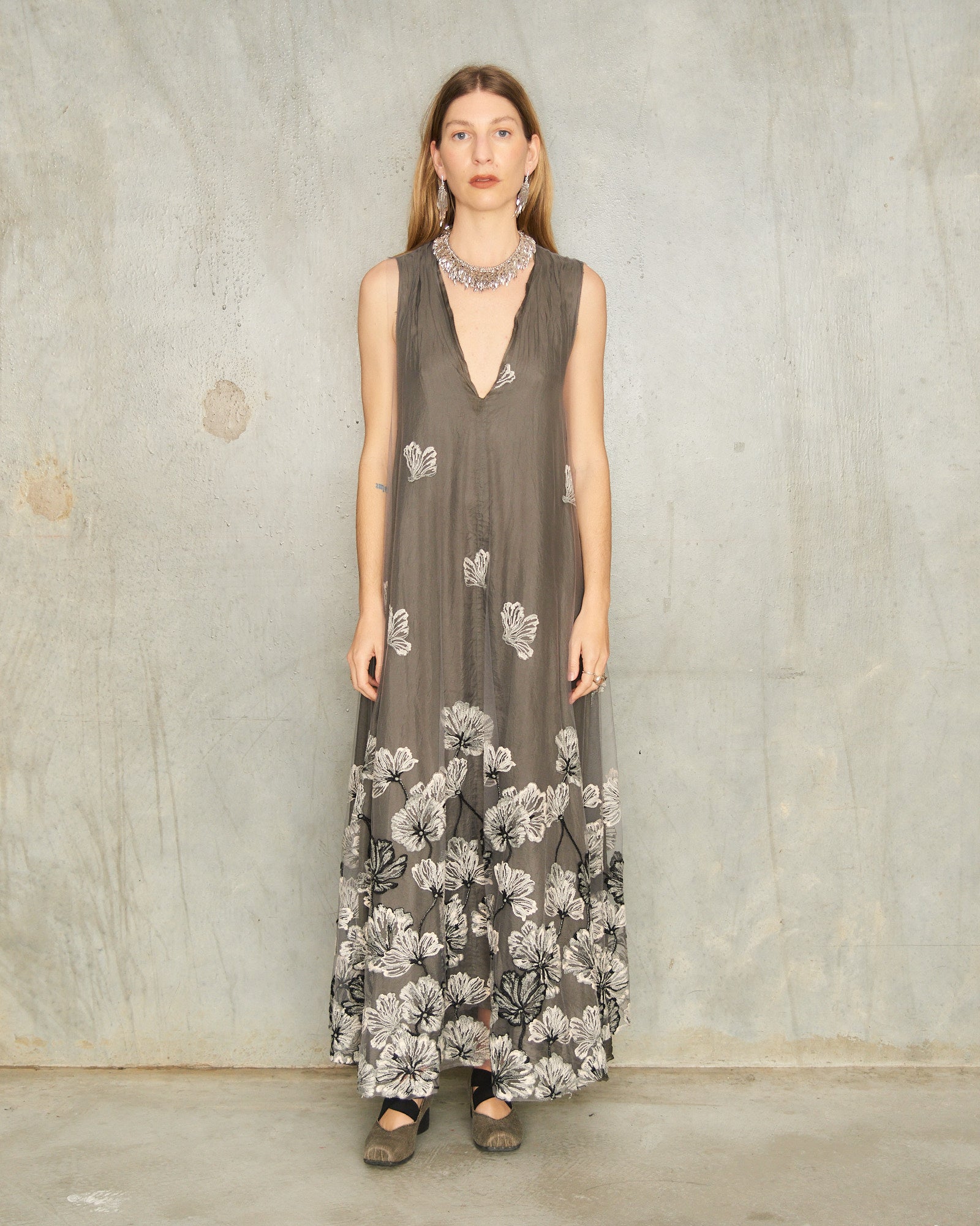 Acier lace dress by Marc Le Bihan in gris. Sleeveless dress with a gracefully plunging neckline, crafted in delicately fine fabric. The voluminous silhouette is anchored by intricate lace detailing at the hem, creating a striking effect.
