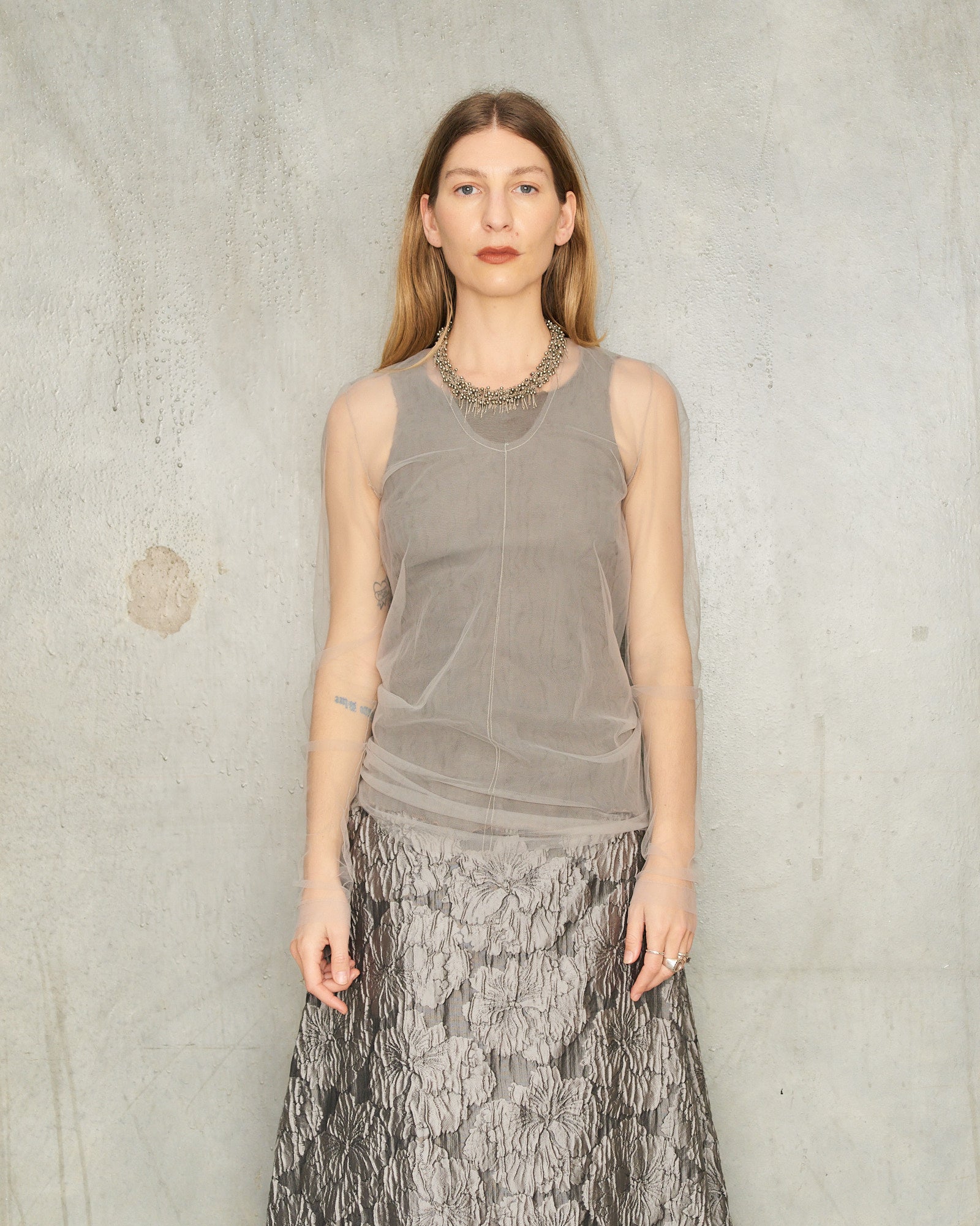 Tulle long sleeve top by Marc Le Bihan in gris. Fine tulle long-sleeved layer finished with raw edges and delicate seams tracing the hems and scooped V-neckline. Brings a romantic, diaphanous touch to any silhouette.