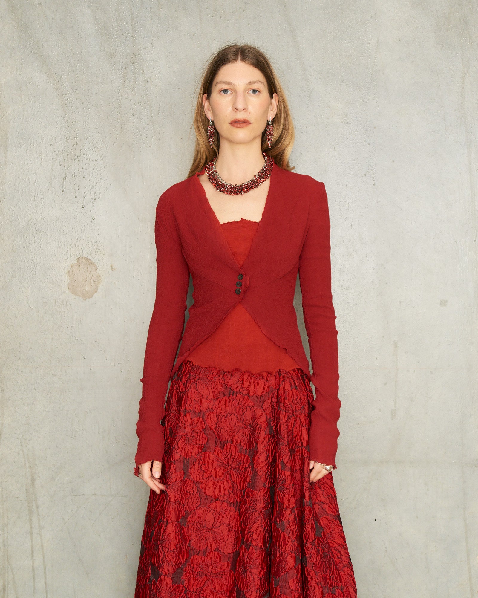 Stretch cardigan by Marc Le Bihan in gun red. Slender, figure-hugging cardigan in tactile silk crepe de chine with supple stretch. Minimal button closure cinches the waist, sculpting the bust, while long fitted sleeves taper to diagonally cut cuffs. Raw, unfinished hems reveal the artisan’s hand.