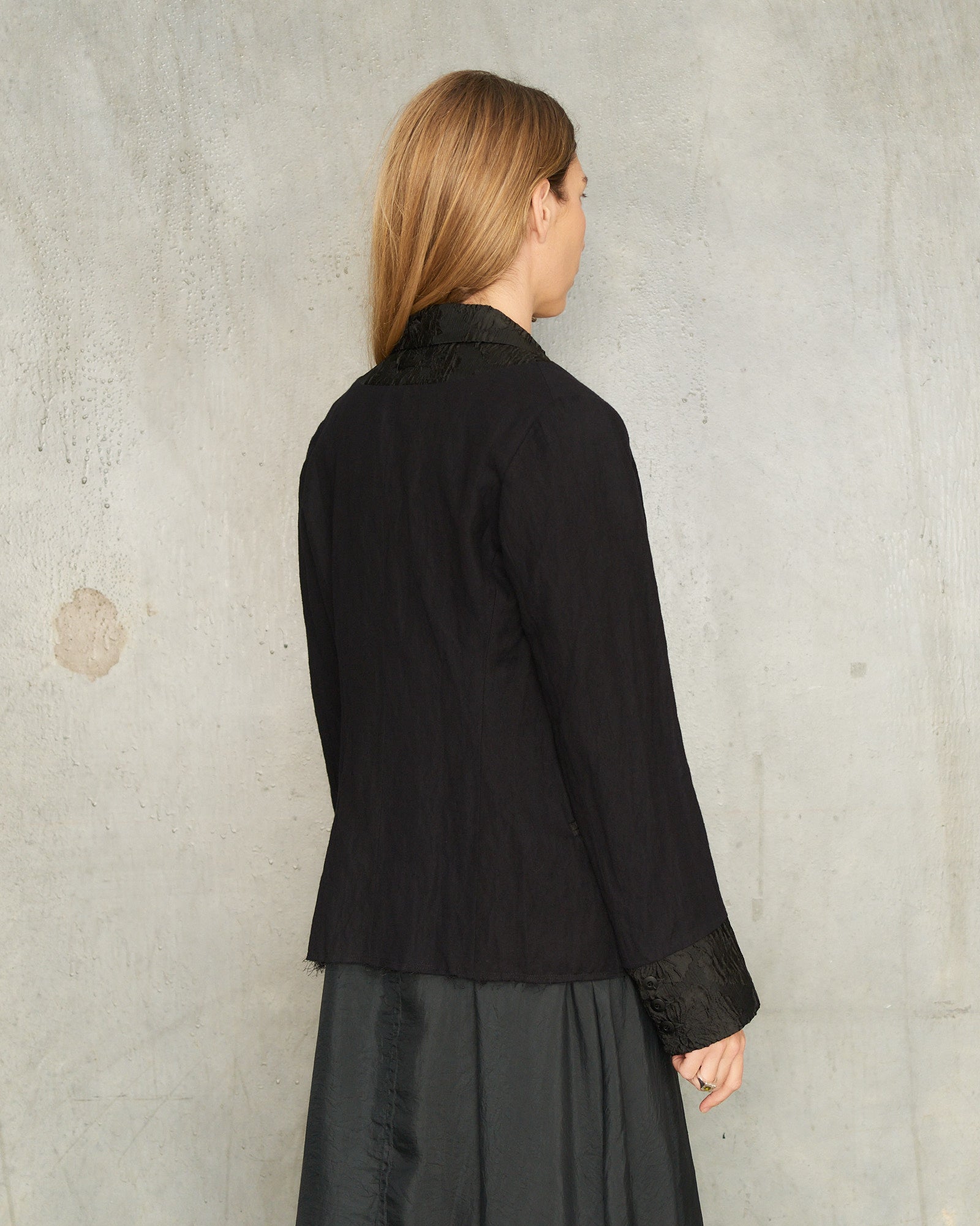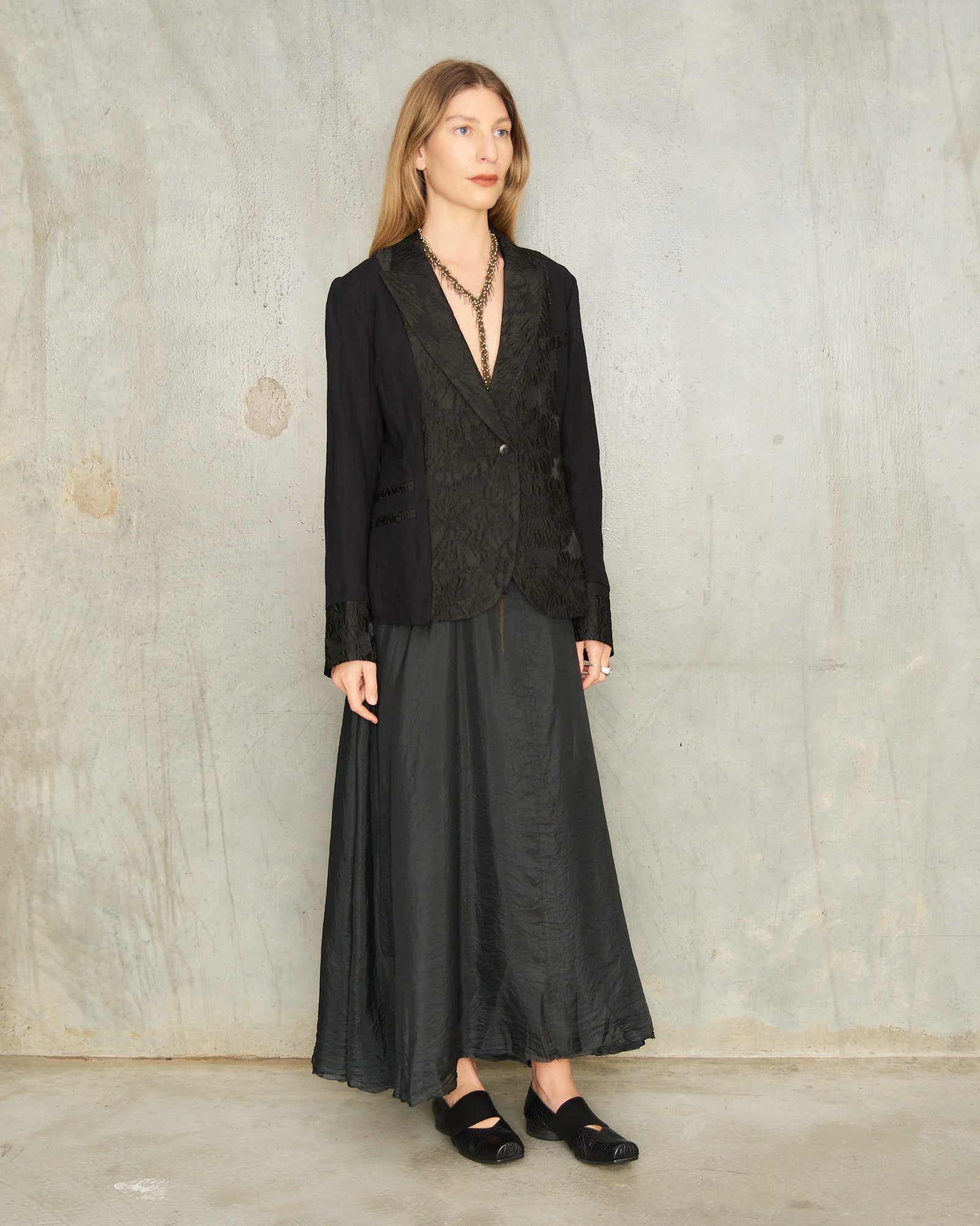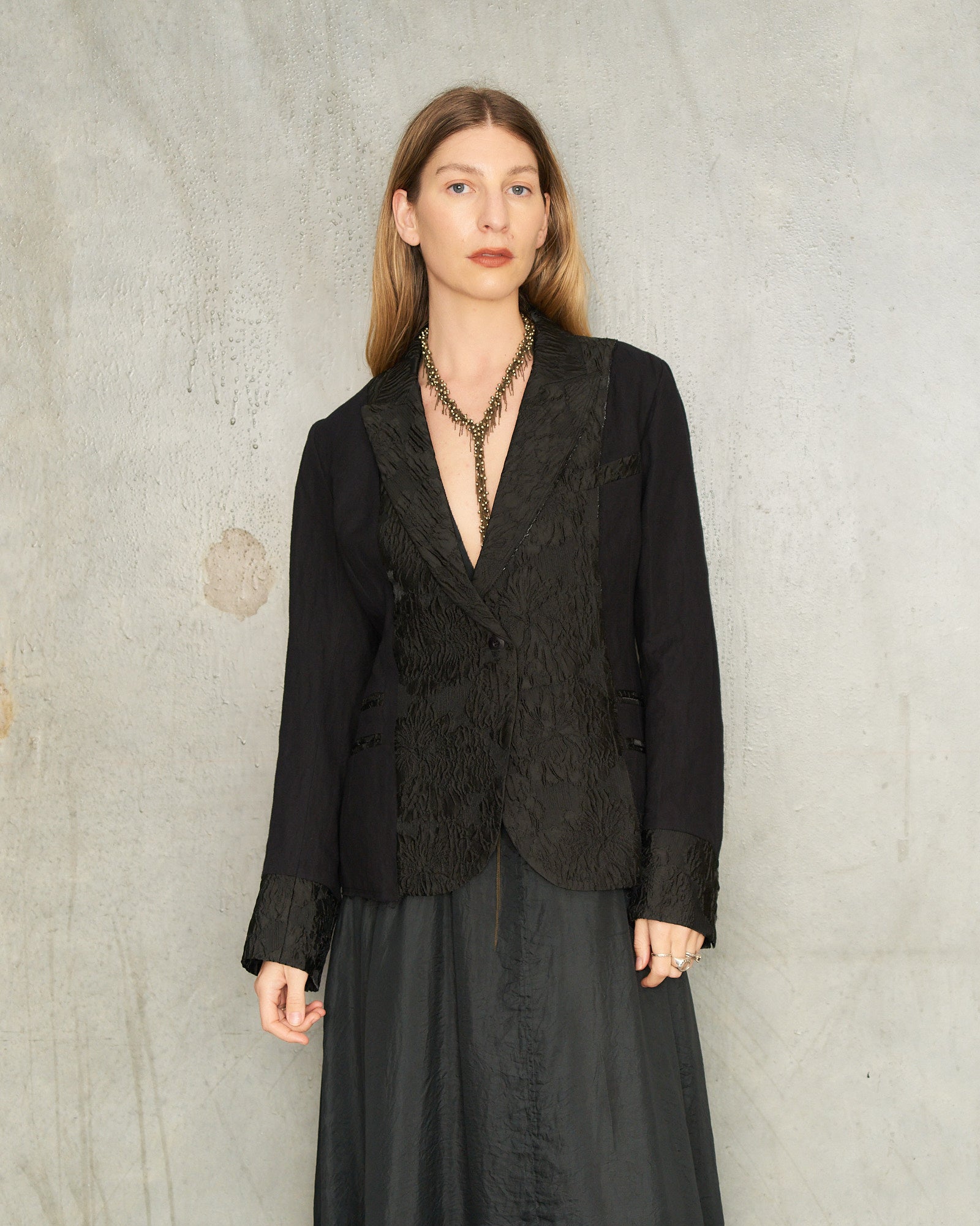 Floral cut blazer by Marc Le Bihan in noir. Sharply spliced blazer distinguished by wide peak lapels and a tailored cut. Ornate floral brocade enriches the central panel and cuffs, lending opulent texture, while a single button closure refines the silhouette.
