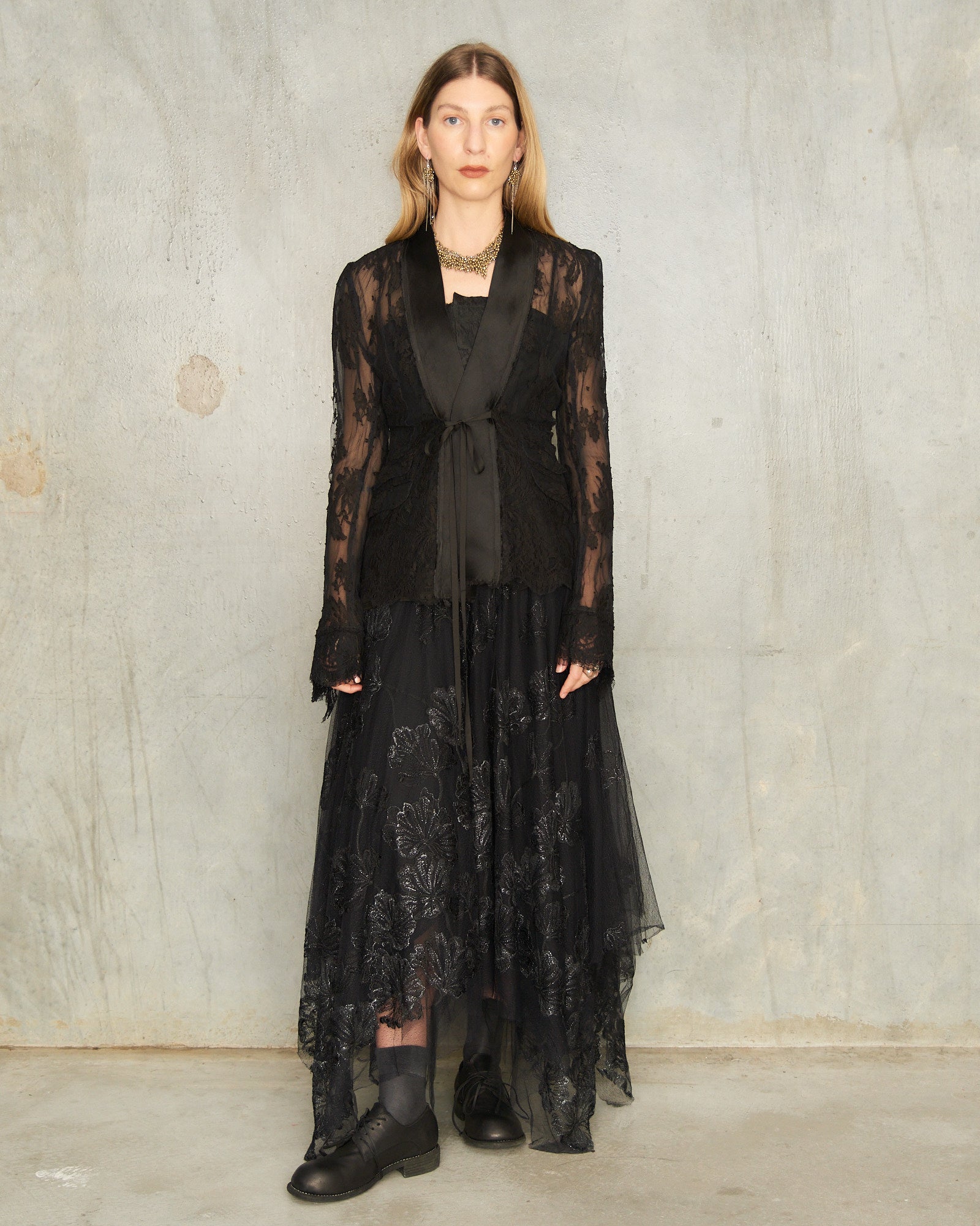 Lace jacket by Marc Le Bihan in noir. Fitted, sensuous jacket in sheer black mesh lace, accented with lustrous satin lapels. Ribbon tie closure and subtle artisanal touches complete the elegantly crafted piece.