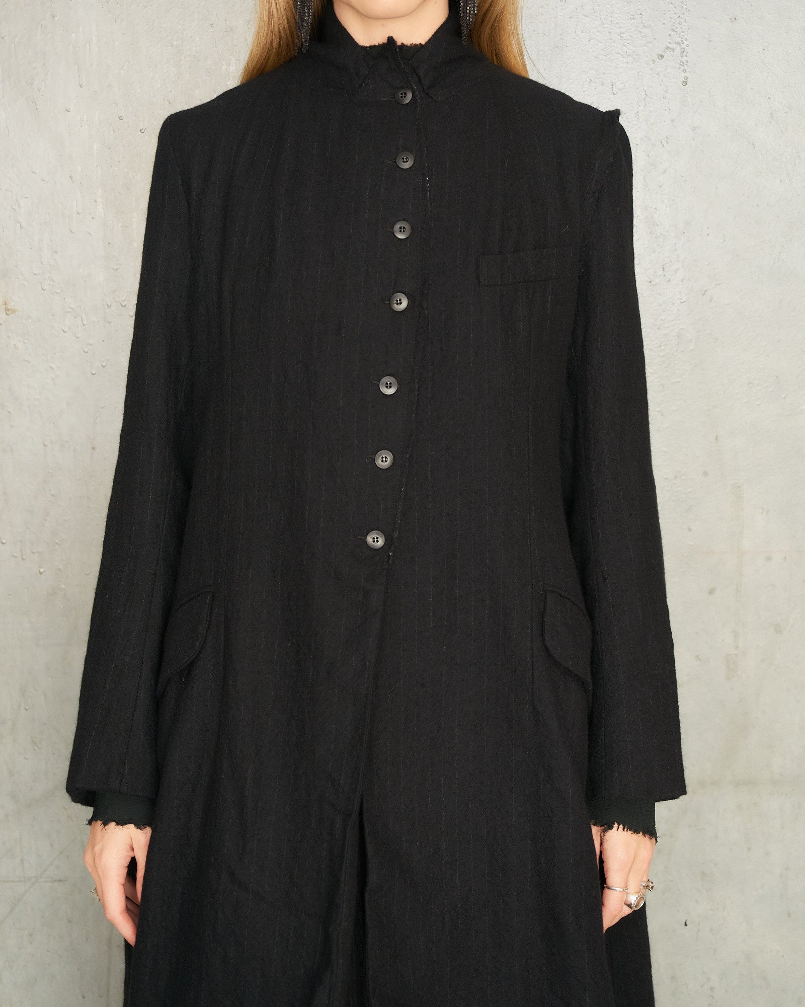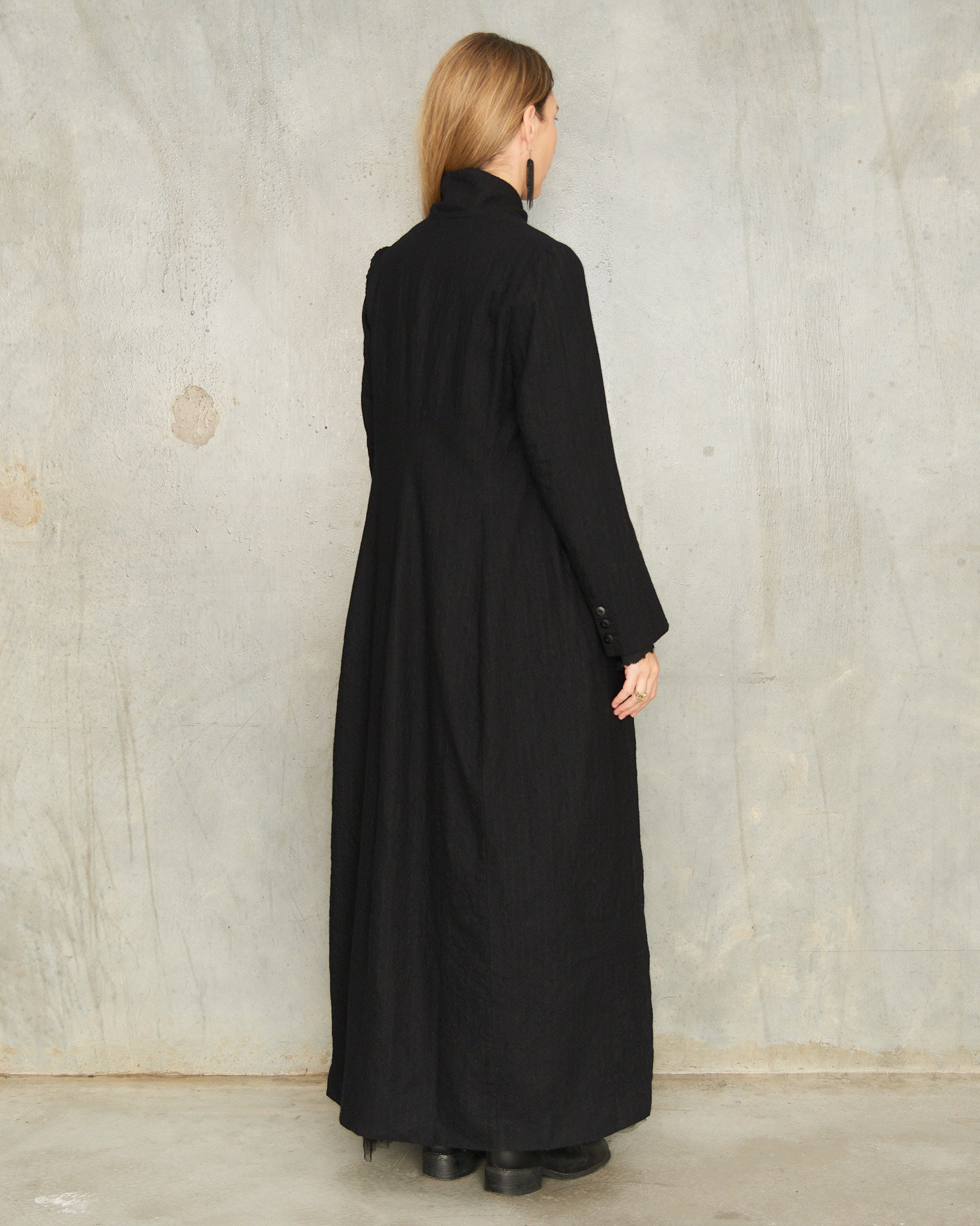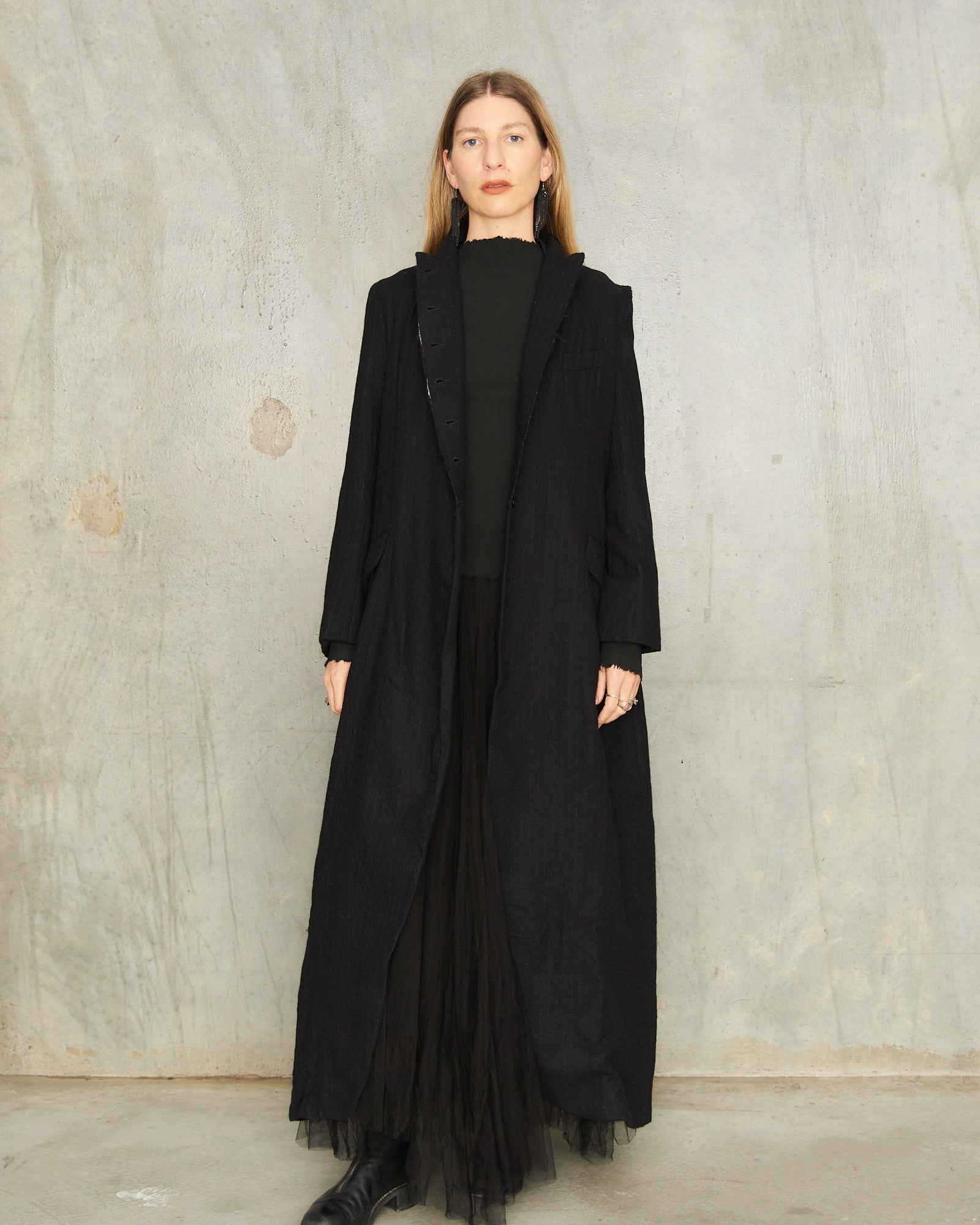 Tailored open coat by Marc Le Bihan in noir. Commanding floor-length coat in luxurious pinstriped wool. Fitted through the waist and flaring to a voluminous hem, the lapels can be buttoned to the neck or left open for relaxed drama.