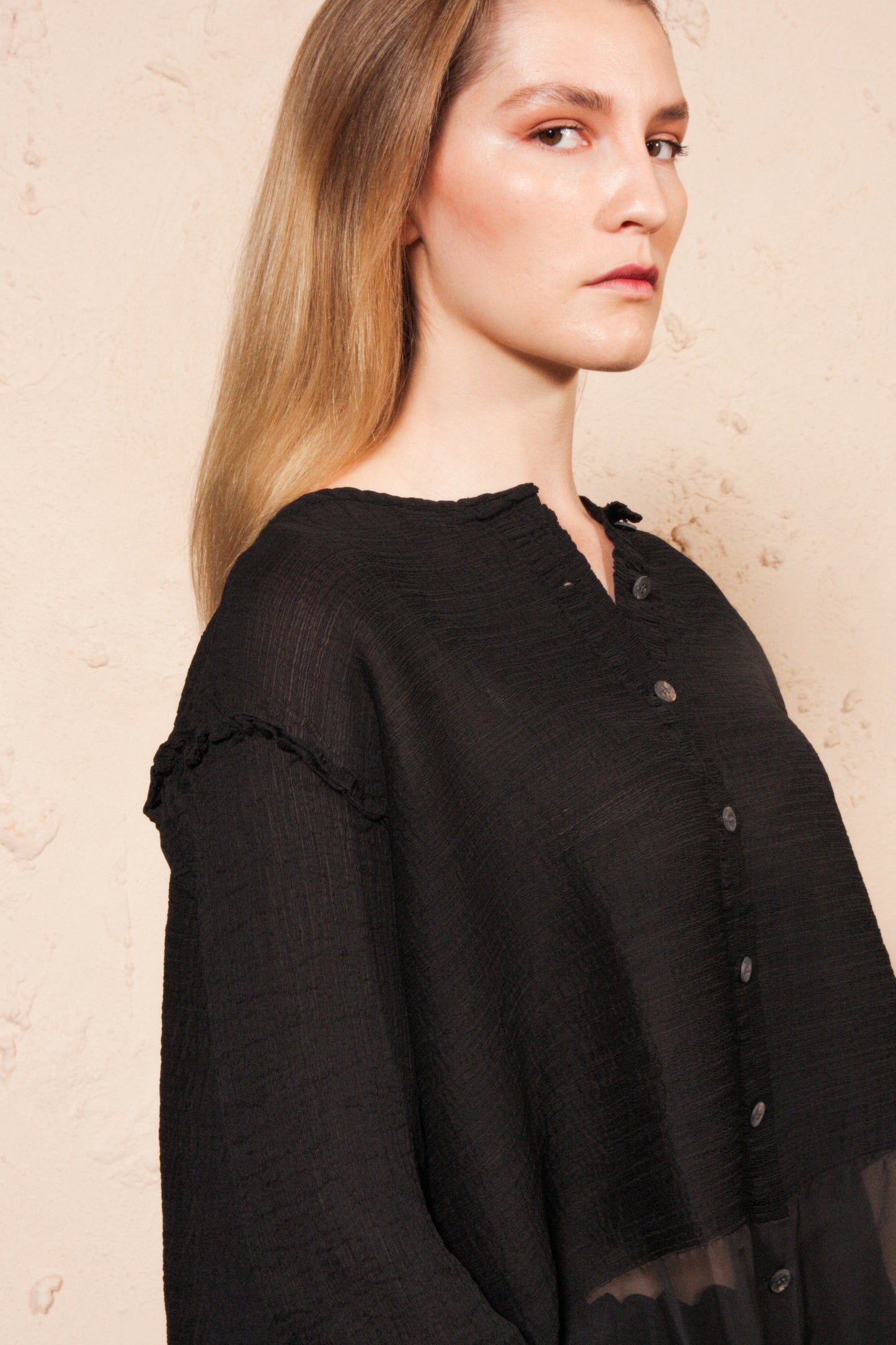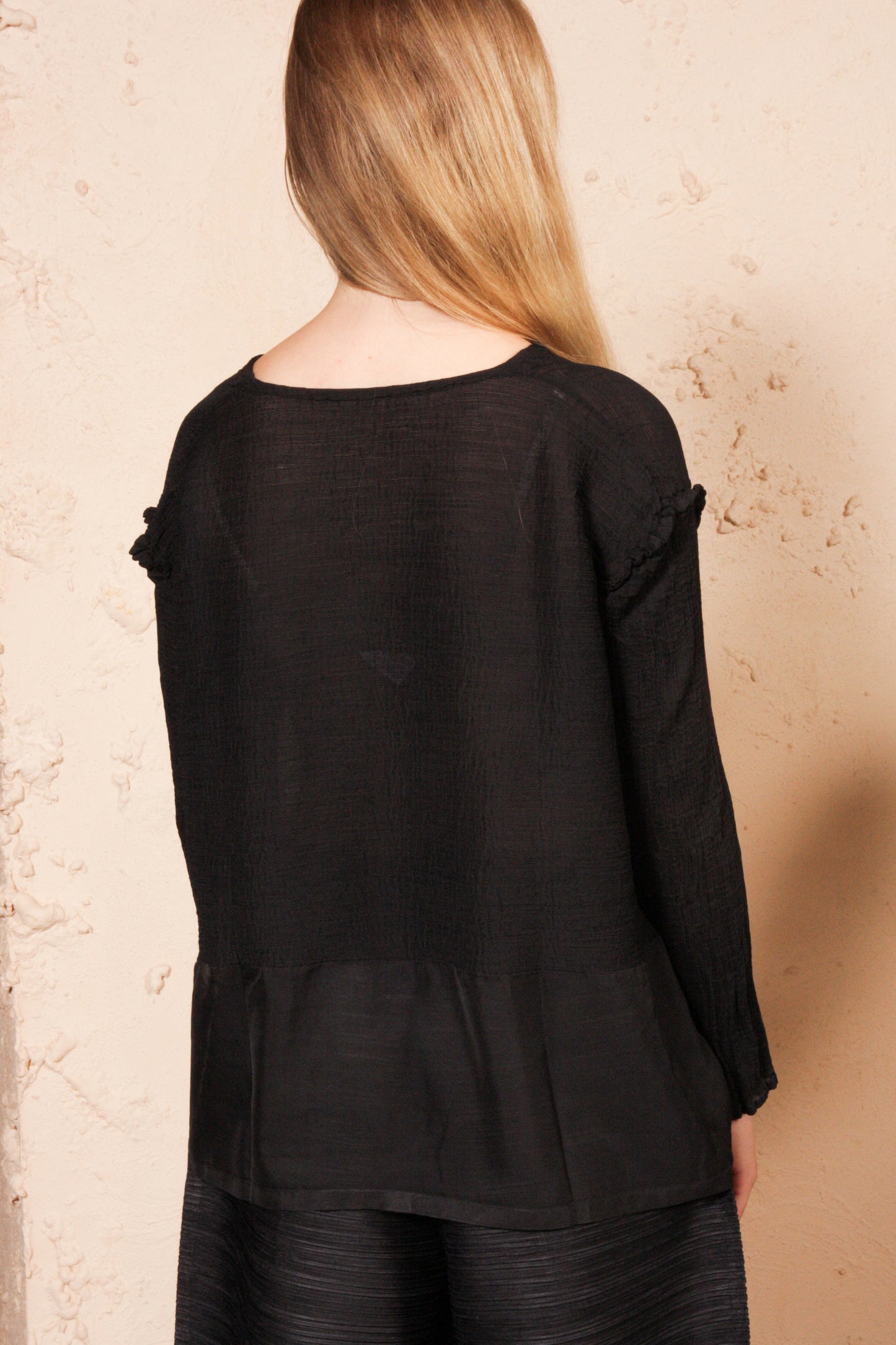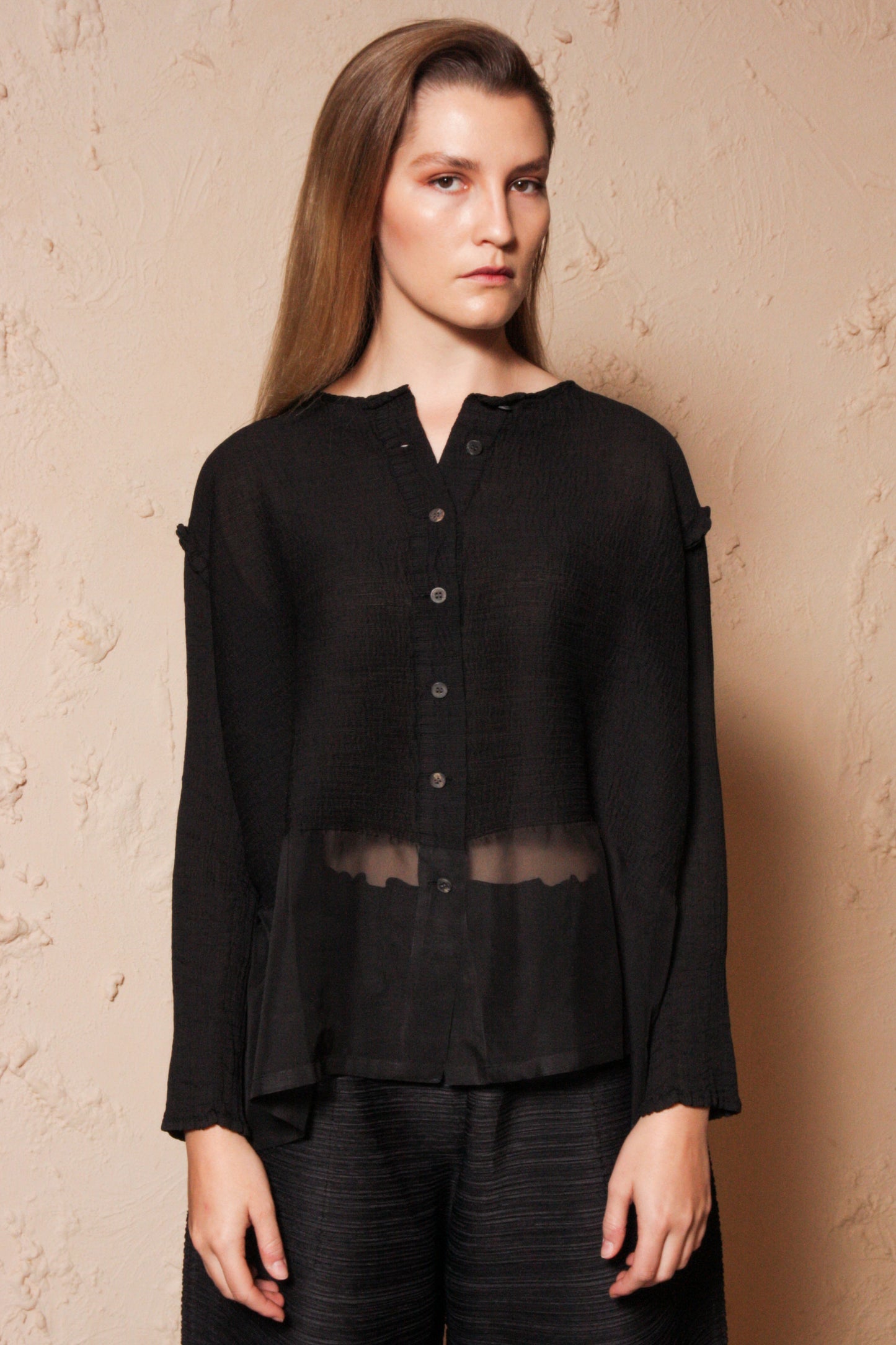 Issey Miyake ME blouse in an intricate black crepe fabric. Features a crew neck, button down front, long sleeves and a sheer panel at the bottom.