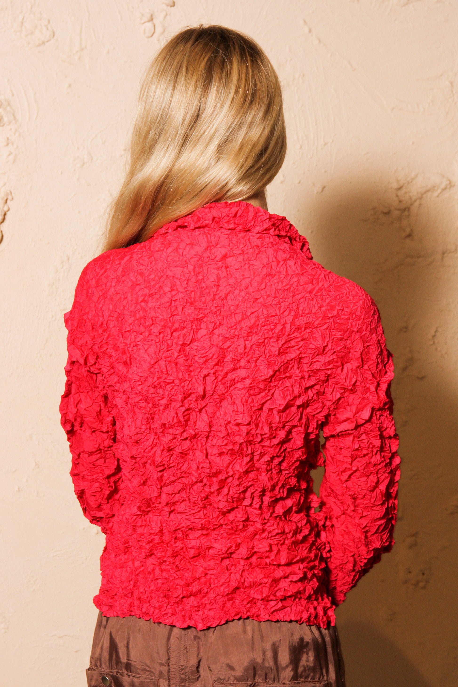 Meringue textured button up shirt by Issey Miyake ME in vivid pink. Lightweight and delicate construction make this a distinctive and unique piece for everyday wear.