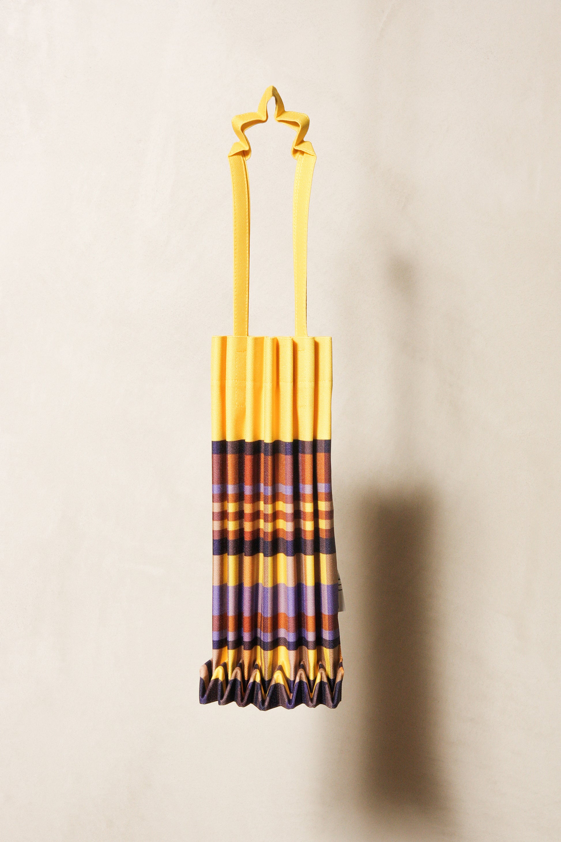 Mini tote bag by Issey Miyake ME in yellow pleated check. Petite size perfect for brisk or unexpected excursions, with a delightful and whimsical check pattern.