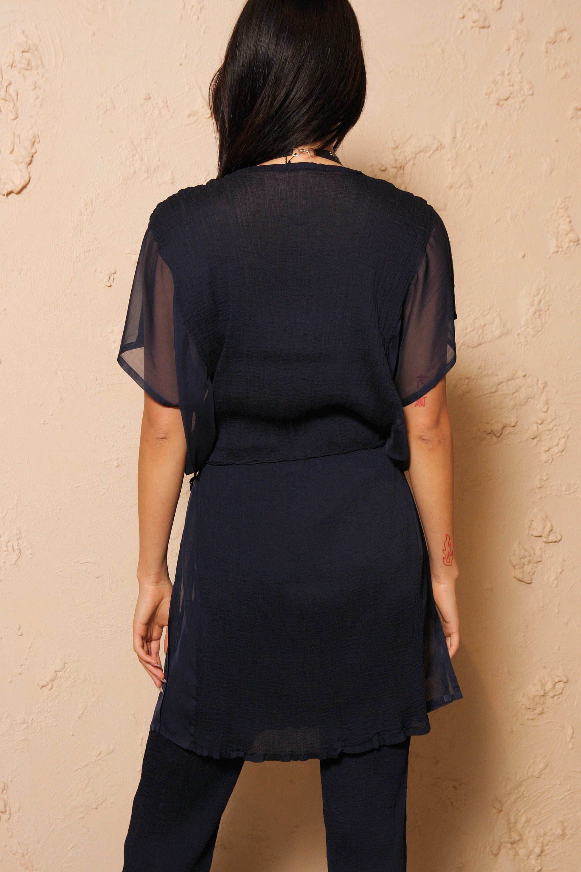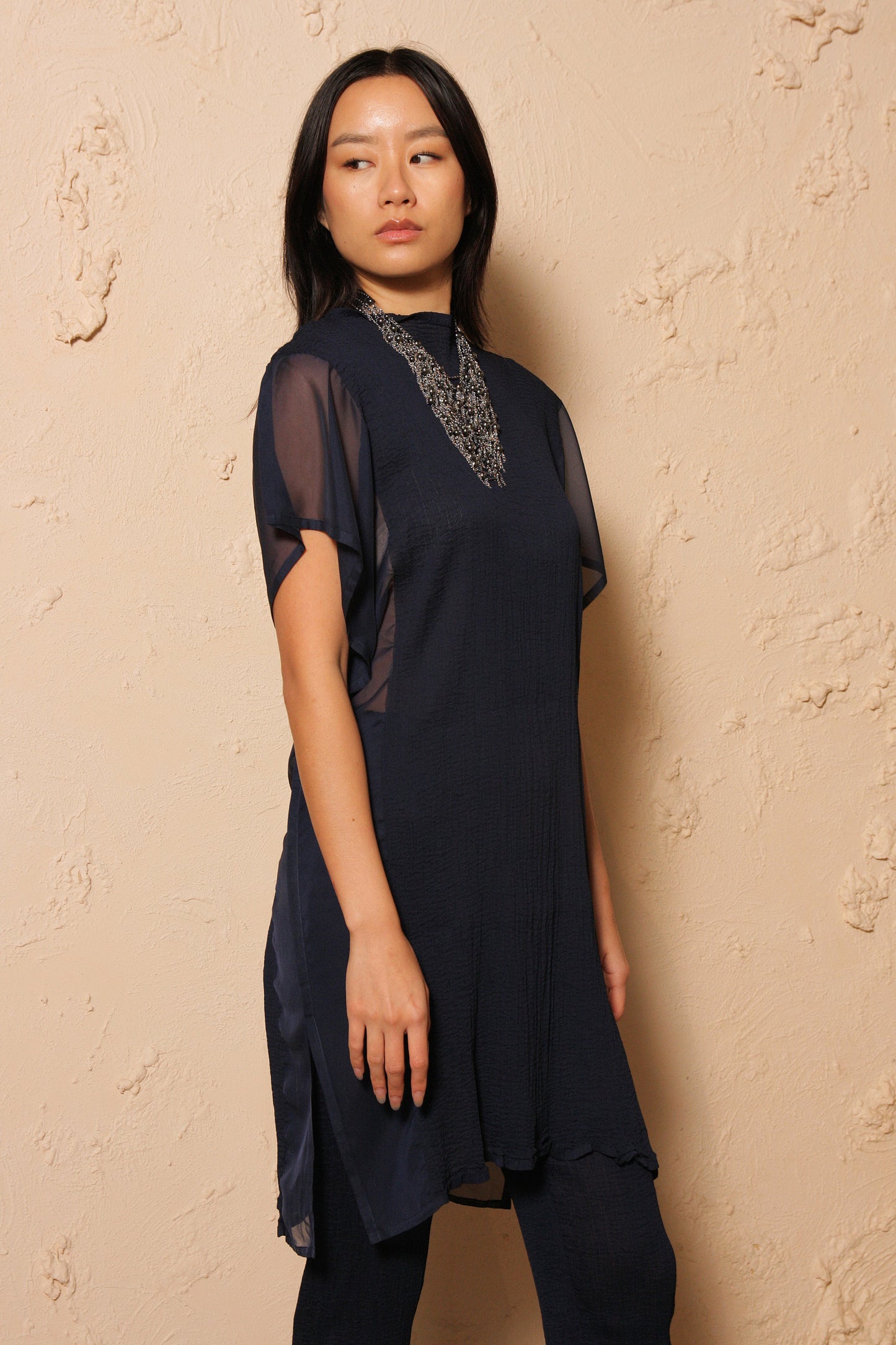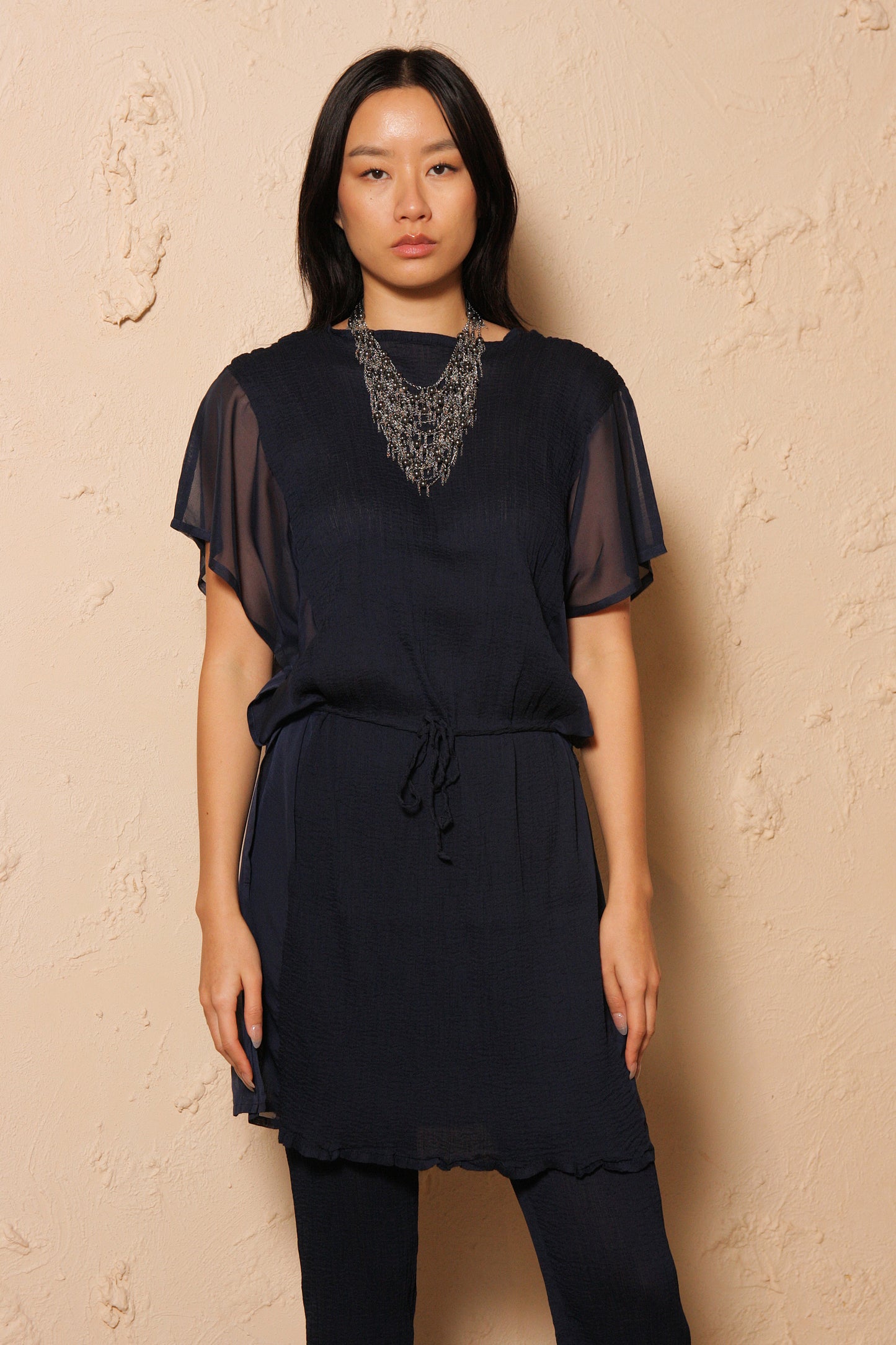 Panelled tunic by Issey Miyake ME in navy. Front and back consists of fine crepe pleating while shoulders fall to delicate sheer panels, and waist tie gives a fitted shape. High neck and elegantly flowing silhouette.