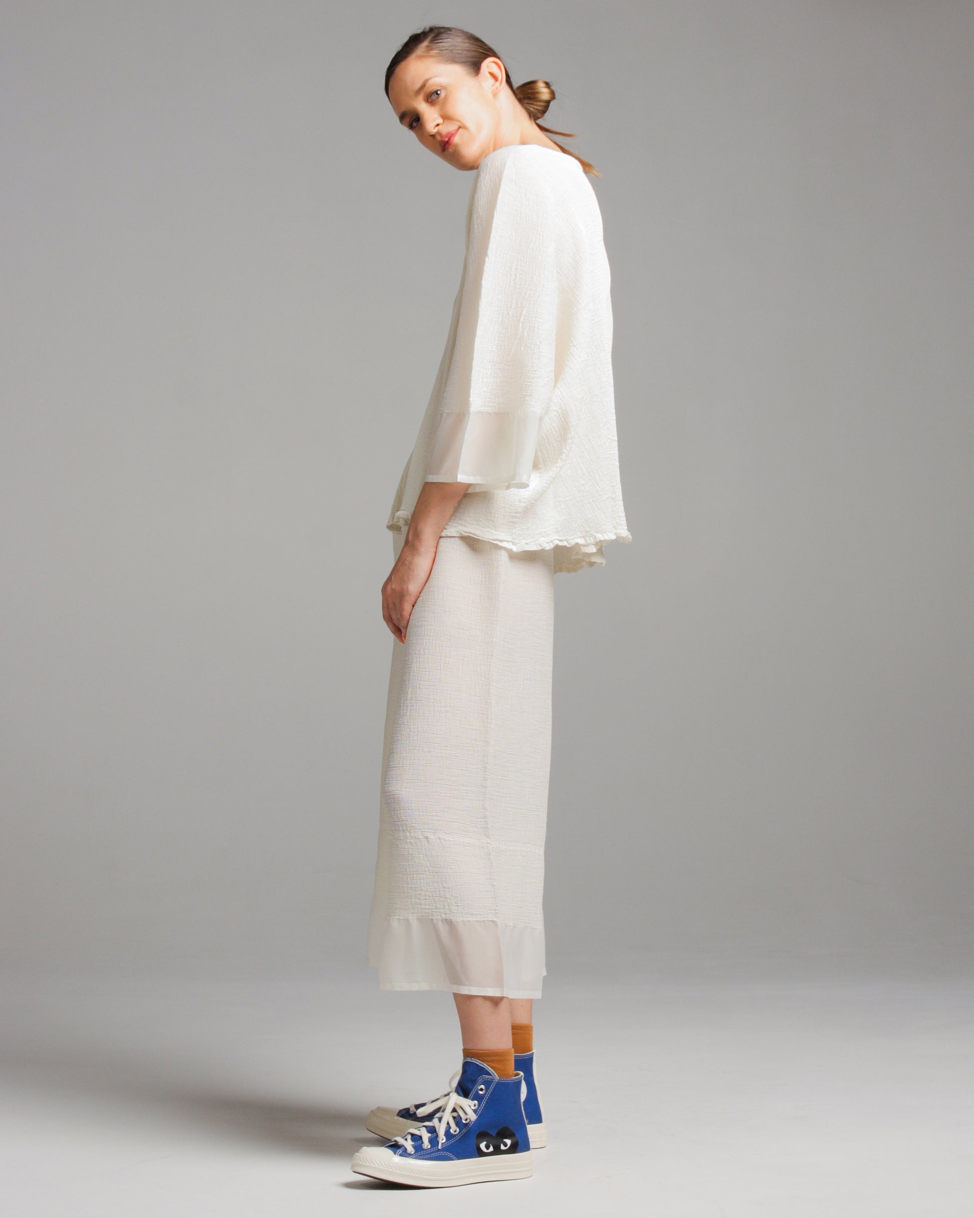 Crepe cropped pants by Issey Miyake ME in cream. Comfortably wide-fitting pants in a near-sheer polyester crepe. Woven with a twisted yarn to give its delicately crinkled texture. Fine mesh panels at the hems lighten the look with flair.