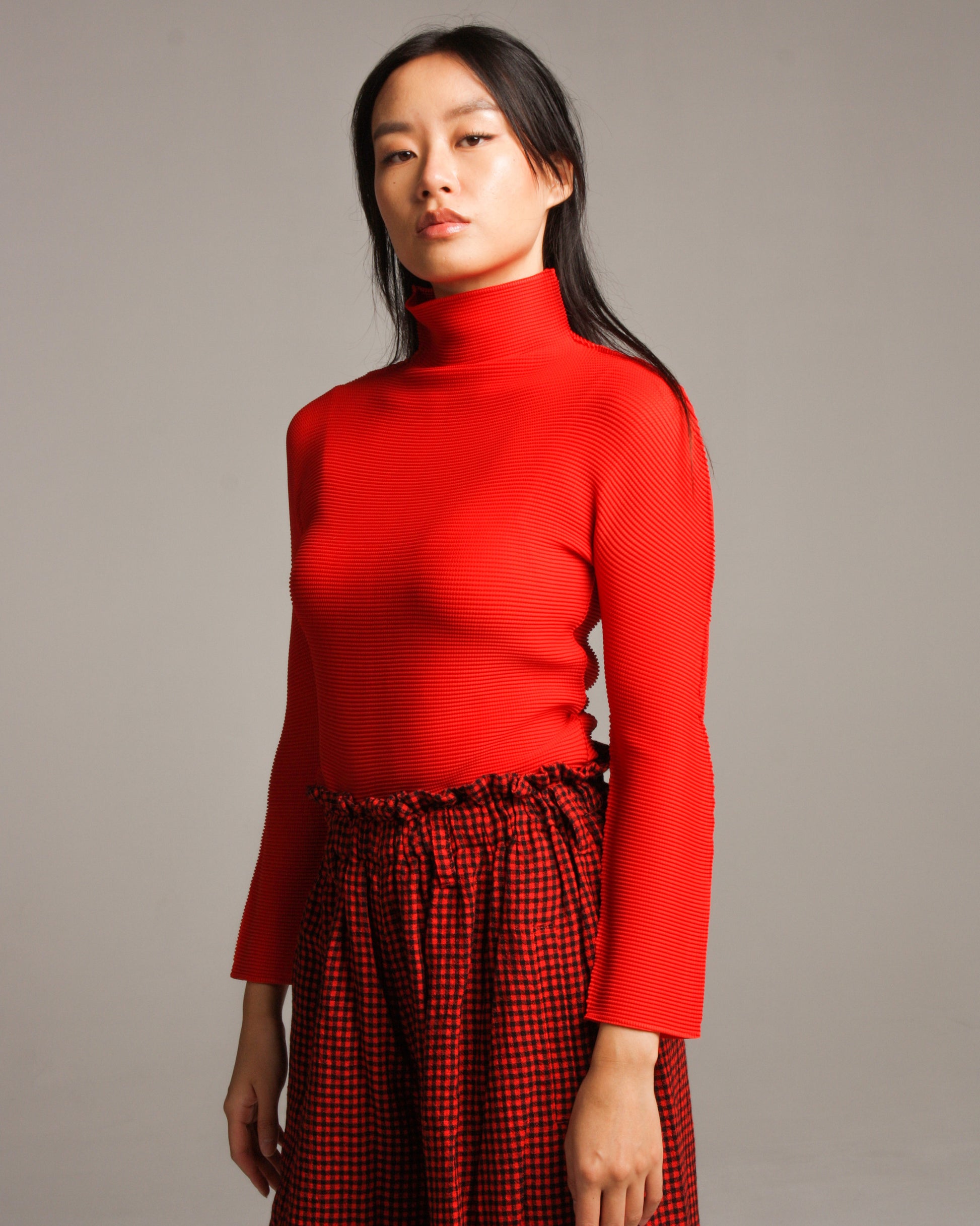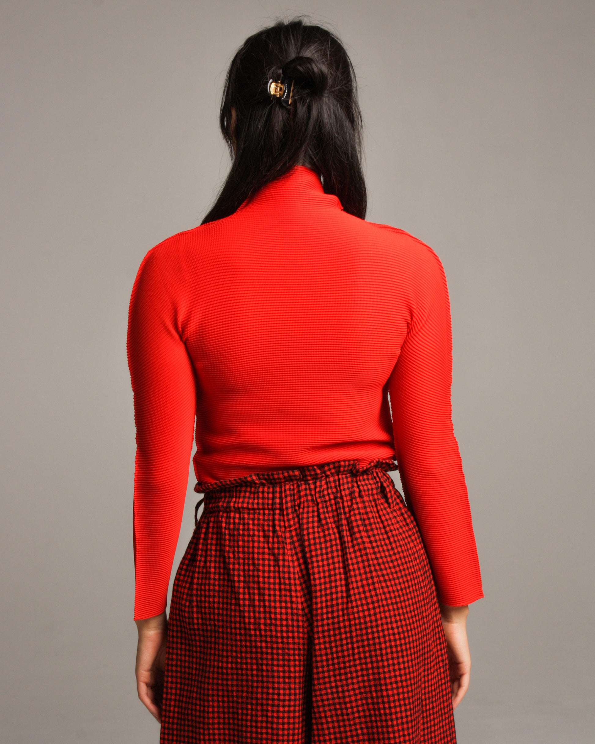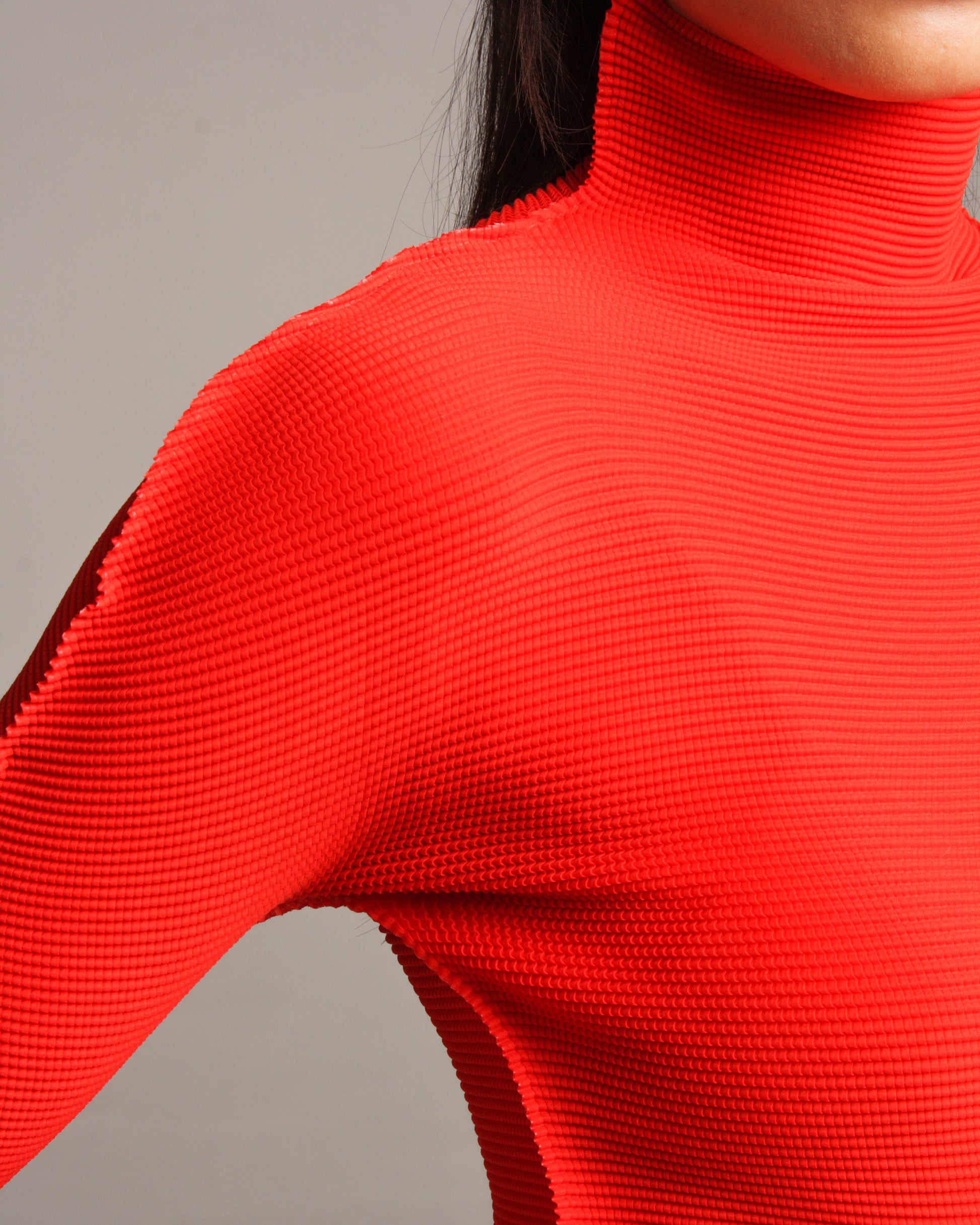 Stretch pleats long sleeve top by Issey Miyake ME in red. Classic high neck top in a striking crimson. Stretch micropleating gives in all directions, retracting to make a delicately textured surface.