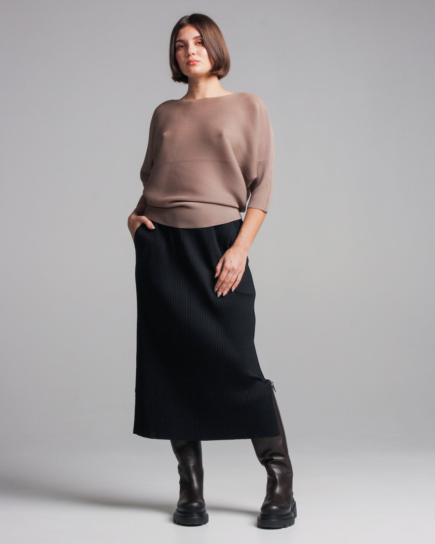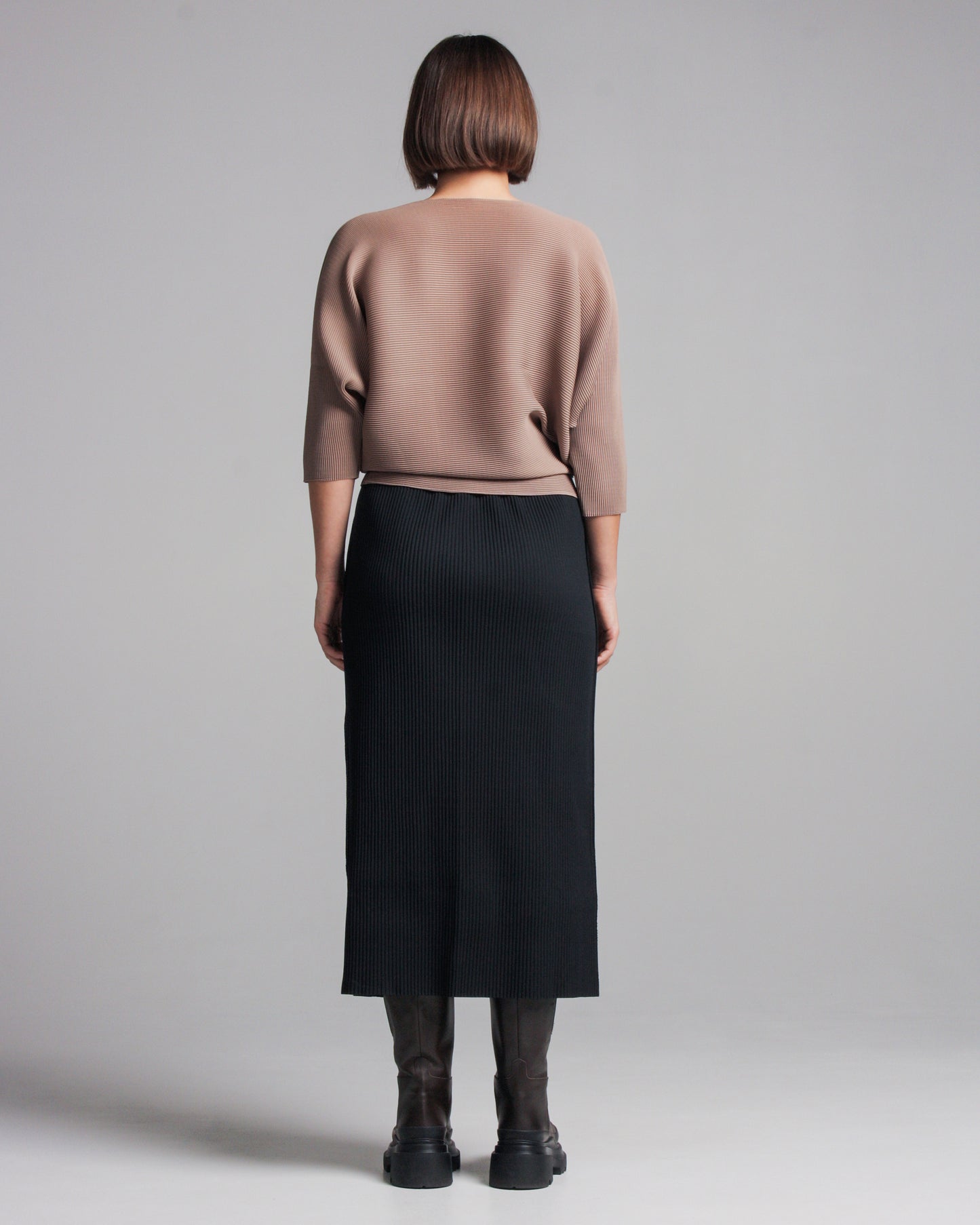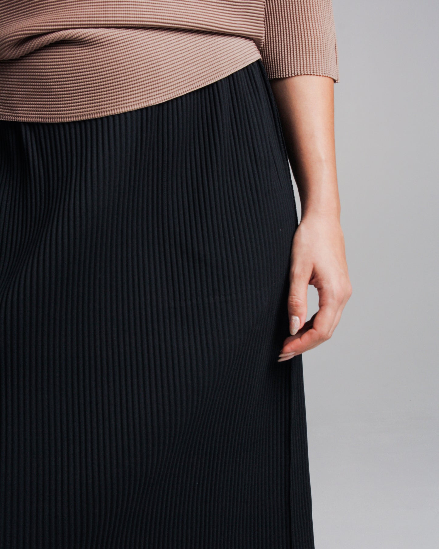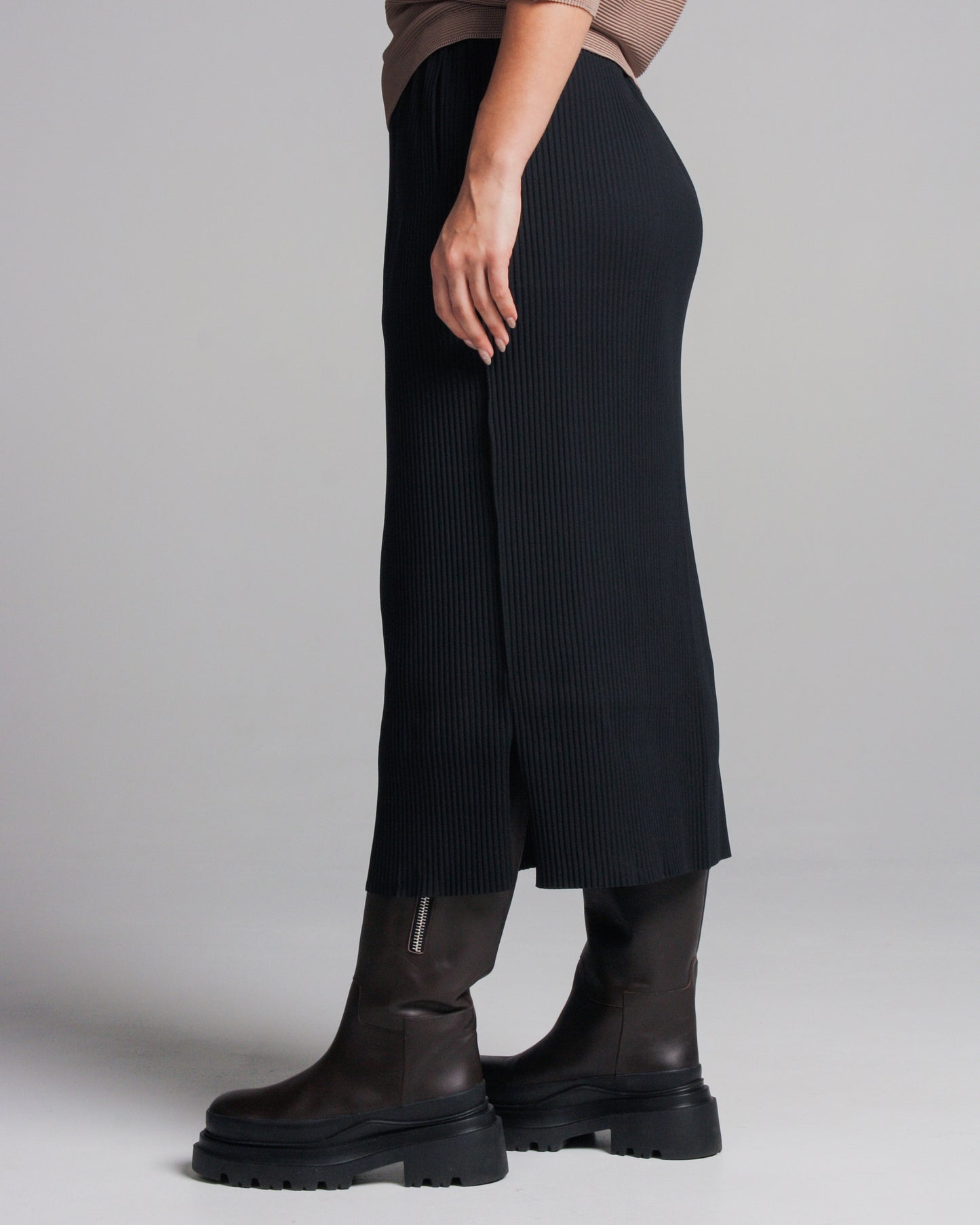 Fine knit skirt by Issey Miyake ME in black. Softly ribbed texture in a midi length skirt. Classic straight fit, complete with elastic waistband, two side pockets and slits at the side seams.