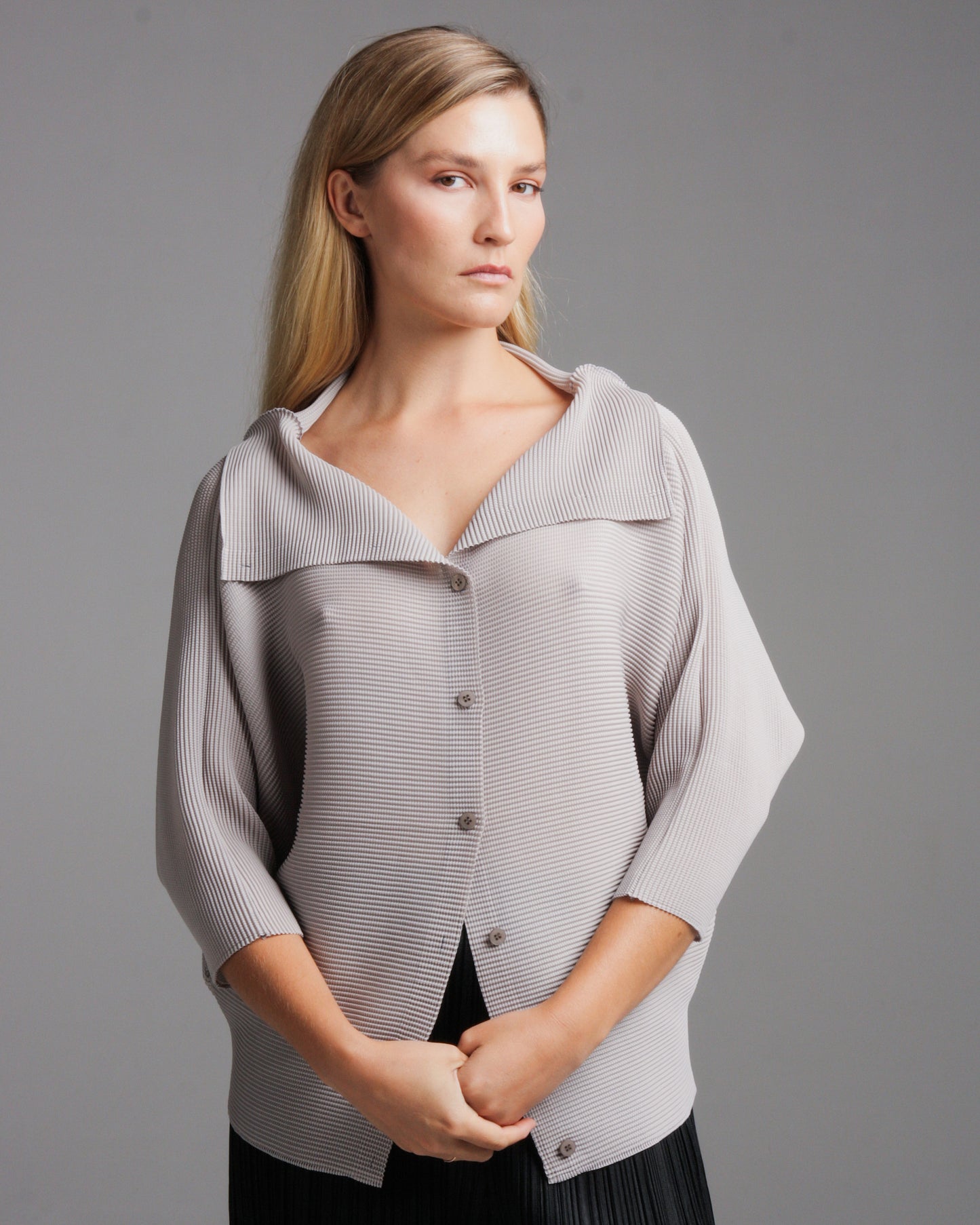 Classic dolman cardigan by Issey Miyake ME in grey. Delicate micropleating with stretch in all directions. Buttons up to a relaxed open collar. Inverted side seams and half dolman sleeves round out the silhouette.
