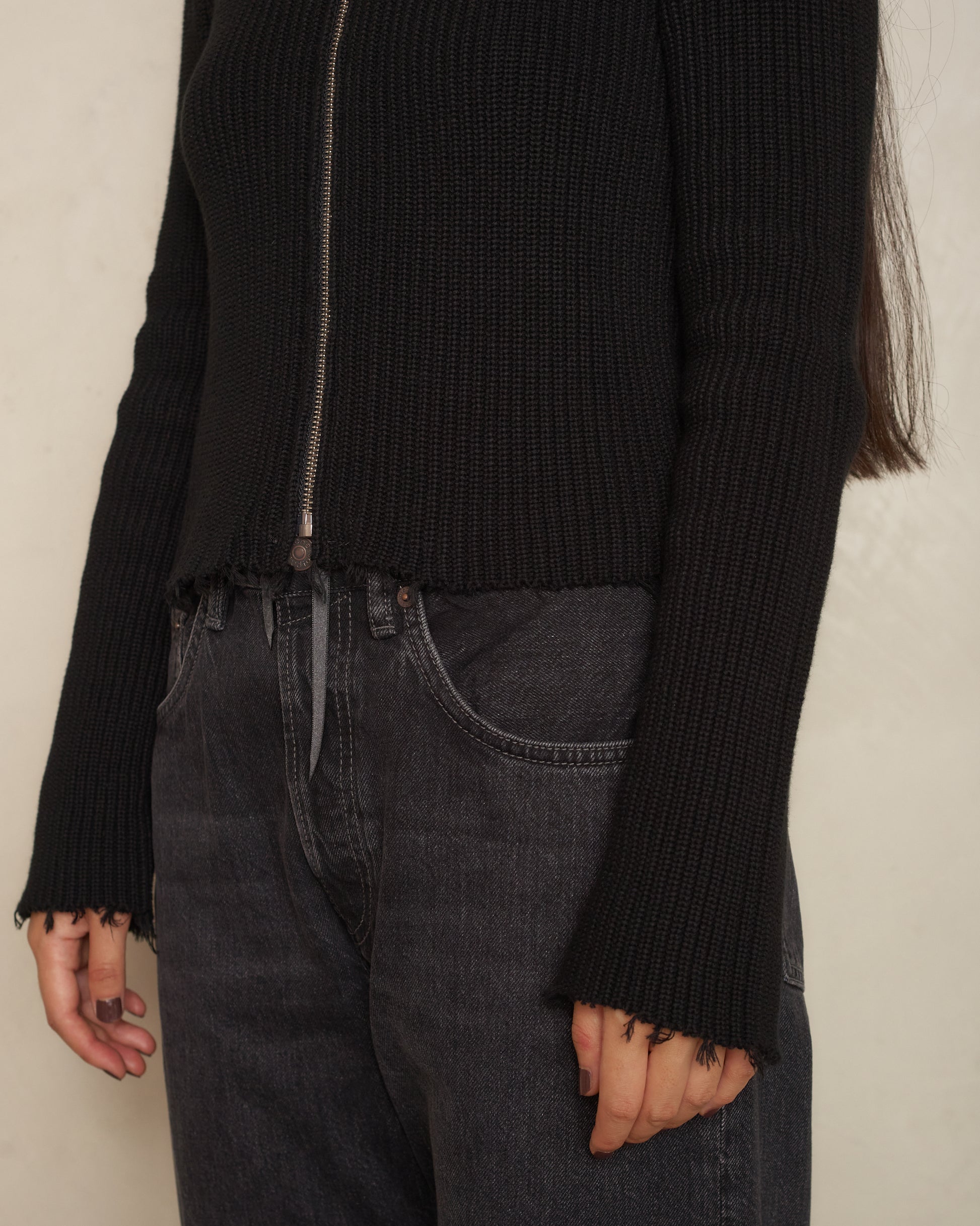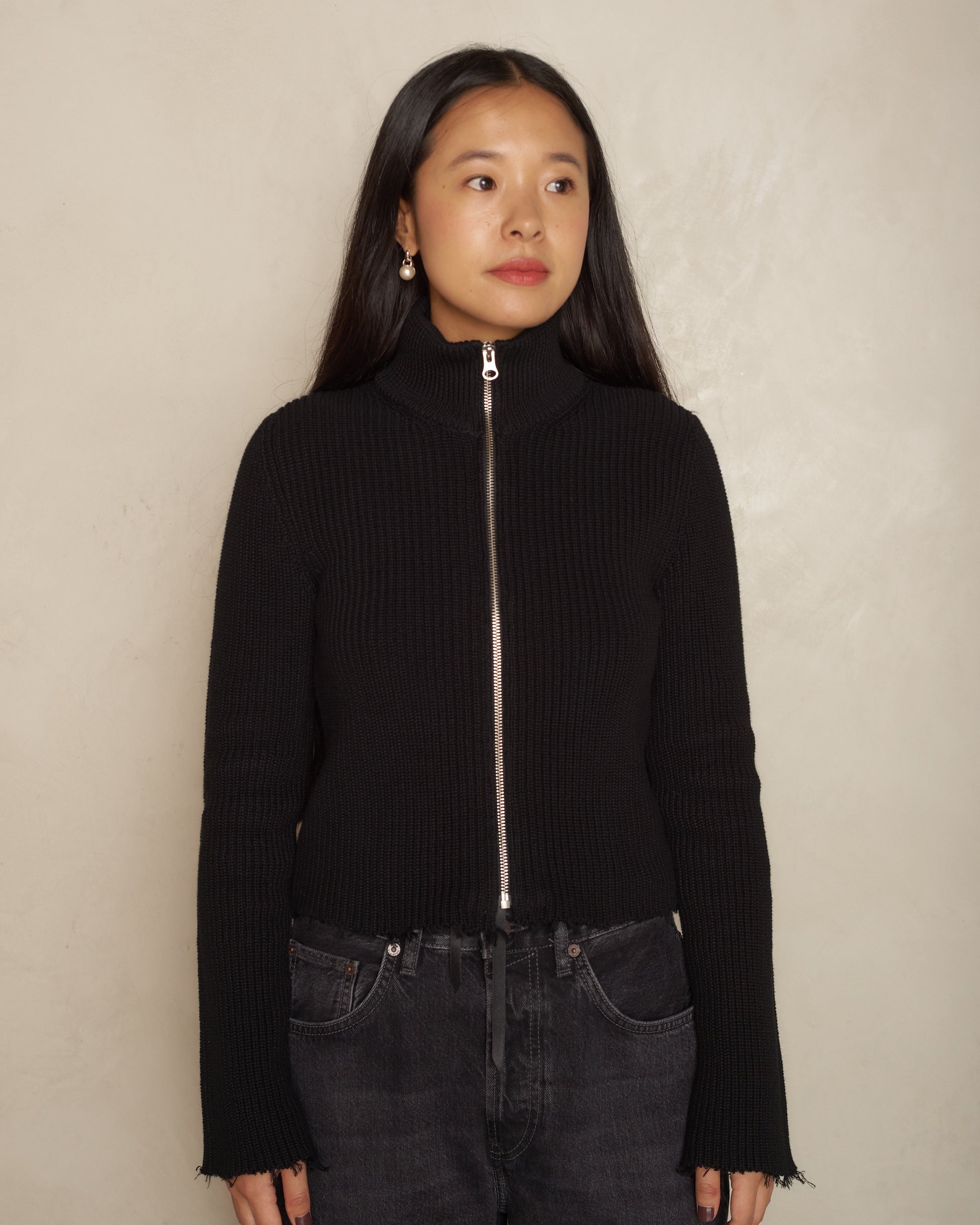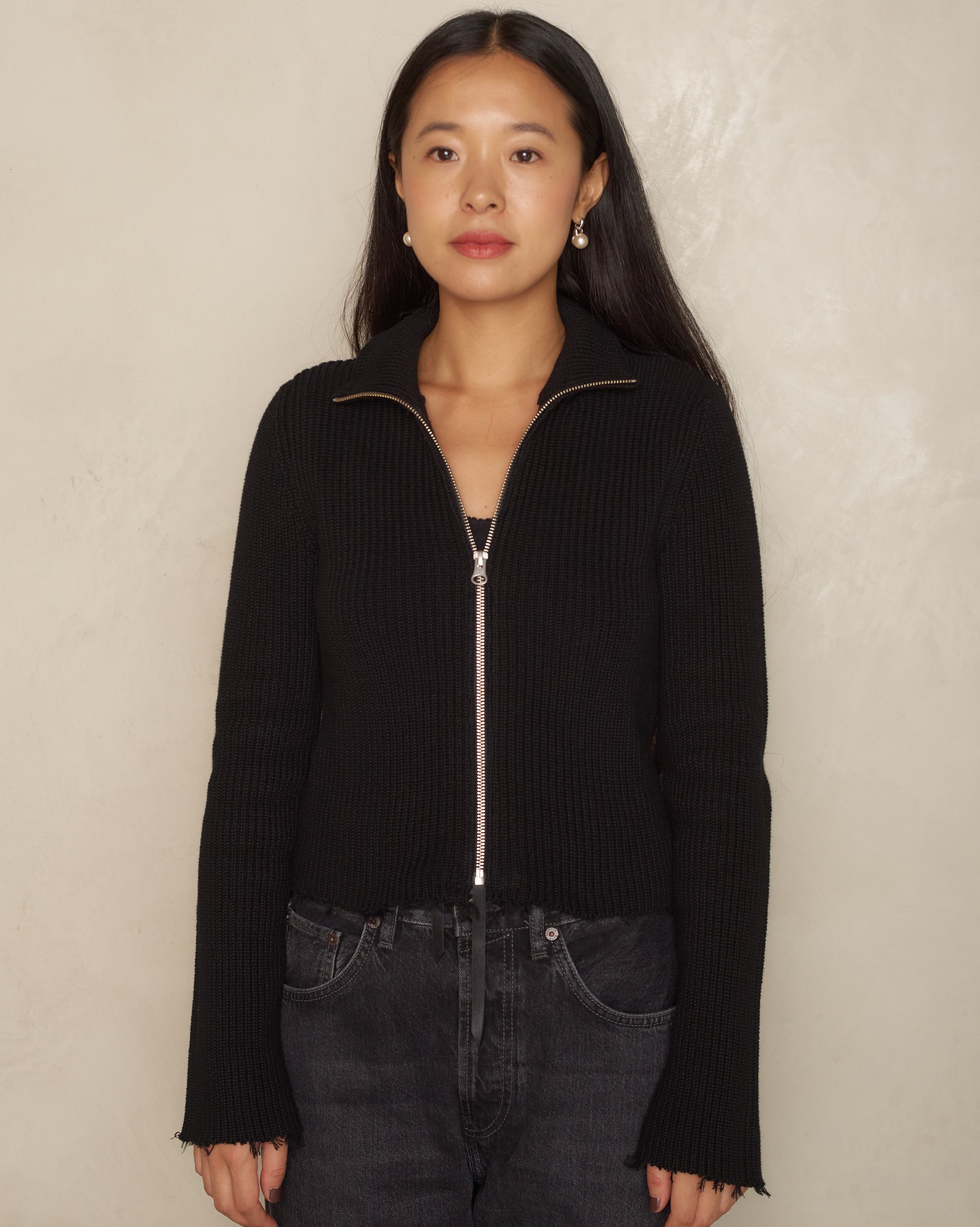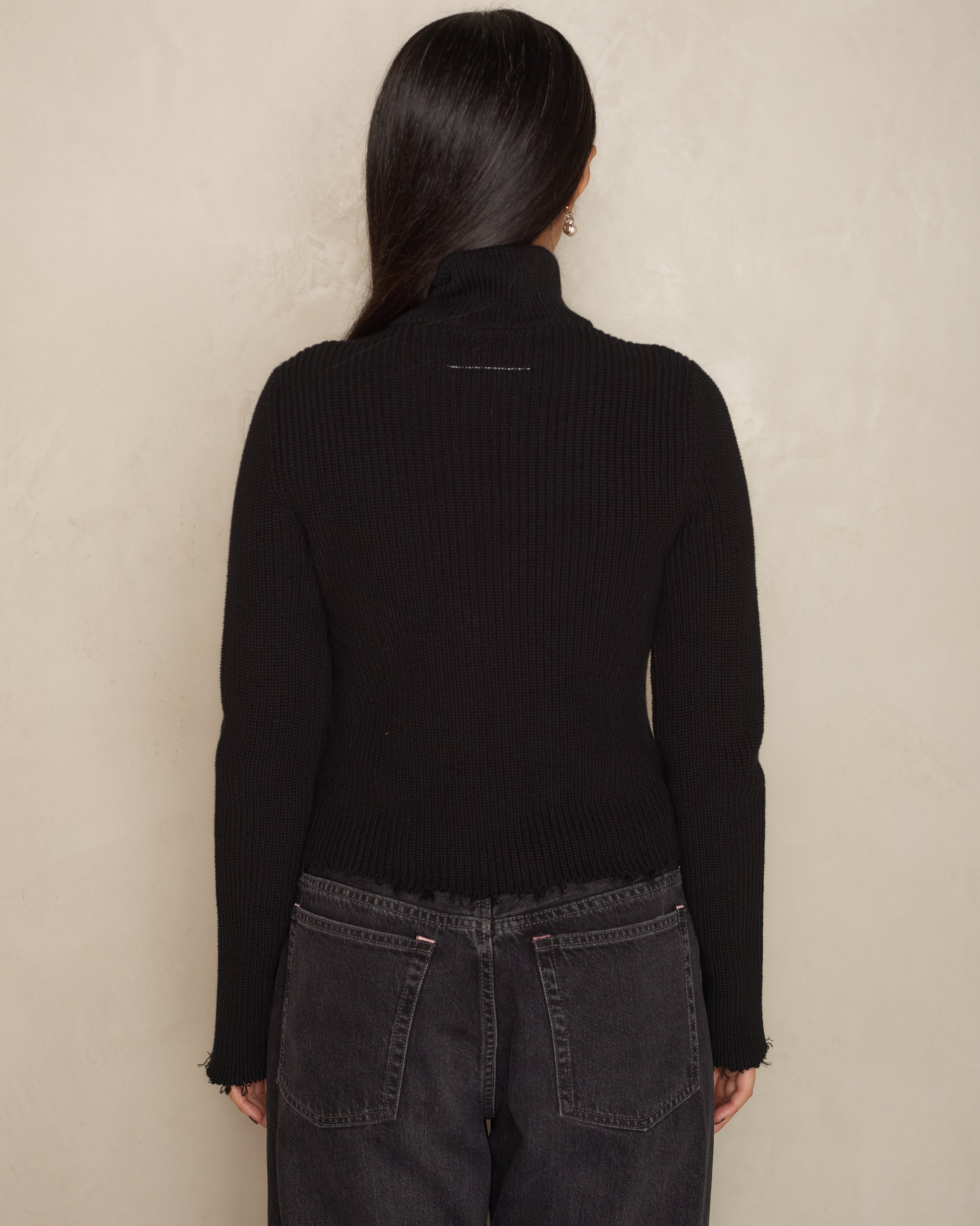 High neck zipped cardigan by MM6. Knitted camionneur jacket in sumptuous cotton. Softly stretchy ribbed knit provides an elegant form fit, detailed by frayed unravelling along the hemline and cuffs.