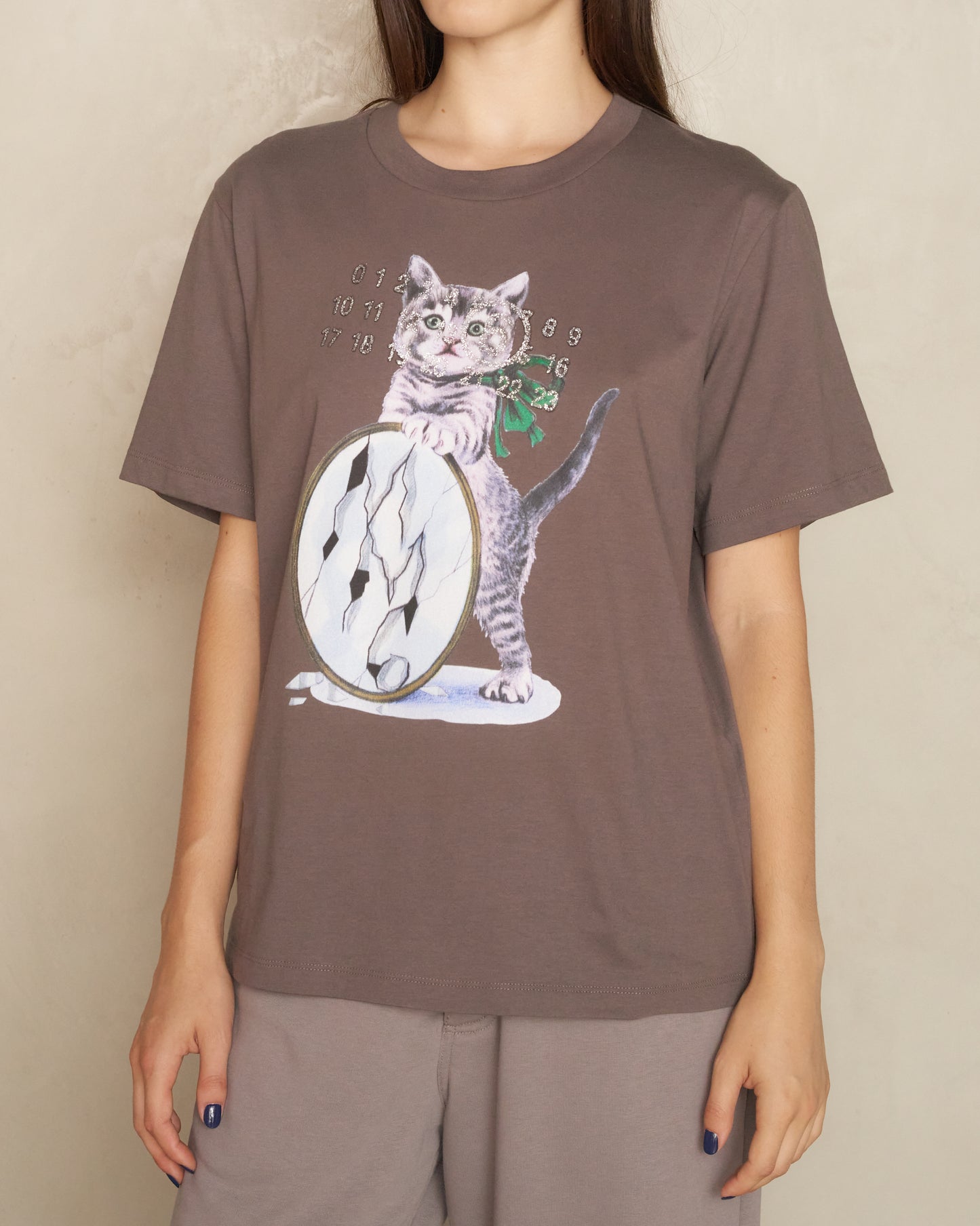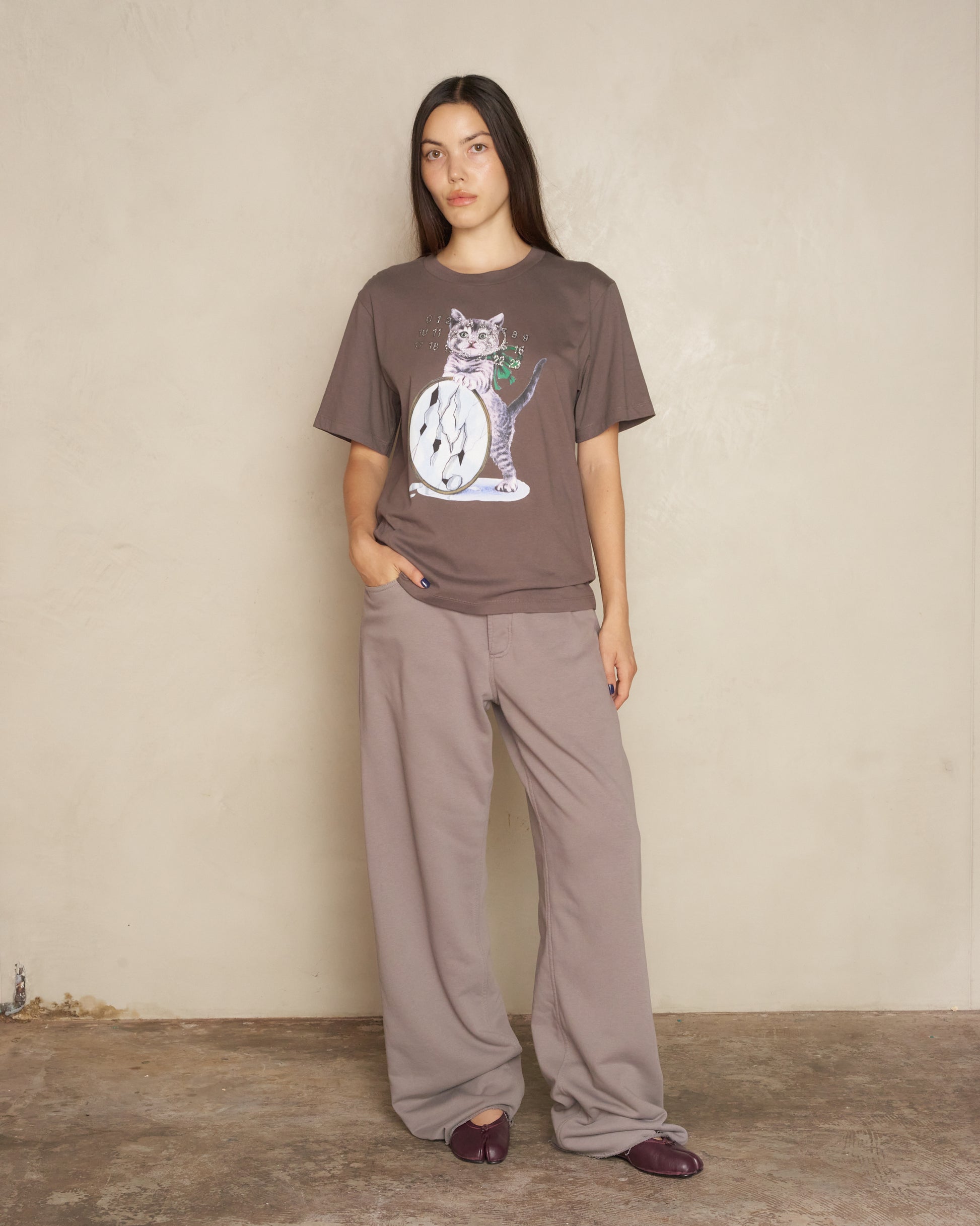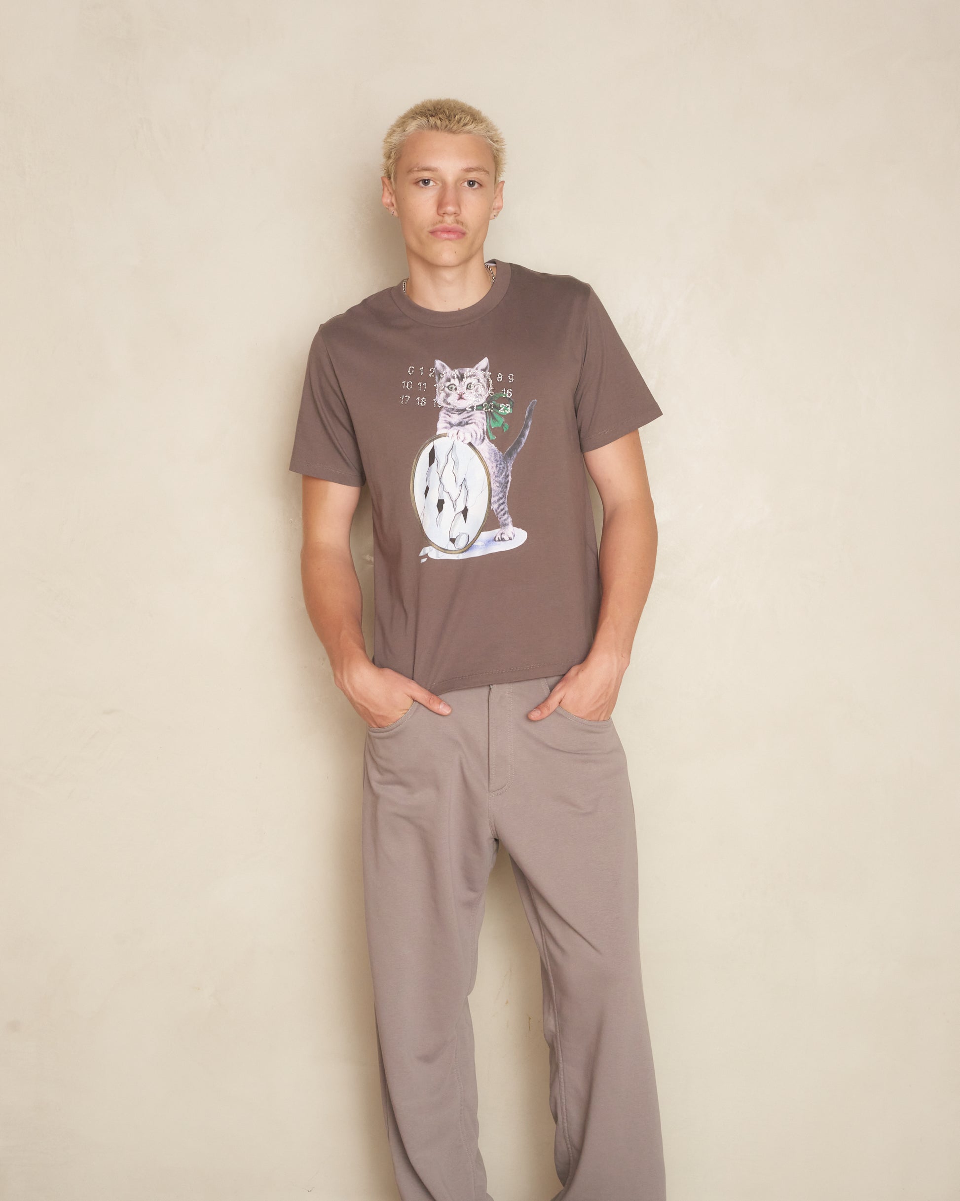 Cat T-shirt by MM6 Maison Margiela in taupe brown. Cropped cotton jersey tee with MM6's numerical logo traced in glitter, offset by a seasonal illustrated kitten motif. Playful luxury with signature white horizontal stitching at the rear.