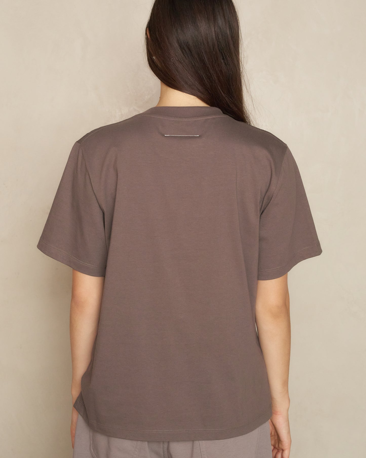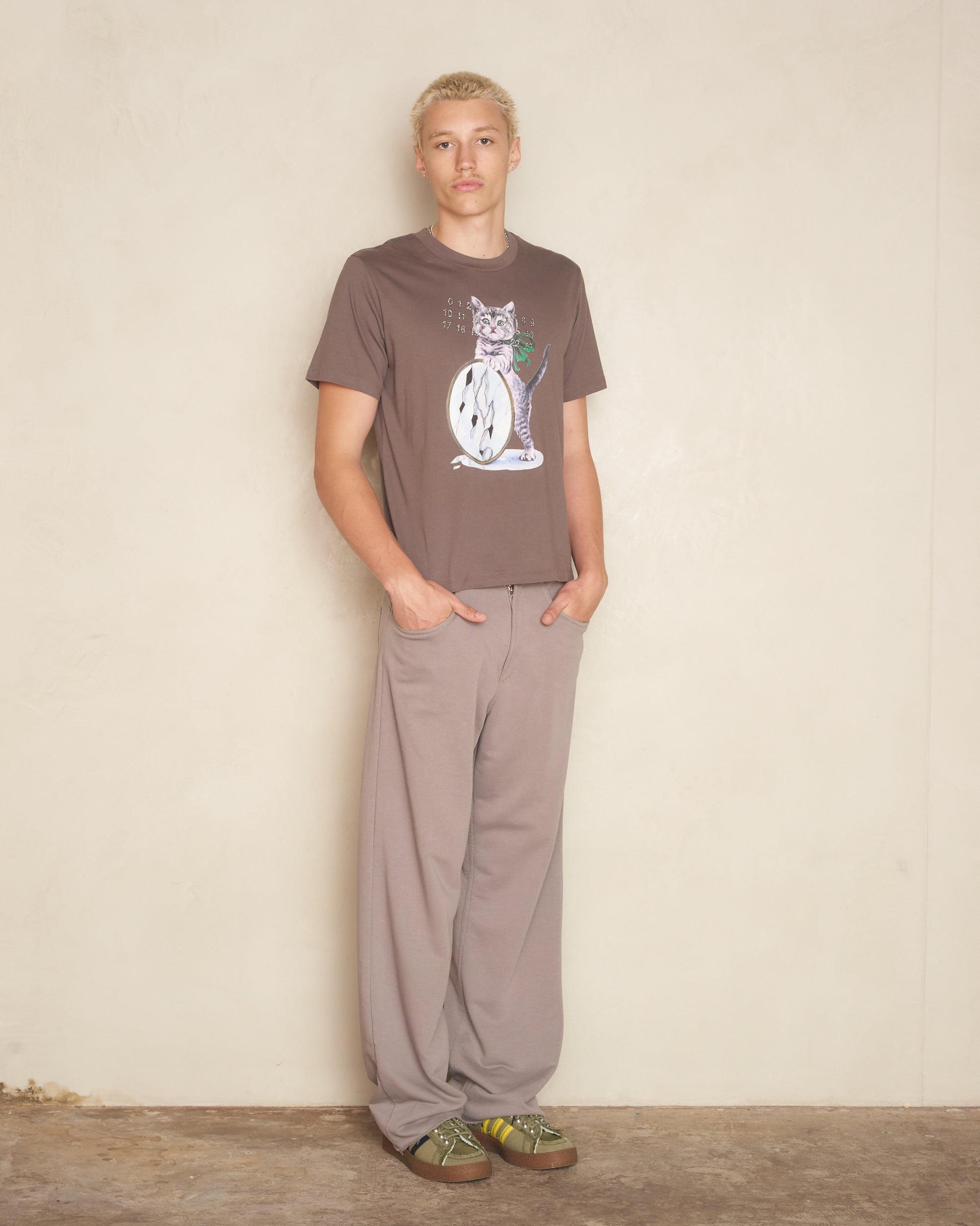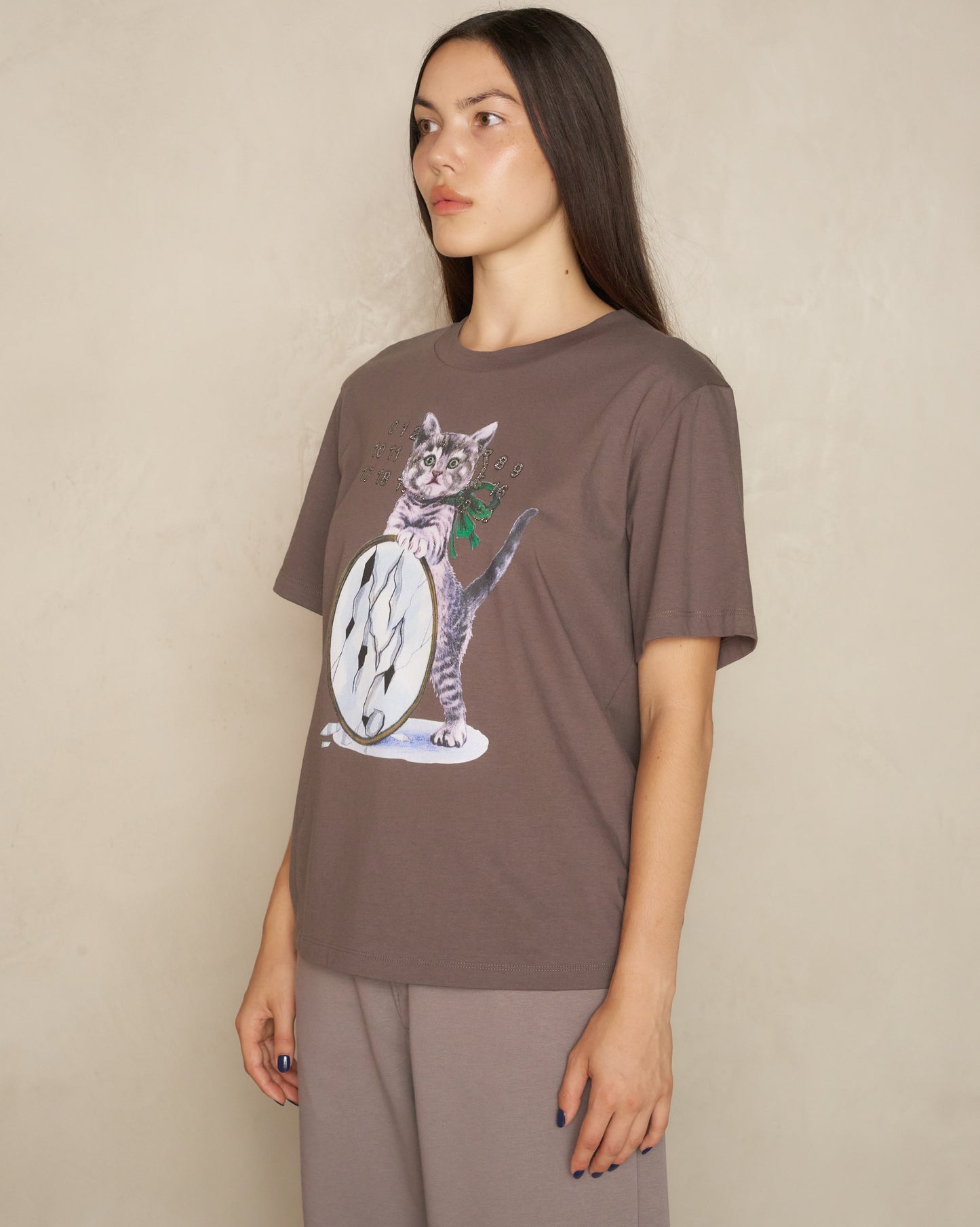 Cat T-shirt by MM6 Maison Margiela in taupe brown. Cropped cotton jersey tee with MM6's numerical logo traced in glitter, offset by a seasonal illustrated kitten motif. Playful luxury with signature white horizontal stitching at the rear.