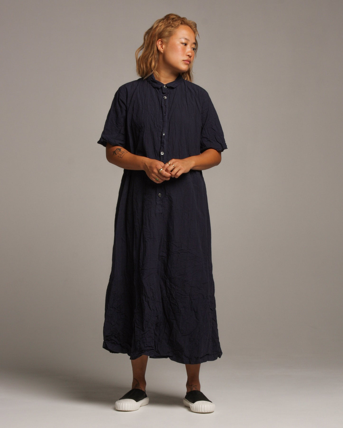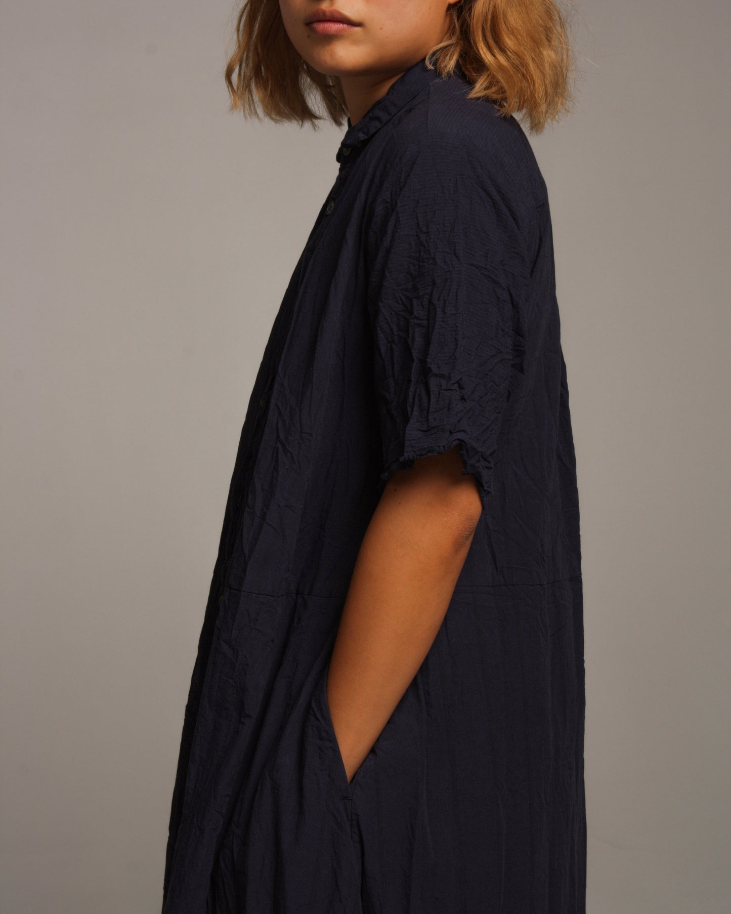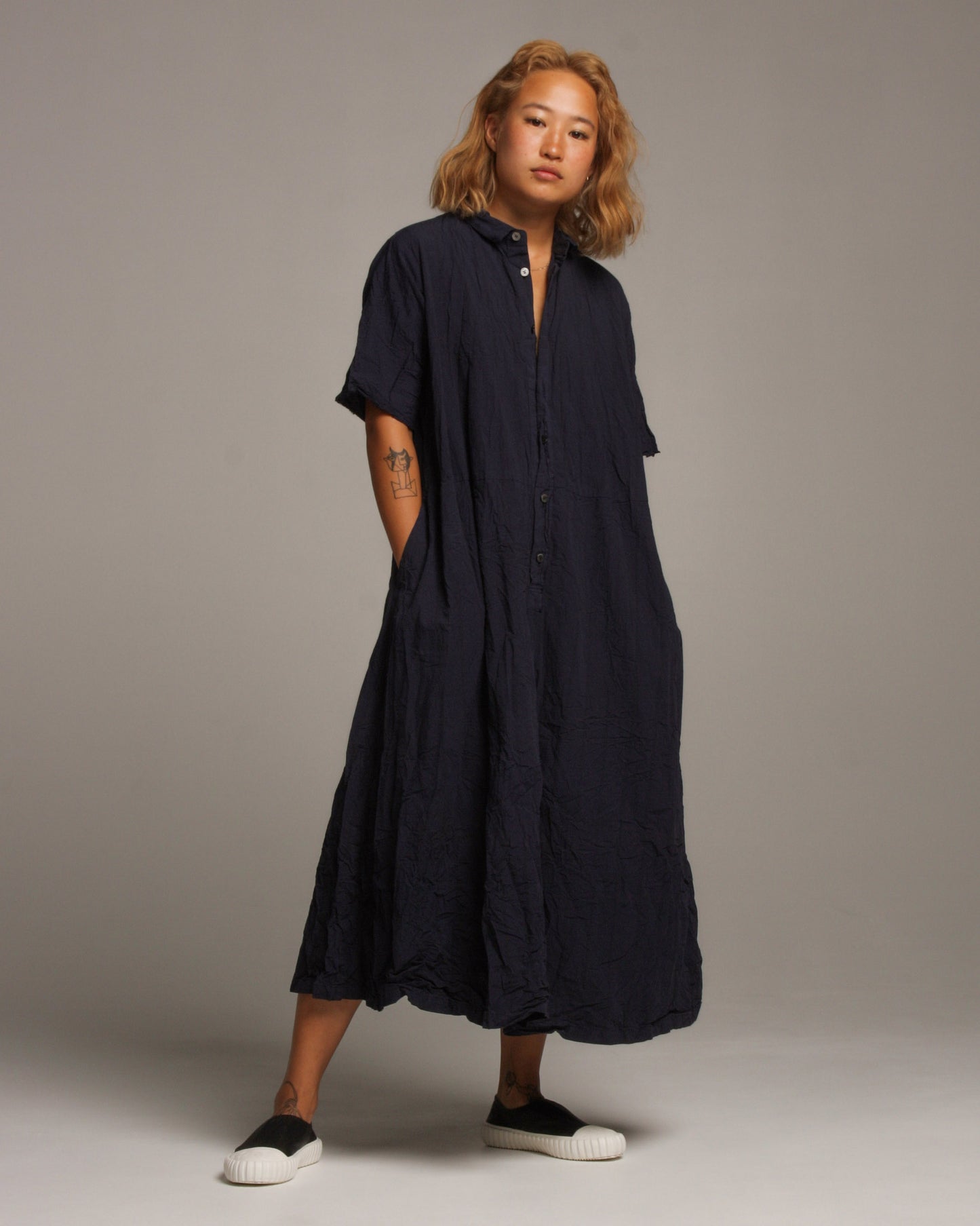 Linen shirtdress by Pas de Calais in navy. Short sleeved buttoned shirt dress with narrow pointed collar and gentle pinstripe patterning. Dropped waist opens out to a wider A-line hem with pockets at the side seams. Subtly detailed by raw-edge seams along the button placket and sleeve hems.