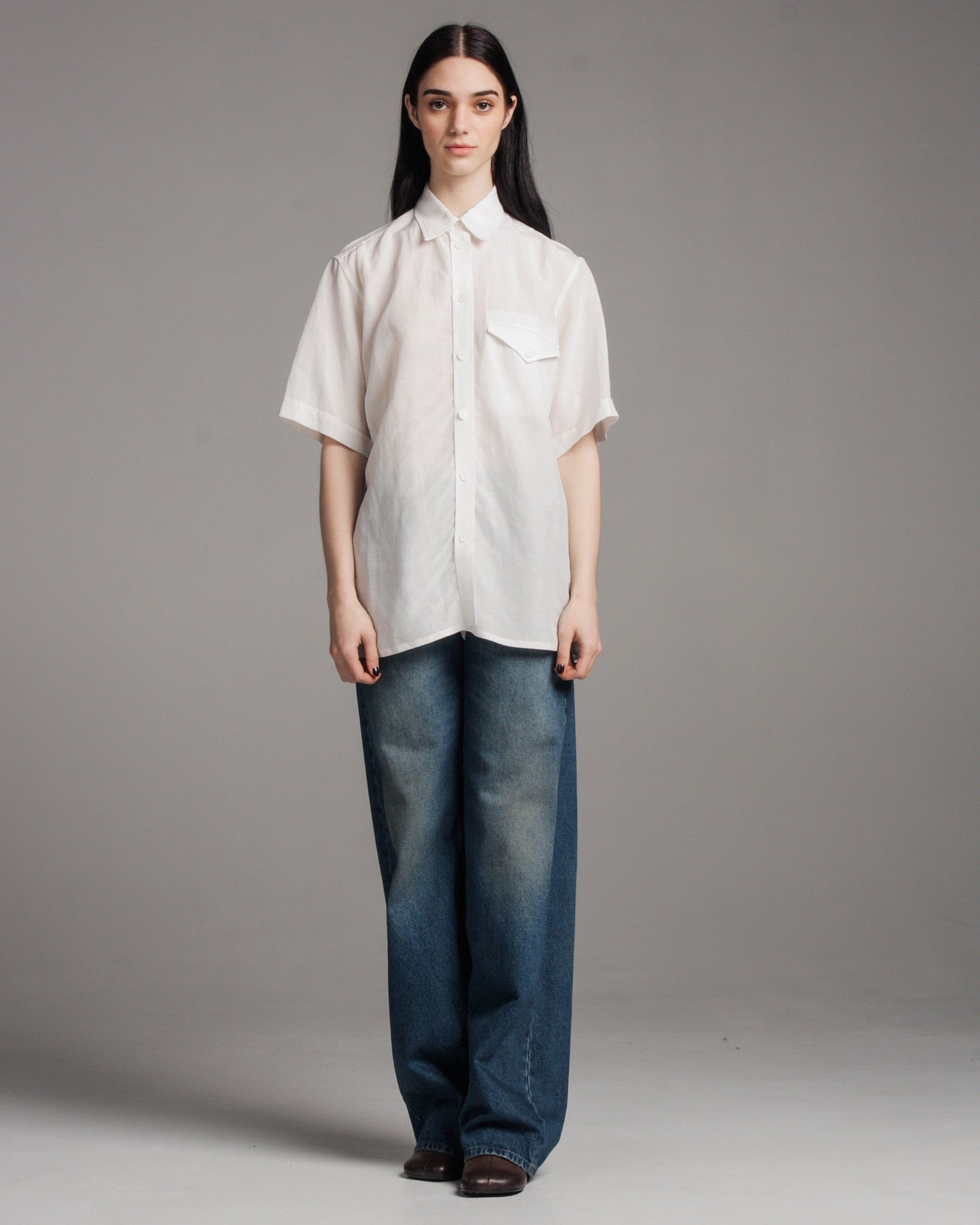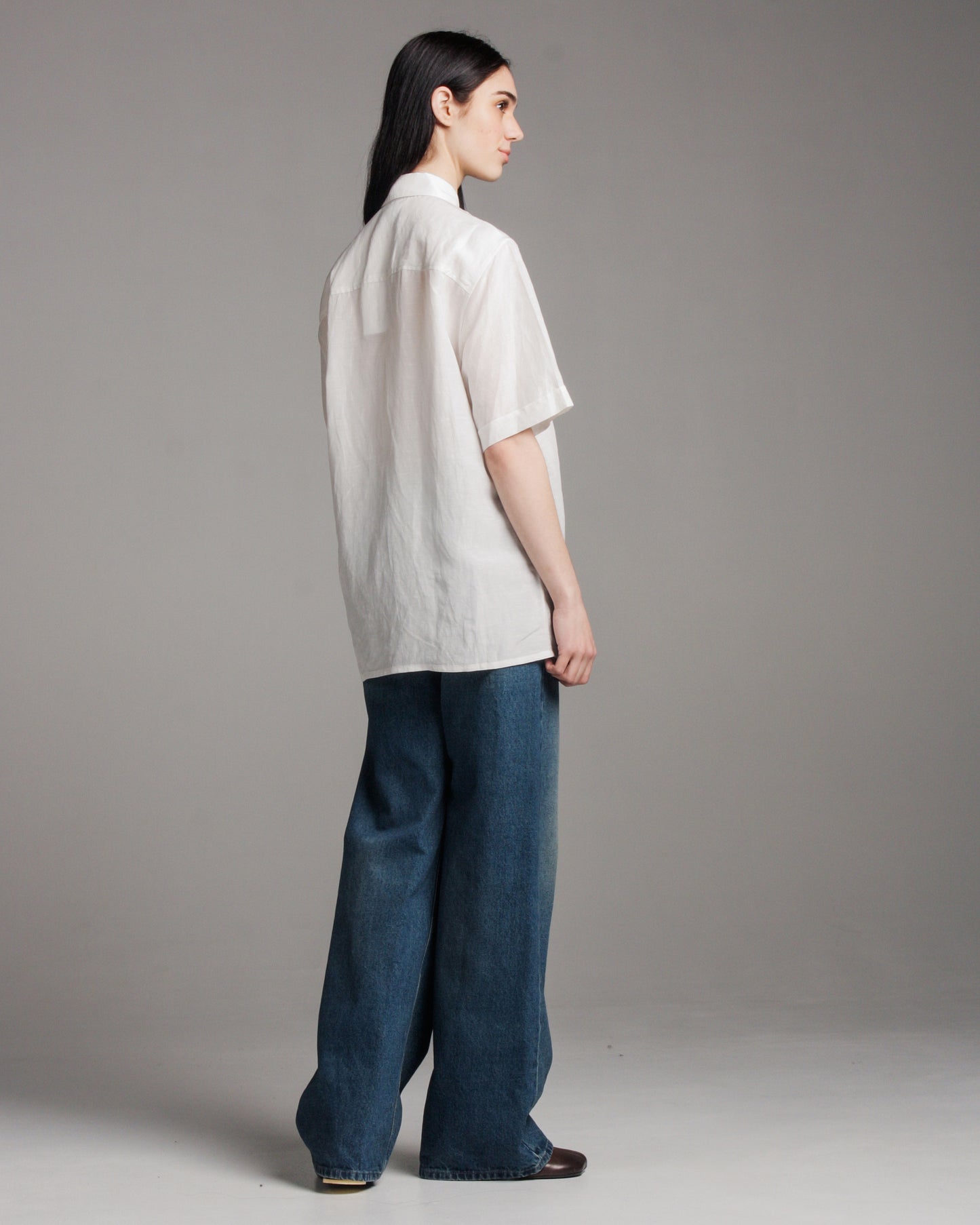 Taru shirt by Christian Wijnants. Relaxed fitting button up shirt with classic pointed collar. Viscose blend has a subtly lustrous sensuality with the tactility of linen. Unique welt pocket at the chest with button flap.