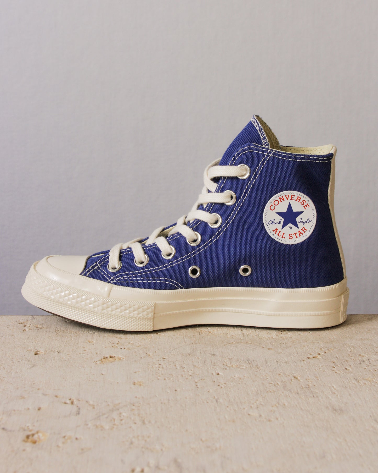 Unisex high top heart sneaker by Comme des Garçons PLAY x Converse in blue. The cult sneaker style, reinvented by the Japanese label's mischievous diffusion line. Constructed from a sturdy woven canvas upper and thick vulcanised rubber sole for durable daily wear, given personality in a cheerful bright blue with black heart peeking over the sole.