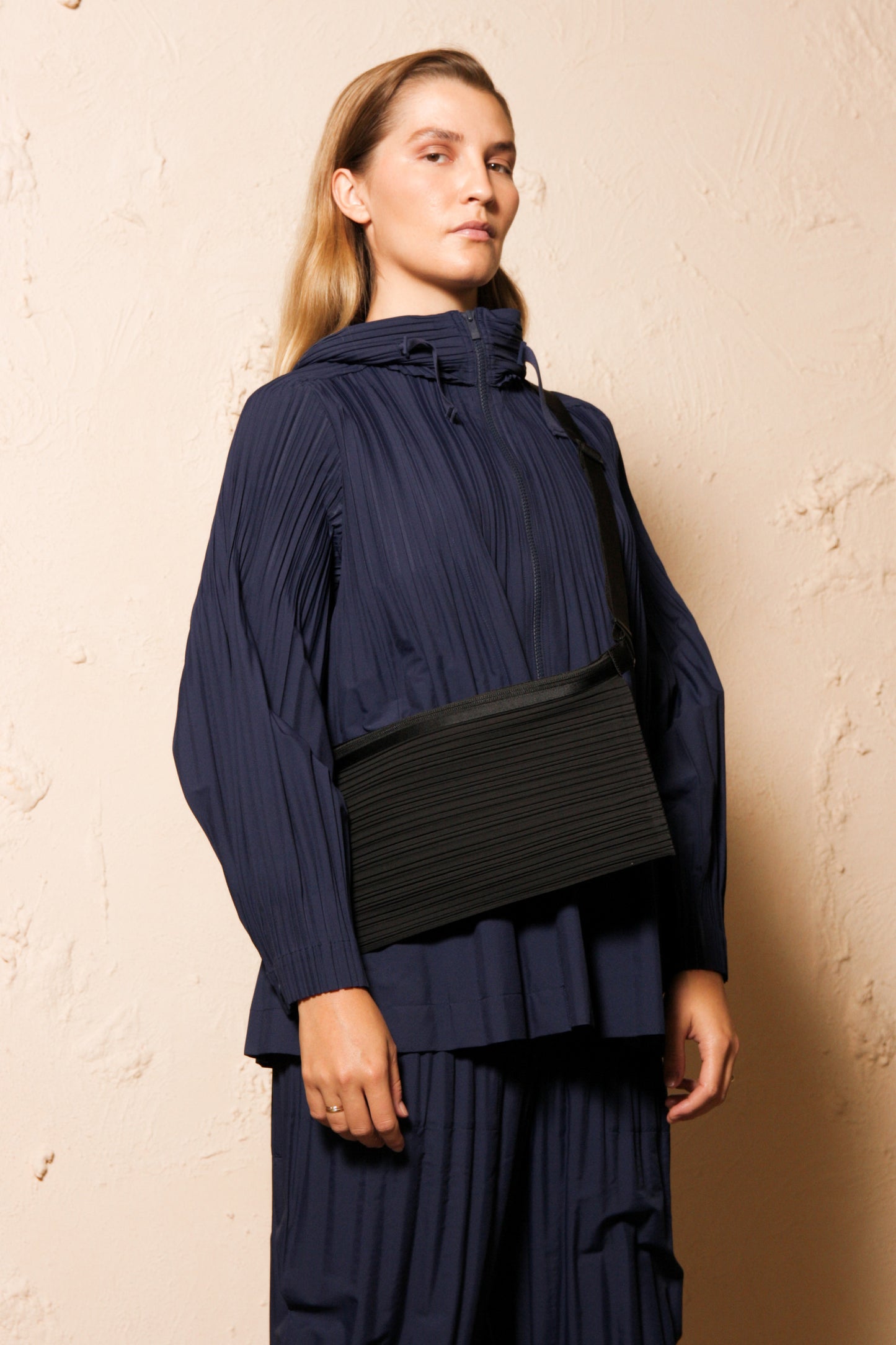 Navy pleated jacket by Pleats Please Issey Miyake in a softer wide pleat. Features a hood with drawstrings, zip closure, and two welt pockets.