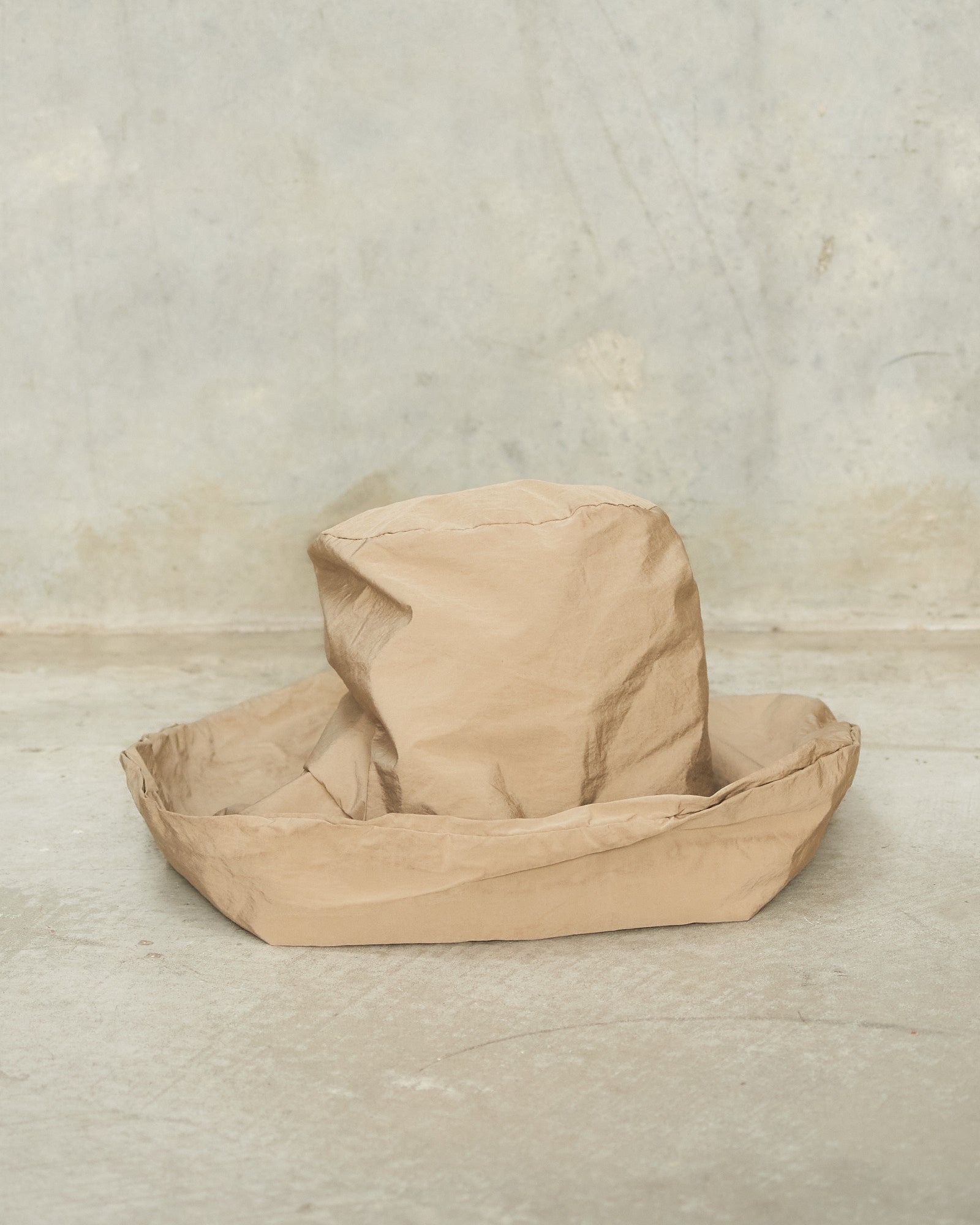 Bianca Scot hat by Reinhard Plank in beige. Malleable bucket hat with a large vented rear flap.