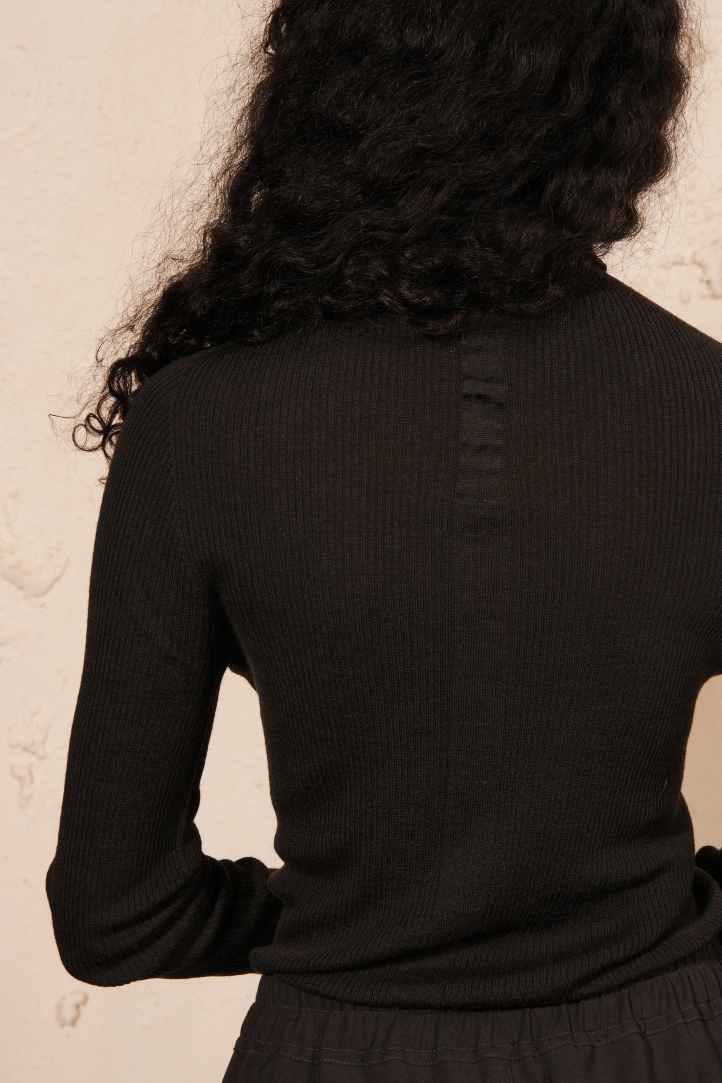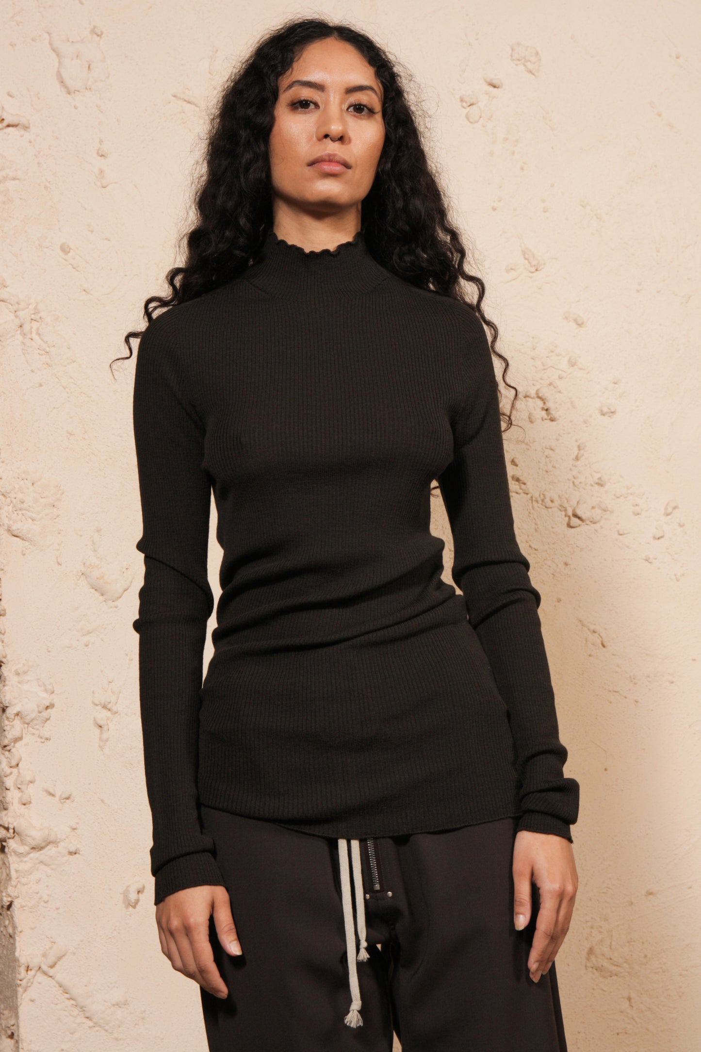 Soft Lupetto sweater with ribbed detailing by Rick Owens. Features raw hem turtle neck and long, elegant sleeves. The back has a linear stitch detail, creating length. A timeless wardrobe staple playing on Owen's downtempo aesthetic.