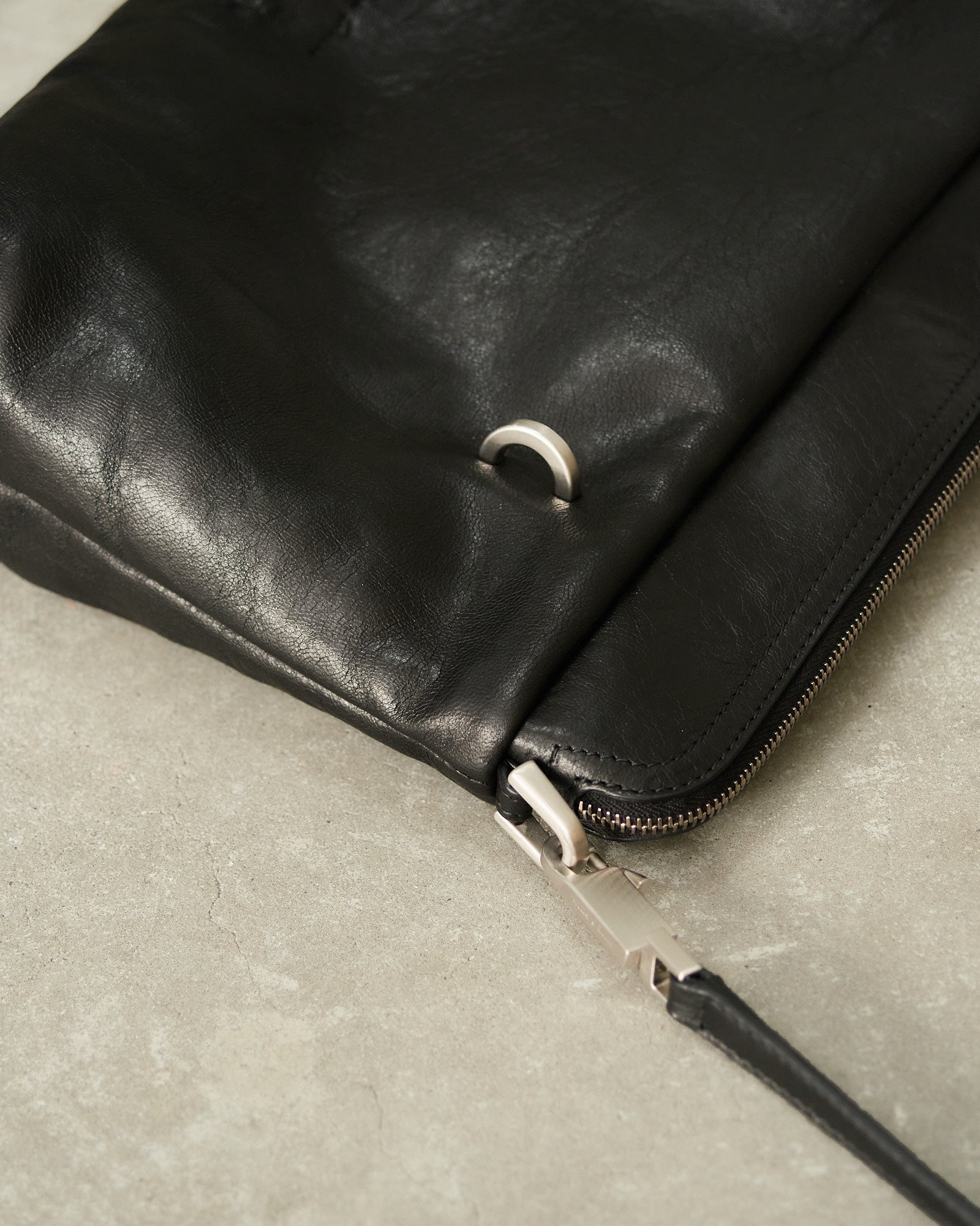 Adri leather bag by Rick Owens in black. Rectangular pouch crafted from subtly grained lamb leather with a long, adjustable leather strap. Features palladium tone brass D-ring details at the face and snap hooks.